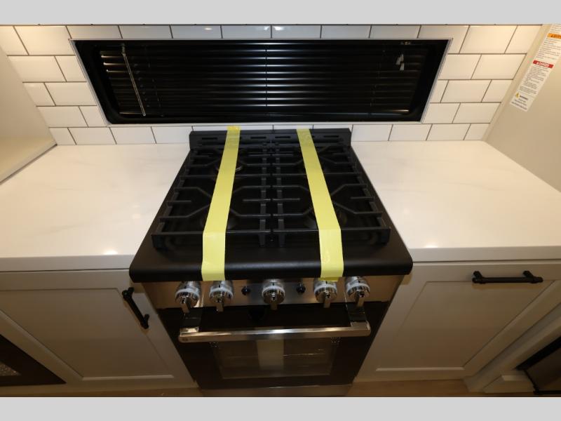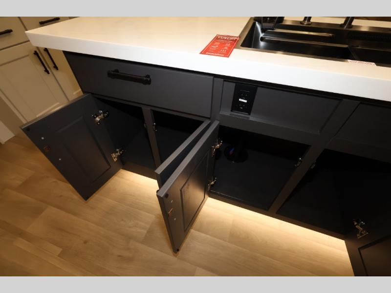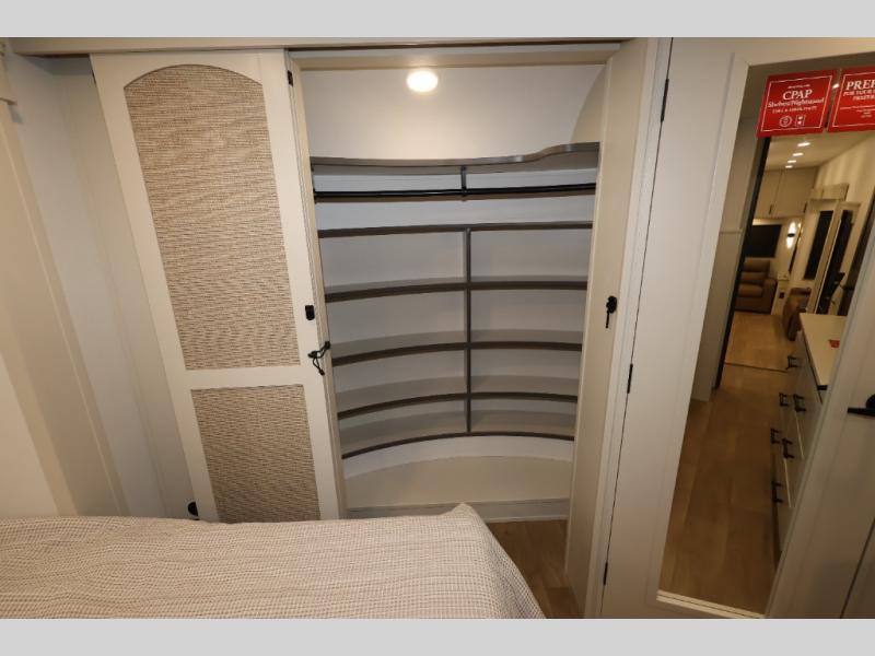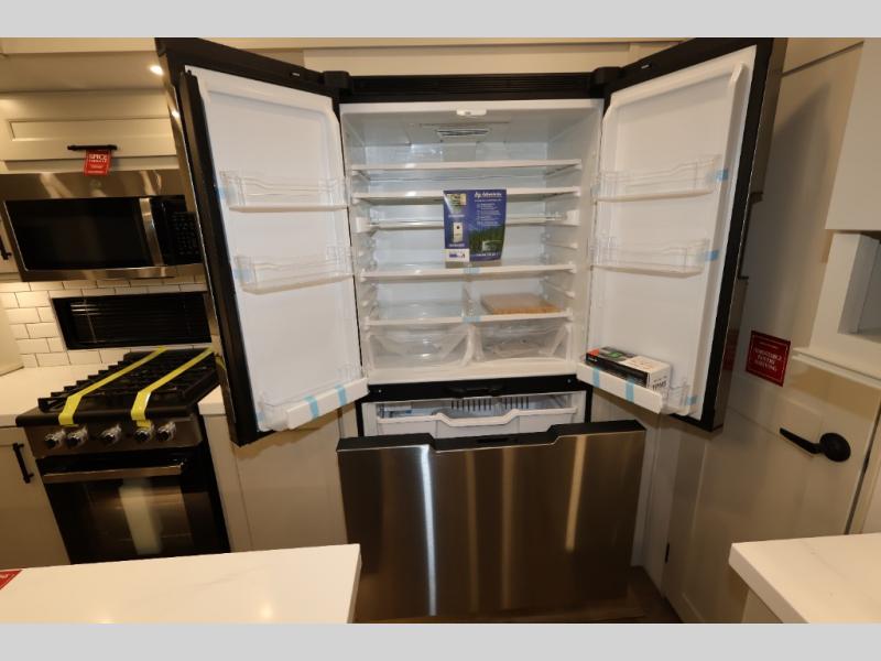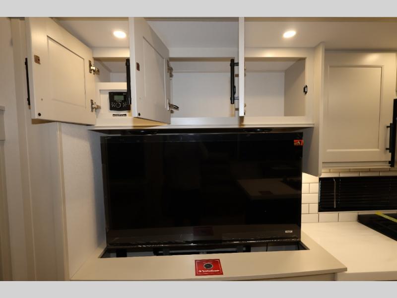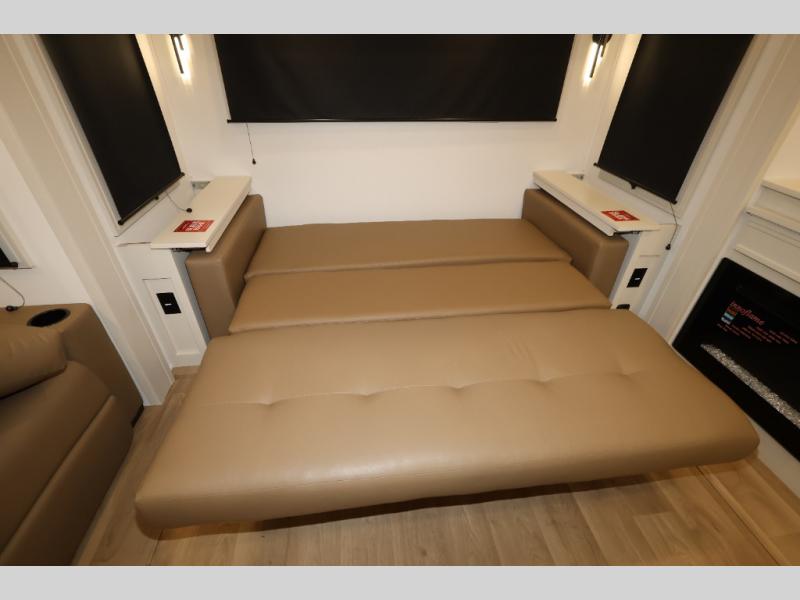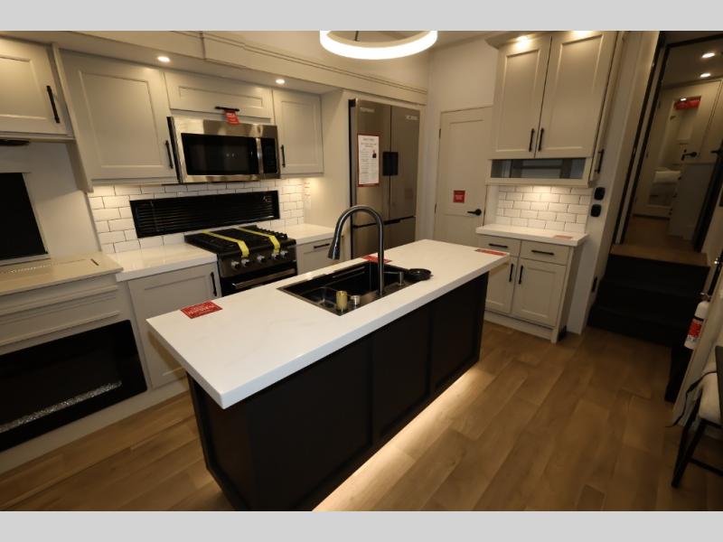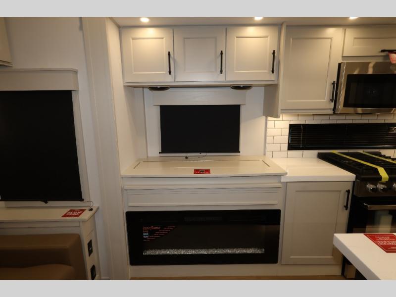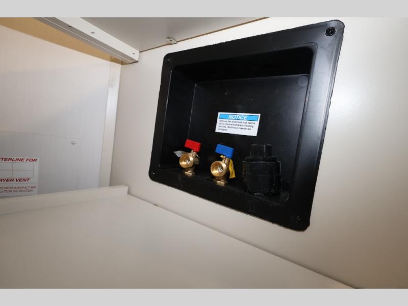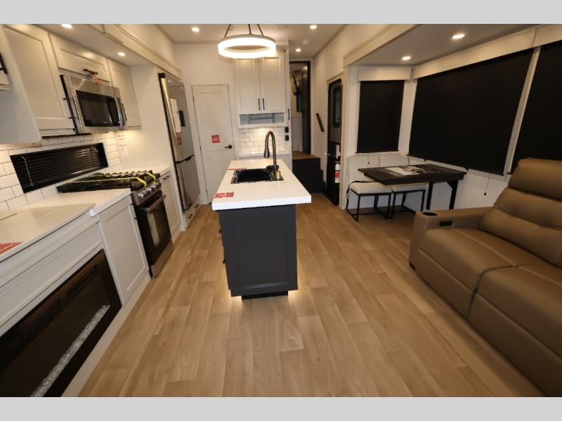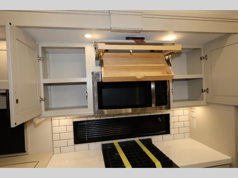 Traveling for long periods at a time is made easy with this gourmet kitchen that can feed your entire group a holiday meal! The professional-grade stainless steel cooktop with a built-in oven, microwave, 12V 20 cu. ft. refrigerator, and a kitchen island offers everything you will need to enjoy cooking for your family and guests. There is abundant storage throughout multiple overhead cabinets, a kitchen pantry and hutch, a bath linen cabinet for your towels, and in the front master bedroom which features a large closet. In the bedroom there is also a queen bed slide for added space to sleep comfortable at night, or you may choose an optional king bed if you enjoy more space. You will also find a closet with washer/dryer prep, large wardrobe, a clothes hamper plus a slide top dresser. Two nice awnings will provide outdoor living space keeping you protected from the sun and rain, and you can add an optional pull-out kitchen to enjoy convenient cooking outdoors as well.