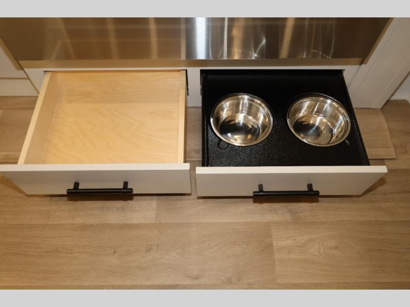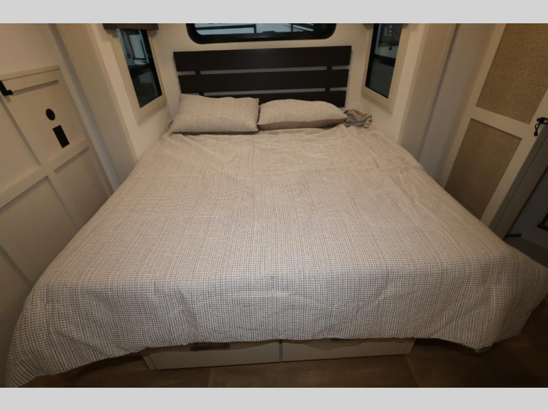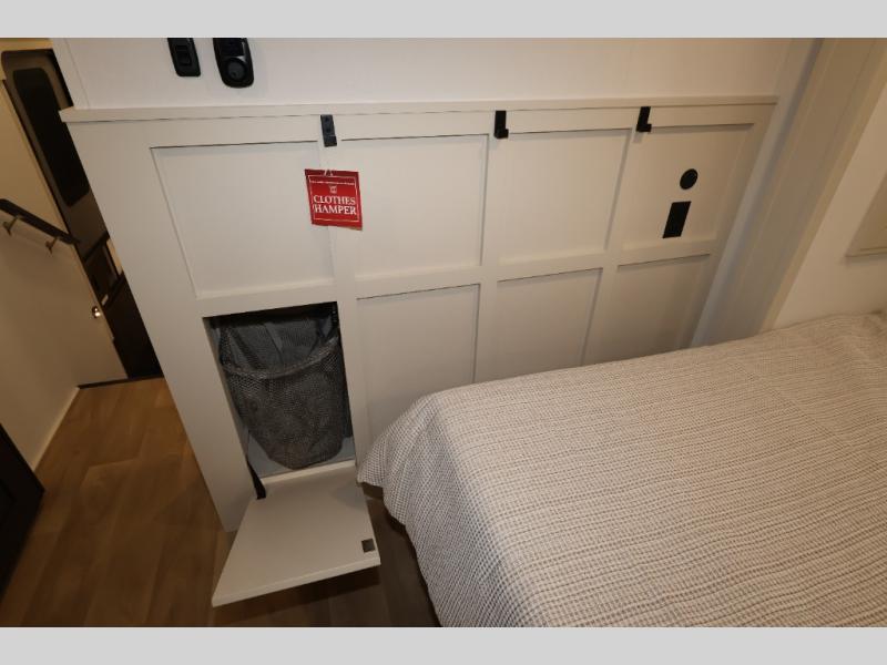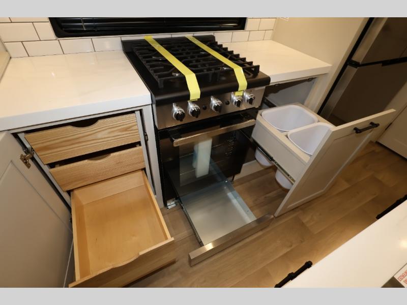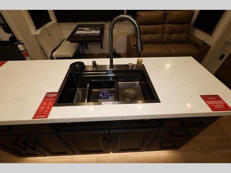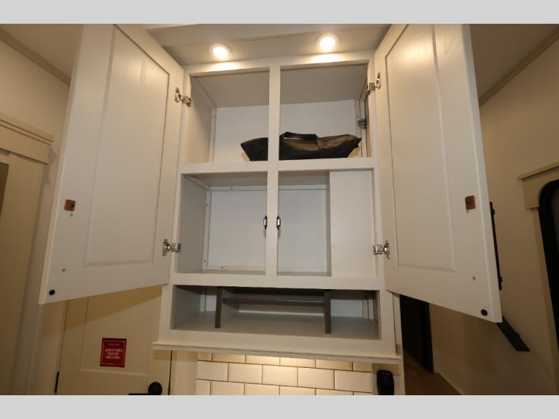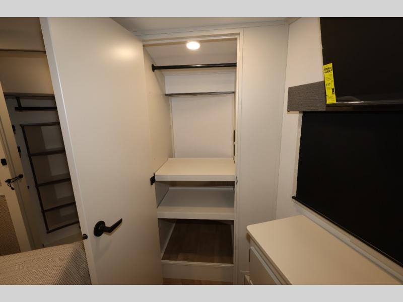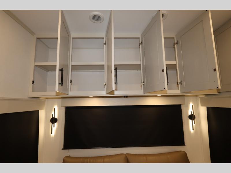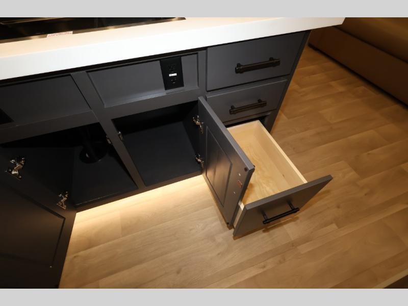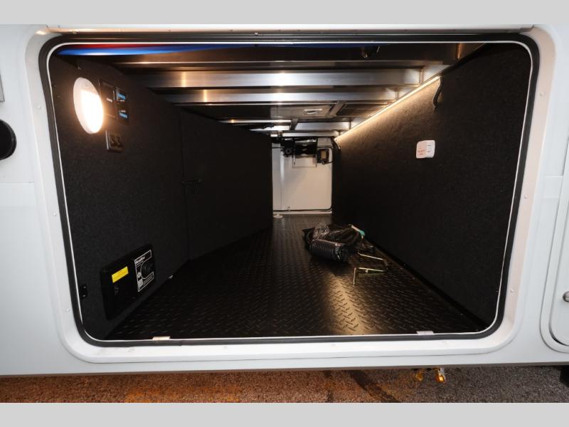 Traveling for long periods at a time is made easy with this gourmet kitchen that can feed your entire group a holiday meal! The professional-grade stainless steel cooktop with a built-in oven, microwave, 12V 20 cu. ft. refrigerator, and a kitchen island offers everything you will need to enjoy cooking for your family and guests. There is abundant storage throughout multiple overhead cabinets, a kitchen pantry and hutch, a bath linen cabinet for your towels, and in the front master bedroom which features a large closet. In the bedroom there is also a queen bed slide for added space to sleep comfortable at night, or you may choose an optional king bed if you enjoy more space. You will also find a closet with washer/dryer prep, large wardrobe, a clothes hamper plus a slide top dresser. Two nice awnings will provide outdoor living space keeping you protected from the sun and rain, and you can add an optional pull-out kitchen to enjoy convenient cooking outdoors as well.