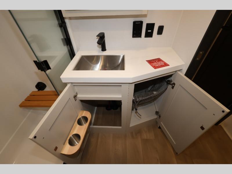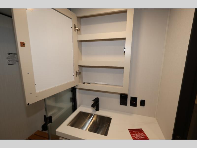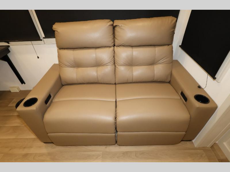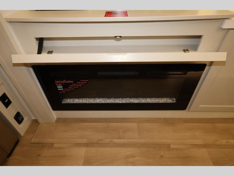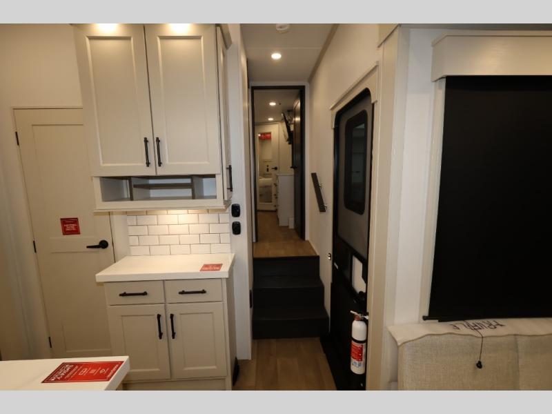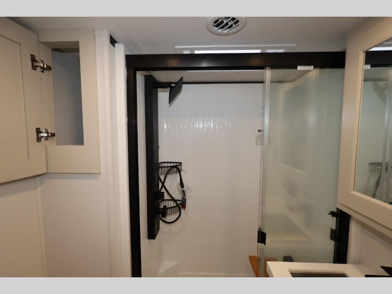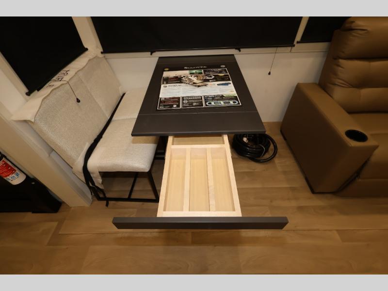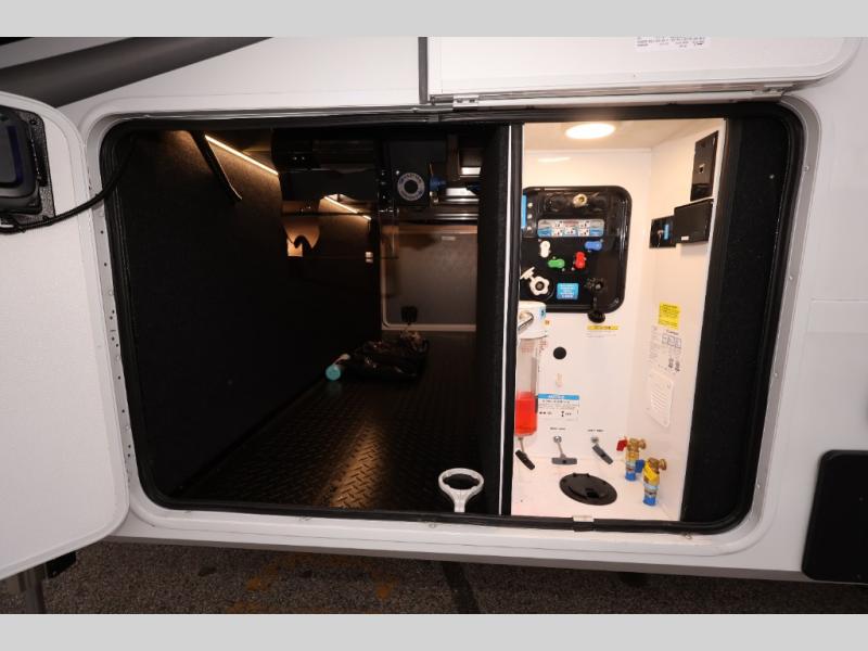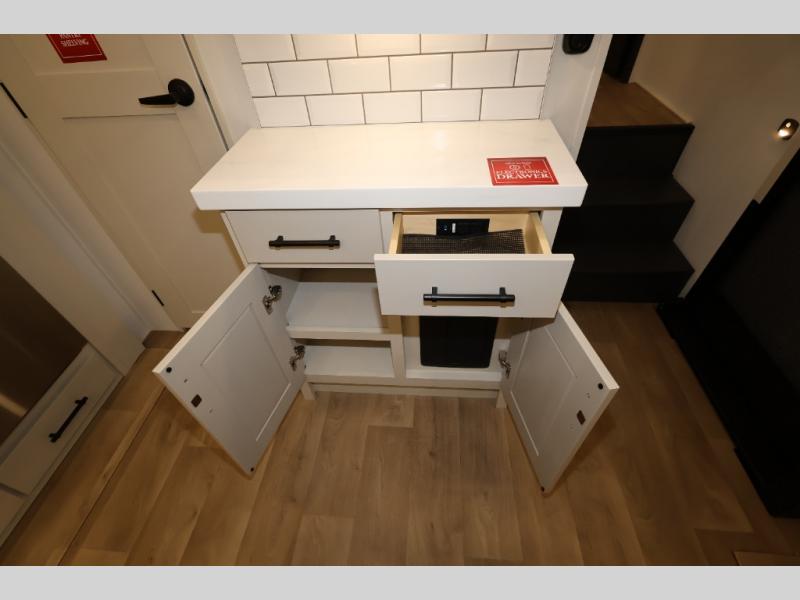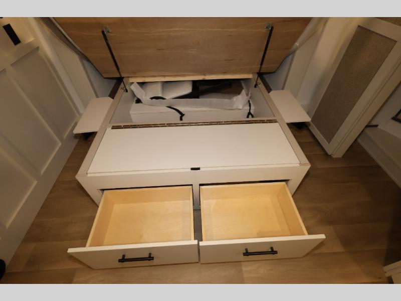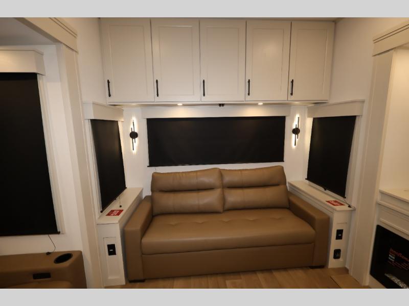Traveling for long periods at a time is made easy with this gourmet kitchen that can feed your entire group a holiday meal! The professional-grade stainless steel cooktop with a built-in oven, microwave, 12V 20 cu. ft. refrigerator, and a kitchen island offers everything you will need to enjoy cooking for your family and guests. There is abundant storage throughout multiple overhead cabinets, a kitchen pantry and hutch, a bath linen cabinet for your towels, and in the front master bedroom which features a large closet. In the bedroom there is also a queen bed slide for added space to sleep comfortable at night, or you may choose an optional king bed if you enjoy more space. You will also find a closet with washer/dryer prep, large wardrobe, a clothes hamper plus a slide top dresser. Two nice awnings will provide outdoor living space keeping you protected from the sun and rain, and you can add an optional pull-out kitchen to enjoy convenient cooking outdoors as well.