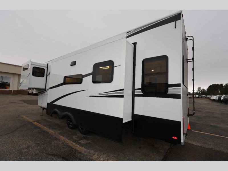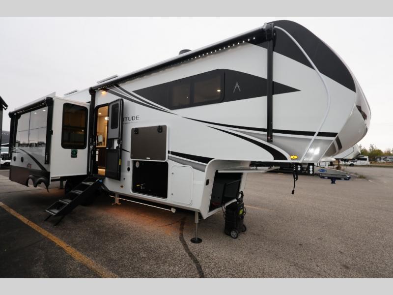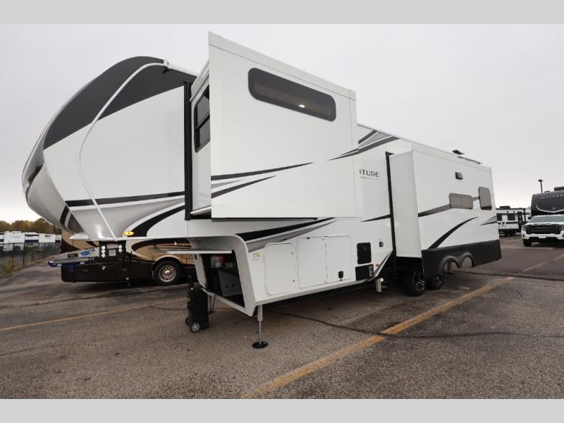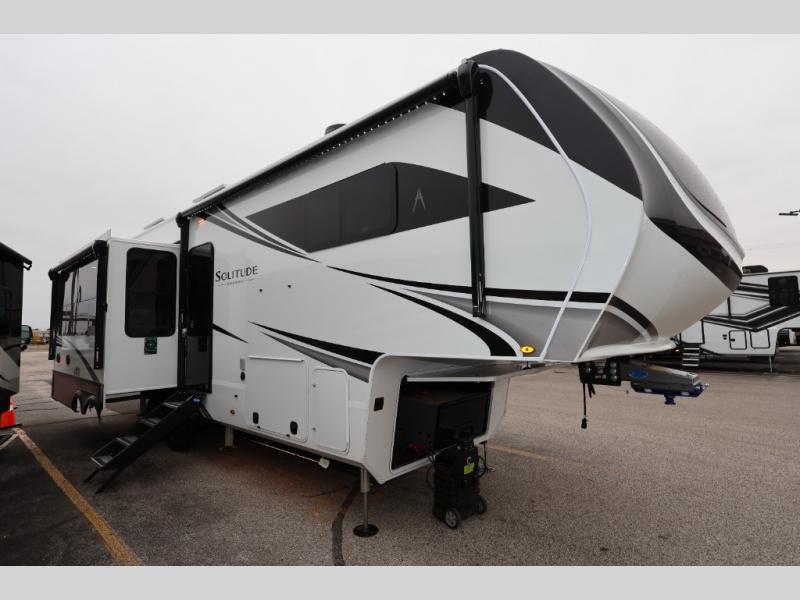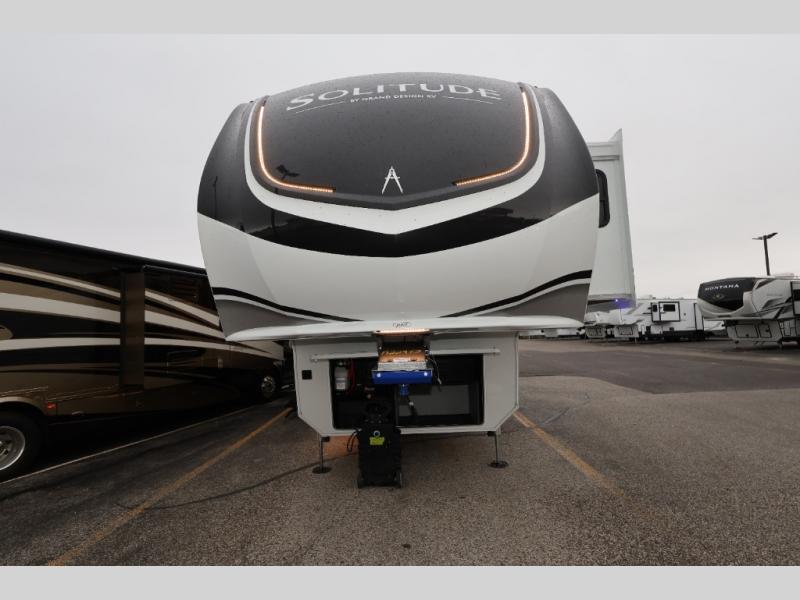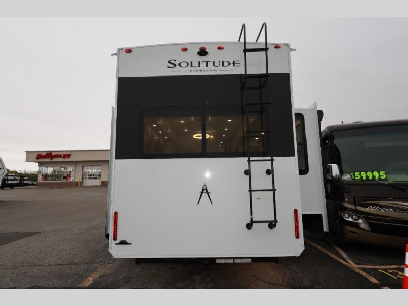 Each Solitude fifth wheel by Grand Design features a 101" wide-body construction, heavy duty 8,000 lb. axles, frameless tinted windows, and high-gloss gel coat sidewalls. You can camp year around thanks to the Weather-Tek Package that includes a 35K BTU high-capacity furnace, an all-in-one enclosed and heated utility center, and a fully enclosed underbelly with heated tanks and storage. Inside, you'll love the premium roller shades, hardwood cabinet doors, solid surface countertops, plus residential finishes throughout to make you truly feel at home. Each model also includes a MORryde CRE3000 suspension system, self adjusting brakes, and a MORryde pin box that will provide smooth towing from home to campground. Affordable luxury is possible with the Solitude fifth wheels; choose yours today!