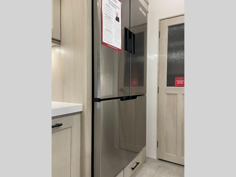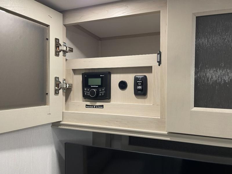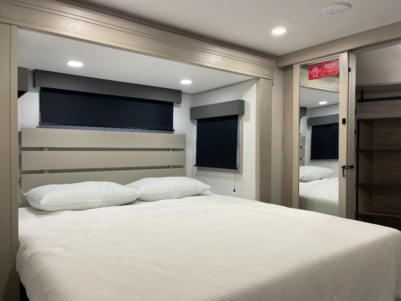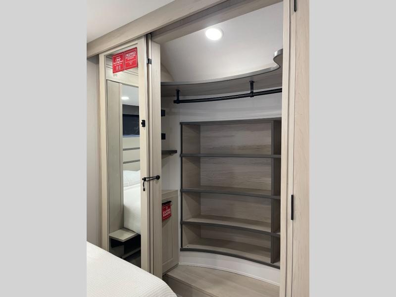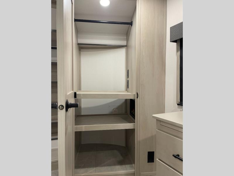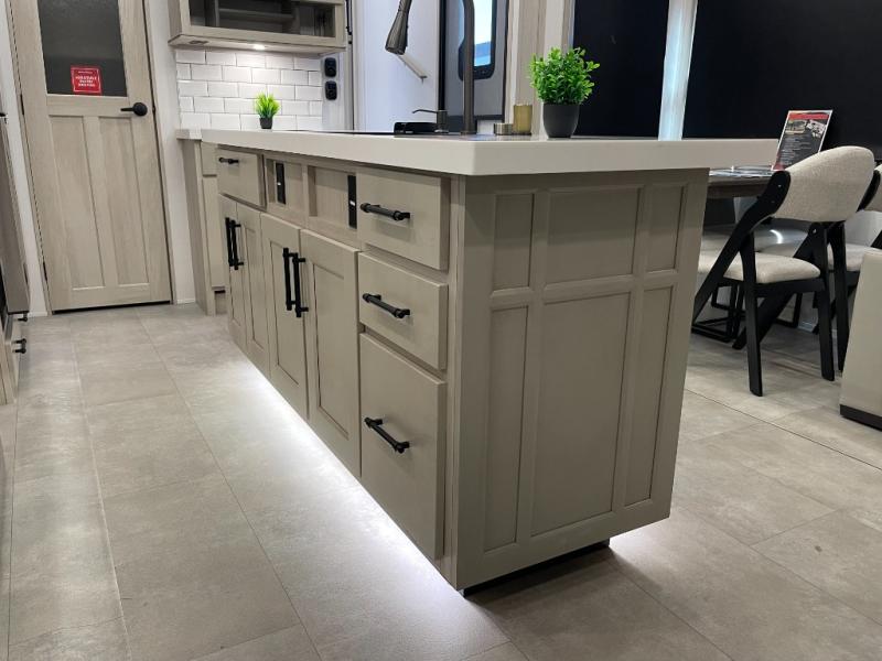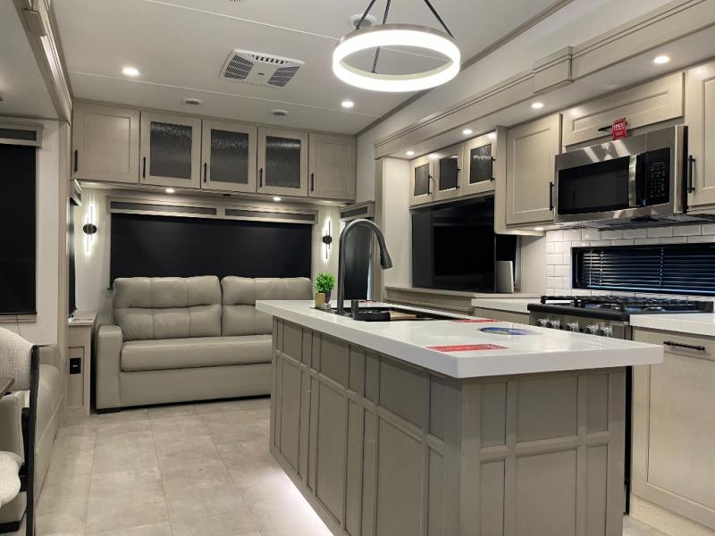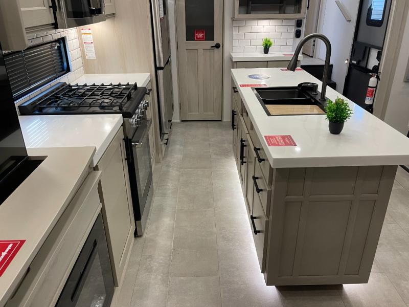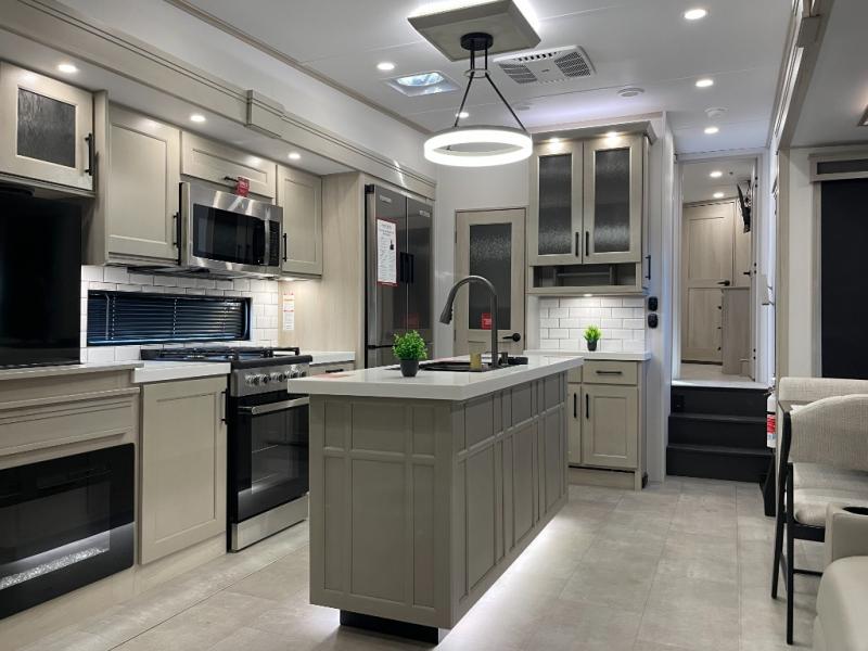 Traveling for long periods at a time is made easy with this gourmet kitchen that can feed your entire group a holiday meal! The professional-grade stainless steel cooktop with a built-in oven, microwave, 12V 20 cu. ft. refrigerator, and a kitchen island offers everything you will need to enjoy cooking for your family and guests. There is abundant storage throughout multiple overhead cabinets, a kitchen pantry and hutch, a bath linen cabinet for your towels, and in the front master bedroom which features a large closet. In the bedroom there is also a queen bed slide for added space to sleep comfortable at night, or you may choose an optional king bed if you enjoy more space. You will also find a closet with washer/dryer prep, large wardrobe, a clothes hamper plus a slide top dresser. Two nice awnings will provide outdoor living space keeping you protected from the sun and rain, and you can add an optional pull-out kitchen to enjoy convenient cooking outdoors as well.