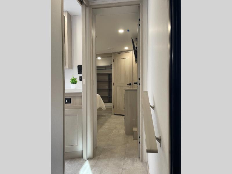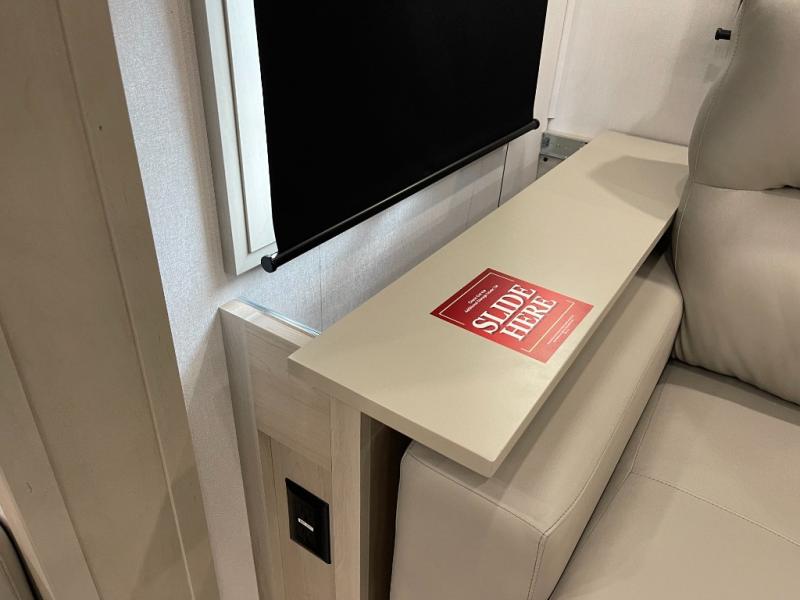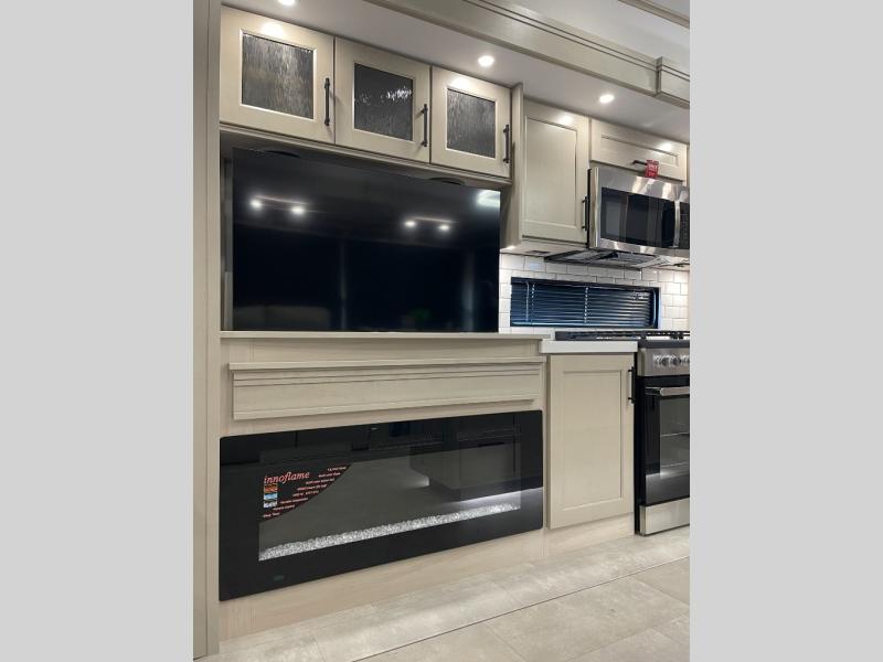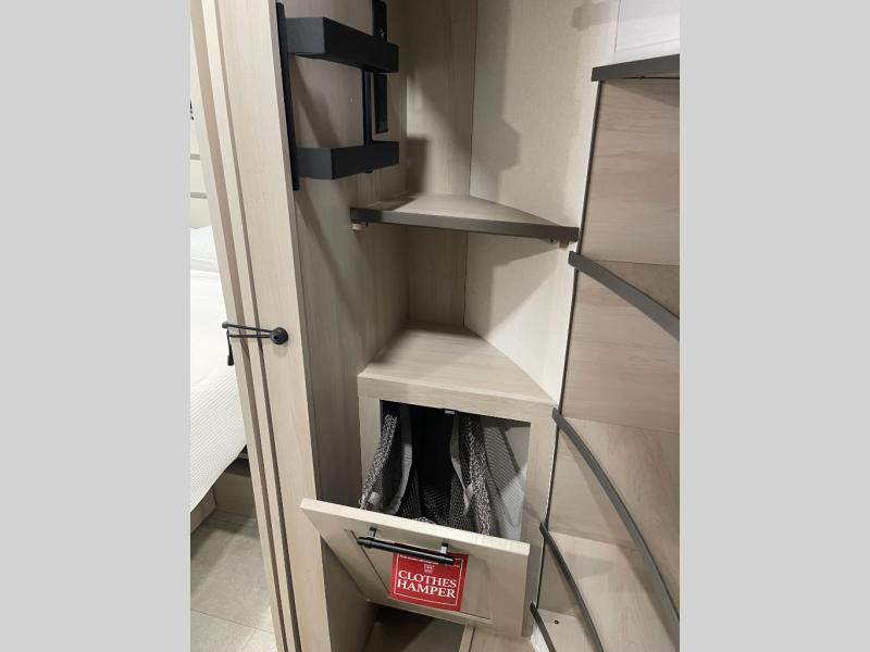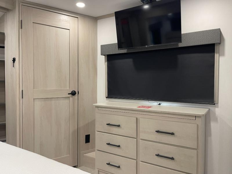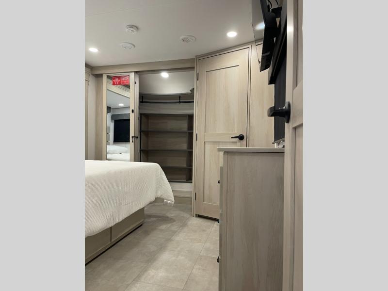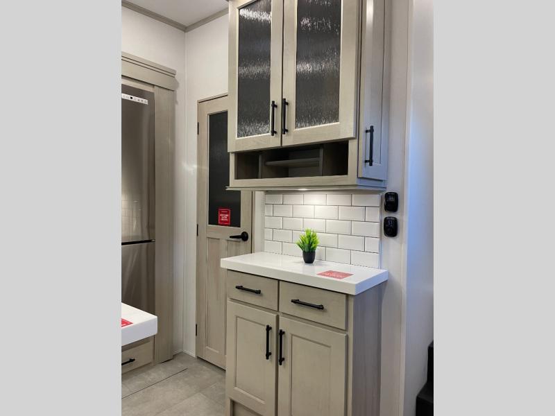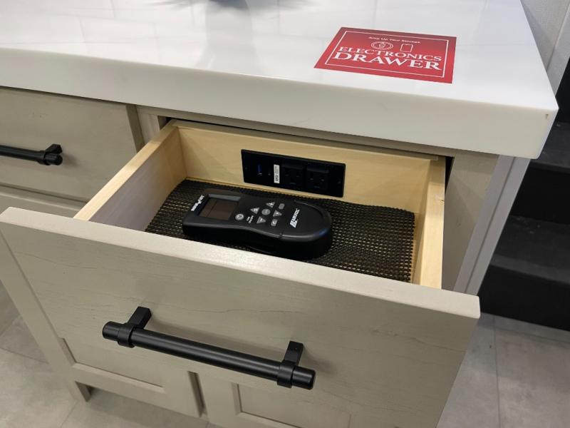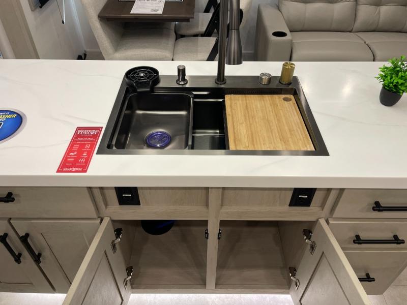 Traveling for long periods at a time is made easy with this gourmet kitchen that can feed your entire group a holiday meal! The professional-grade stainless steel cooktop with a built-in oven, microwave, 12V 20 cu. ft. refrigerator, and a kitchen island offers everything you will need to enjoy cooking for your family and guests. There is abundant storage throughout multiple overhead cabinets, a kitchen pantry and hutch, a bath linen cabinet for your towels, and in the front master bedroom which features a large closet. In the bedroom there is also a queen bed slide for added space to sleep comfortable at night, or you may choose an optional king bed if you enjoy more space. You will also find a closet with washer/dryer prep, large wardrobe, a clothes hamper plus a slide top dresser. Two nice awnings will provide outdoor living space keeping you protected from the sun and rain, and you can add an optional pull-out kitchen to enjoy convenient cooking outdoors as well.