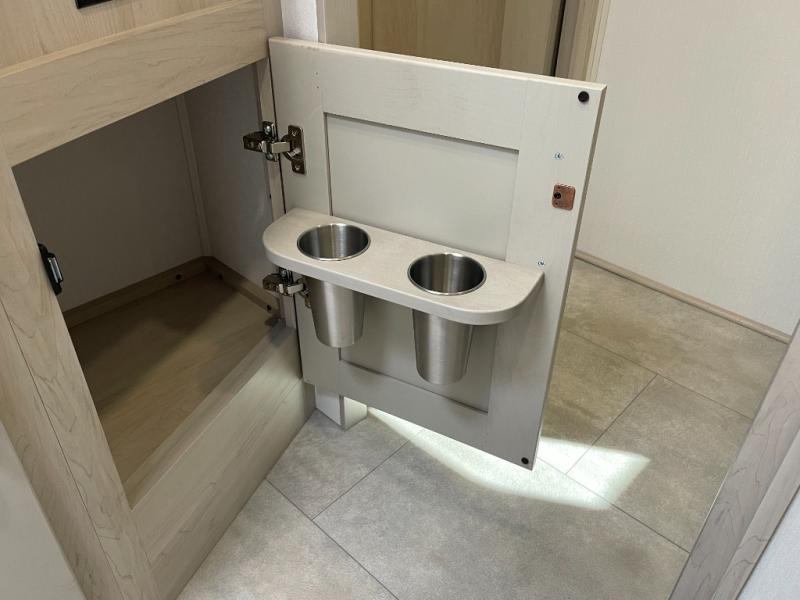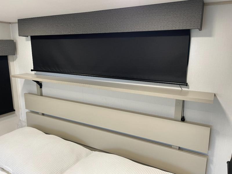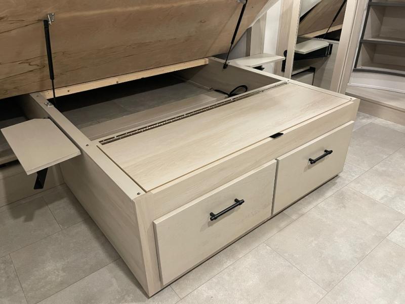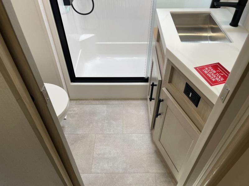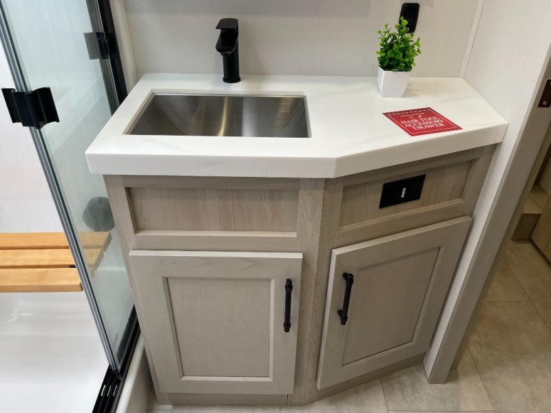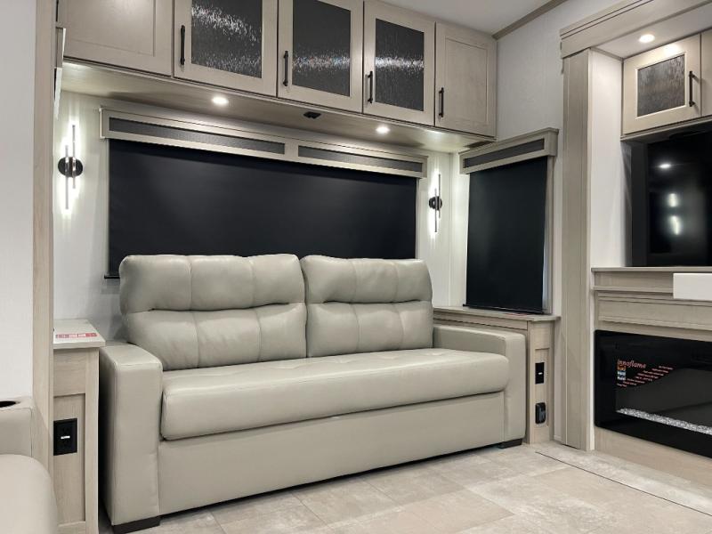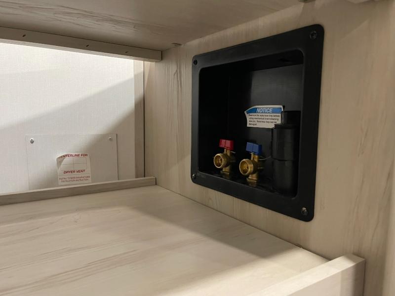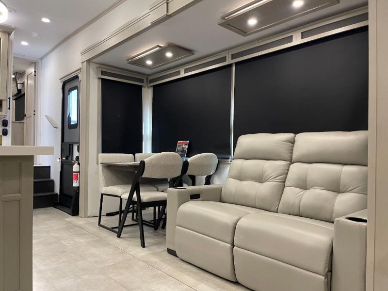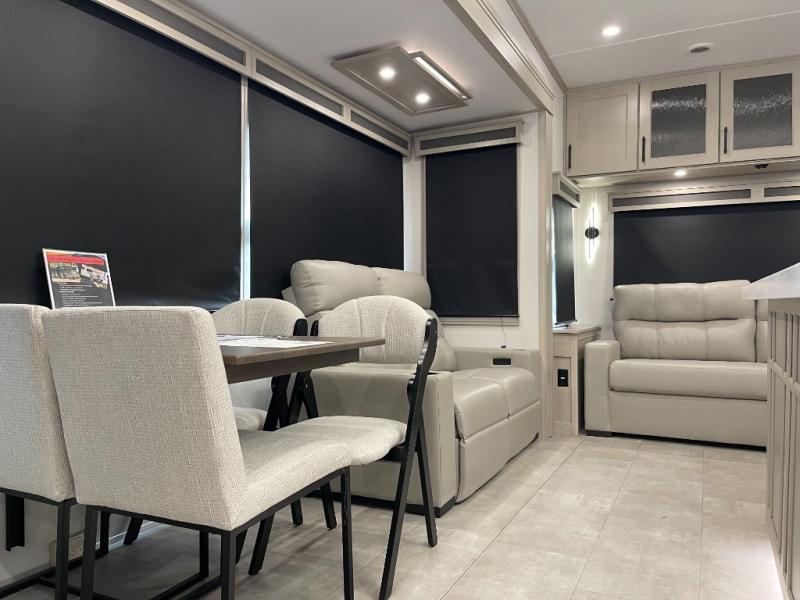Traveling for long periods at a time is made easy with this gourmet kitchen that can feed your entire group a holiday meal! The professional-grade stainless steel cooktop with a built-in oven, microwave, 12V 20 cu. ft. refrigerator, and a kitchen island offers everything you will need to enjoy cooking for your family and guests. There is abundant storage throughout multiple overhead cabinets, a kitchen pantry and hutch, a bath linen cabinet for your towels, and in the front master bedroom which features a large closet. In the bedroom there is also a queen bed slide for added space to sleep comfortable at night, or you may choose an optional king bed if you enjoy more space. You will also find a closet with washer/dryer prep, large wardrobe, a clothes hamper plus a slide top dresser. Two nice awnings will provide outdoor living space keeping you protected from the sun and rain, and you can add an optional pull-out kitchen to enjoy convenient cooking outdoors as well.