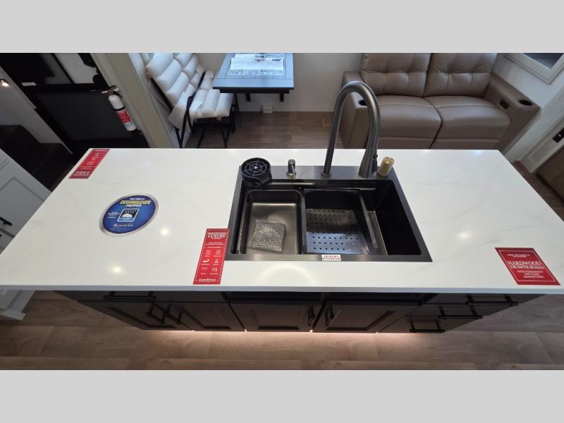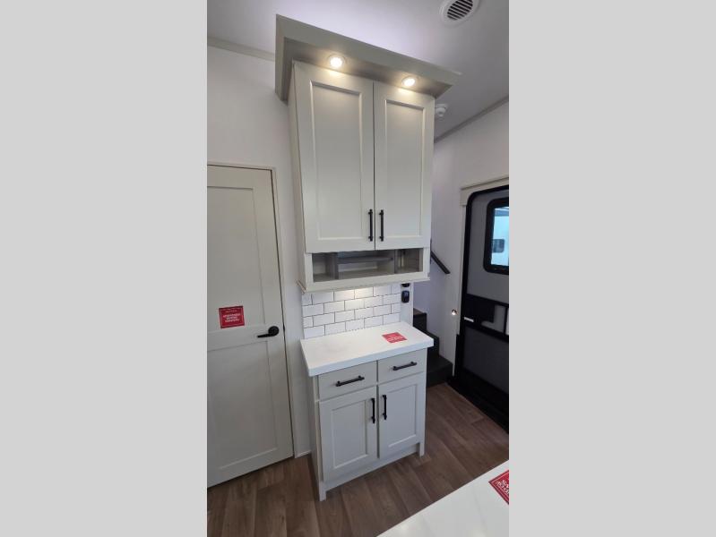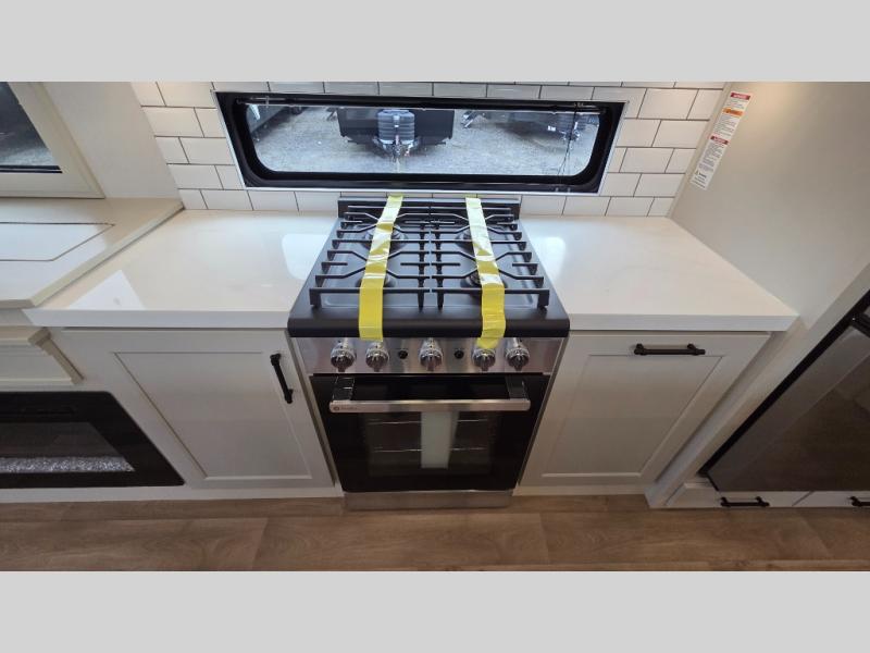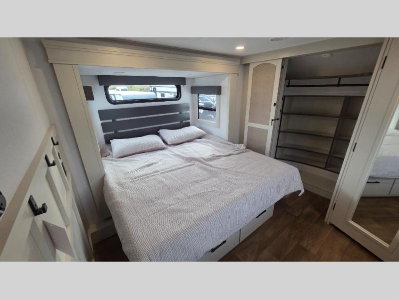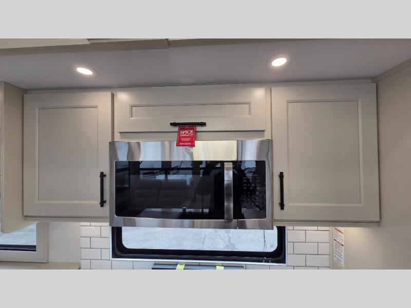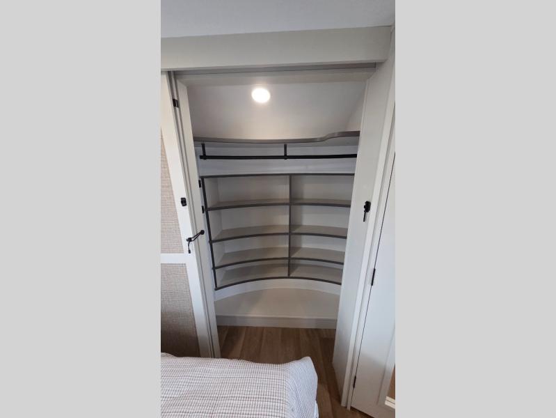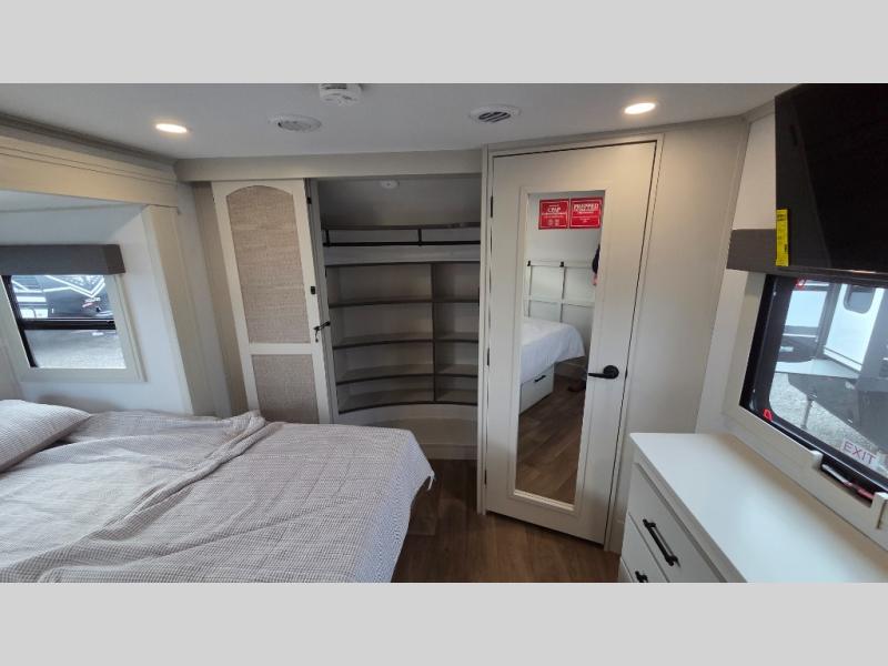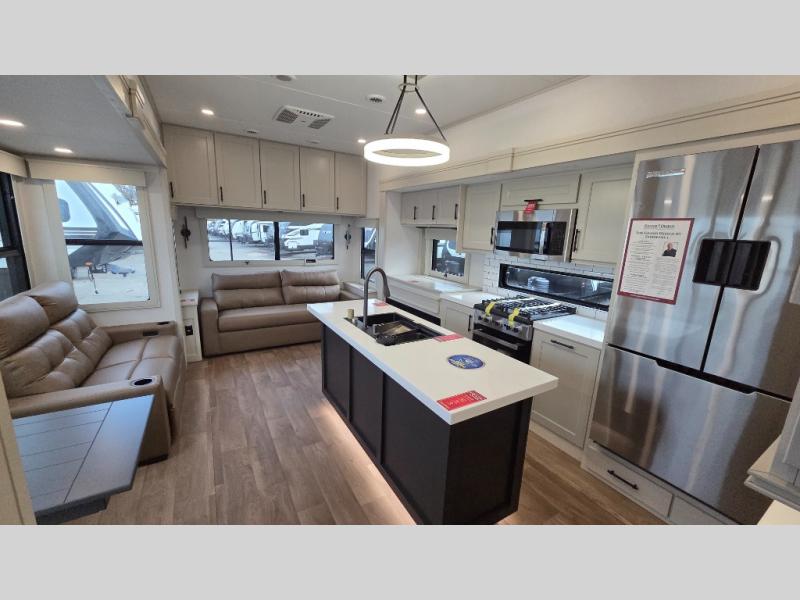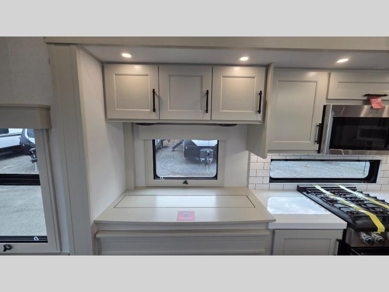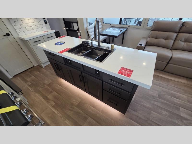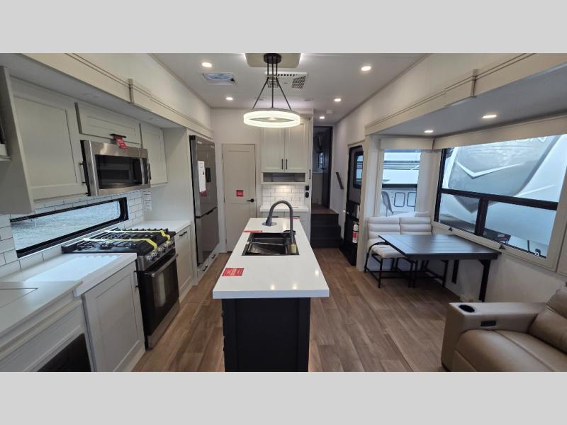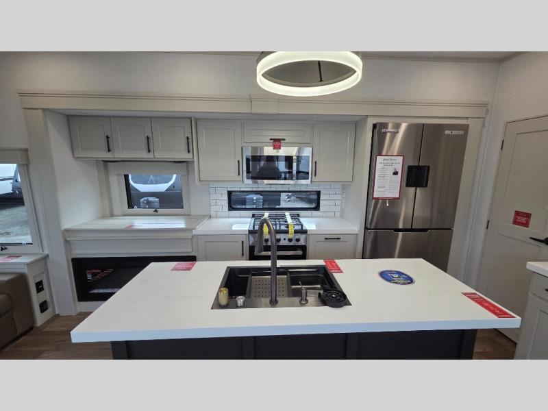 Traveling for long periods at a time is made easy with this gourmet kitchen that can feed your entire group a holiday meal! The professional-grade stainless steel cooktop with a built-in oven, microwave, 12V 20 cu. ft. refrigerator, and a kitchen island offers everything you will need to enjoy cooking for your family and guests. There is abundant storage throughout multiple overhead cabinets, a kitchen pantry and hutch, a bath linen cabinet for your towels, and in the front master bedroom which features a large closet. In the bedroom there is also a queen bed slide for added space to sleep comfortable at night, or you may choose an optional king bed if you enjoy more space. You will also find a closet with washer/dryer prep, large wardrobe, a clothes hamper plus a slide top dresser. Two nice awnings will provide outdoor living space keeping you protected from the sun and rain, and you can add an optional pull-out kitchen to enjoy convenient cooking outdoors as well.