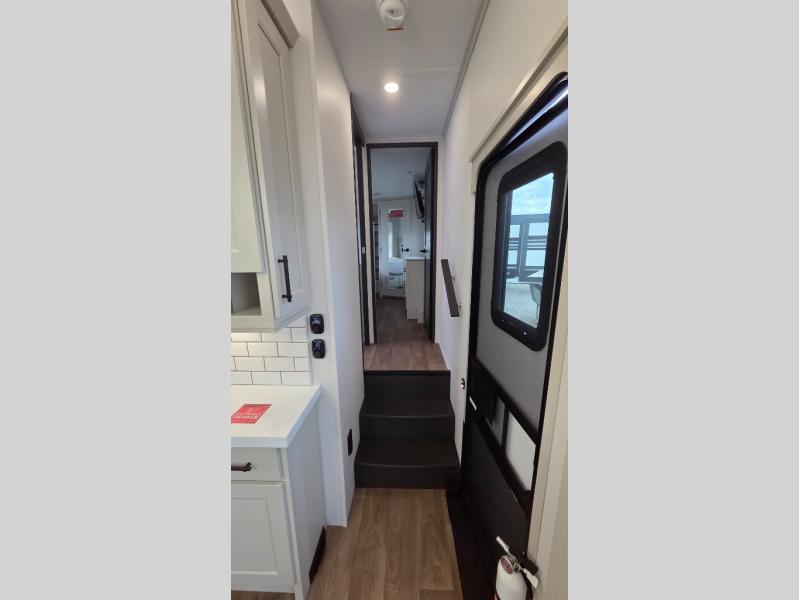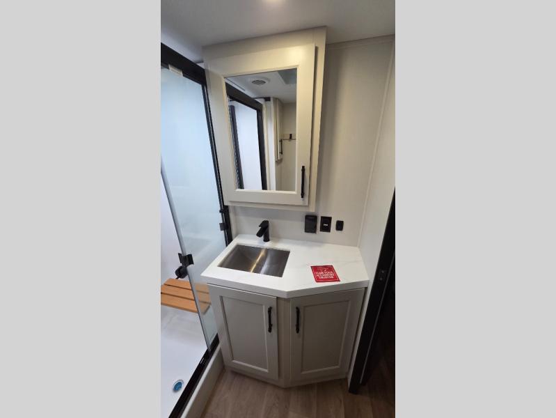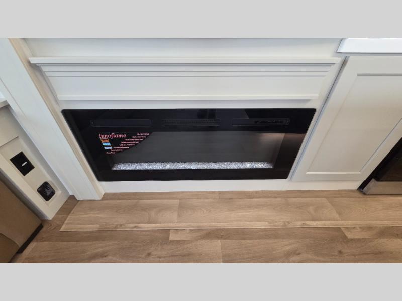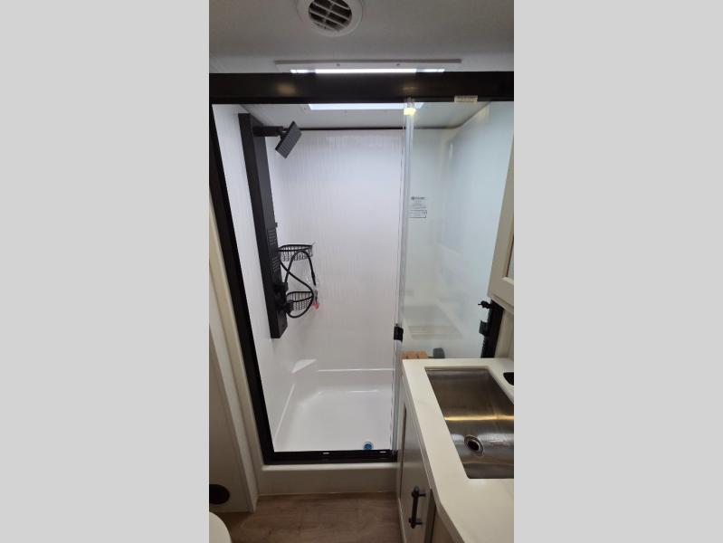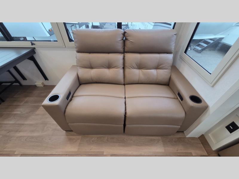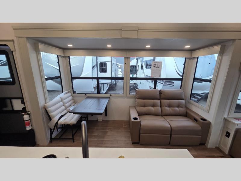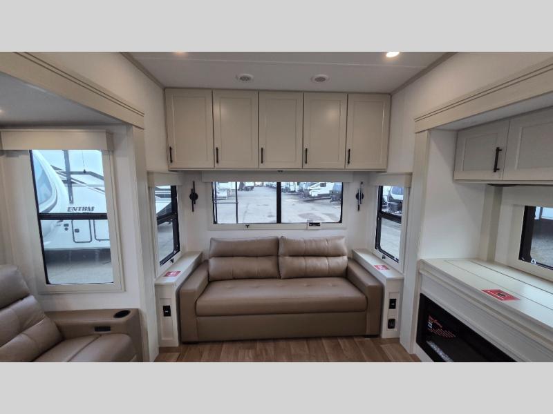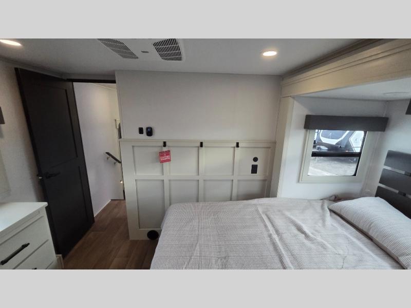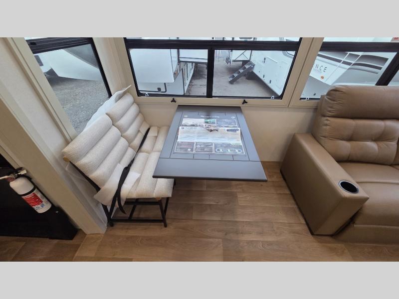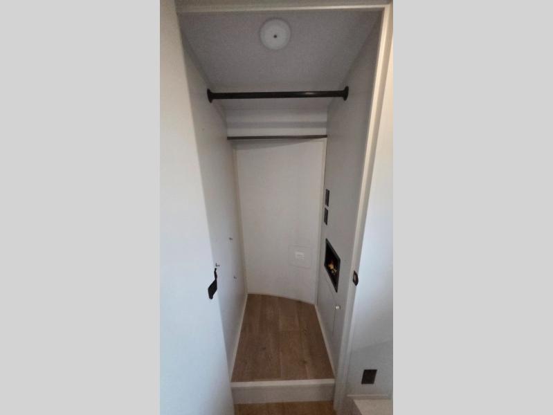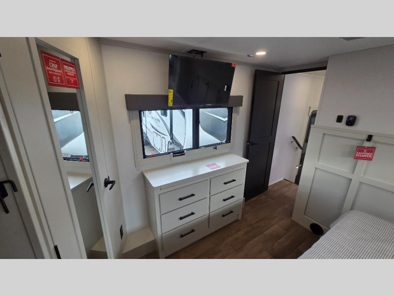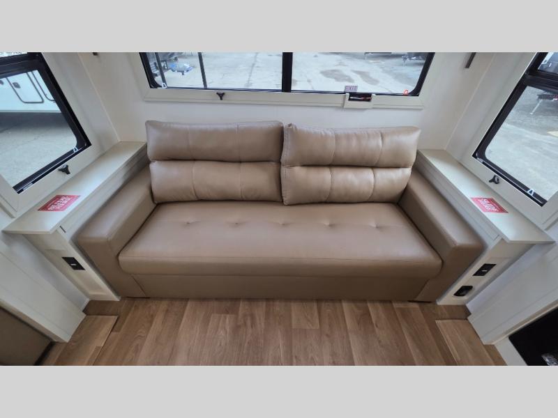 Traveling for long periods at a time is made easy with this gourmet kitchen that can feed your entire group a holiday meal! The professional-grade stainless steel cooktop with a built-in oven, microwave, 12V 20 cu. ft. refrigerator, and a kitchen island offers everything you will need to enjoy cooking for your family and guests. There is abundant storage throughout multiple overhead cabinets, a kitchen pantry and hutch, a bath linen cabinet for your towels, and in the front master bedroom which features a large closet. In the bedroom there is also a queen bed slide for added space to sleep comfortable at night, or you may choose an optional king bed if you enjoy more space. You will also find a closet with washer/dryer prep, large wardrobe, a clothes hamper plus a slide top dresser. Two nice awnings will provide outdoor living space keeping you protected from the sun and rain, and you can add an optional pull-out kitchen to enjoy convenient cooking outdoors as well.