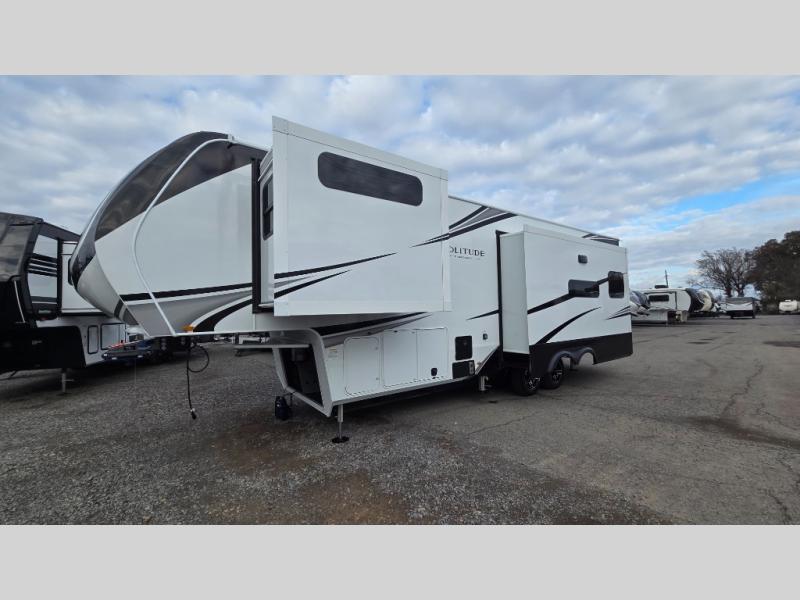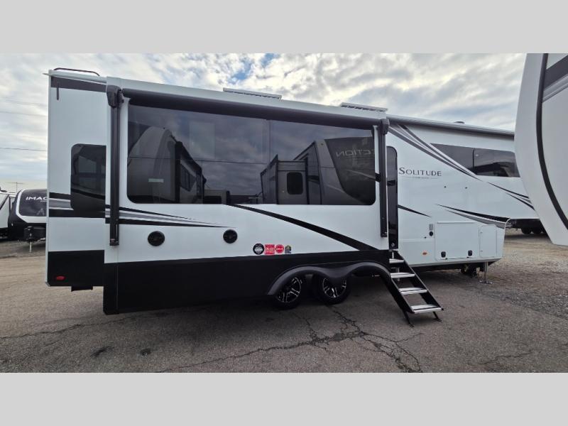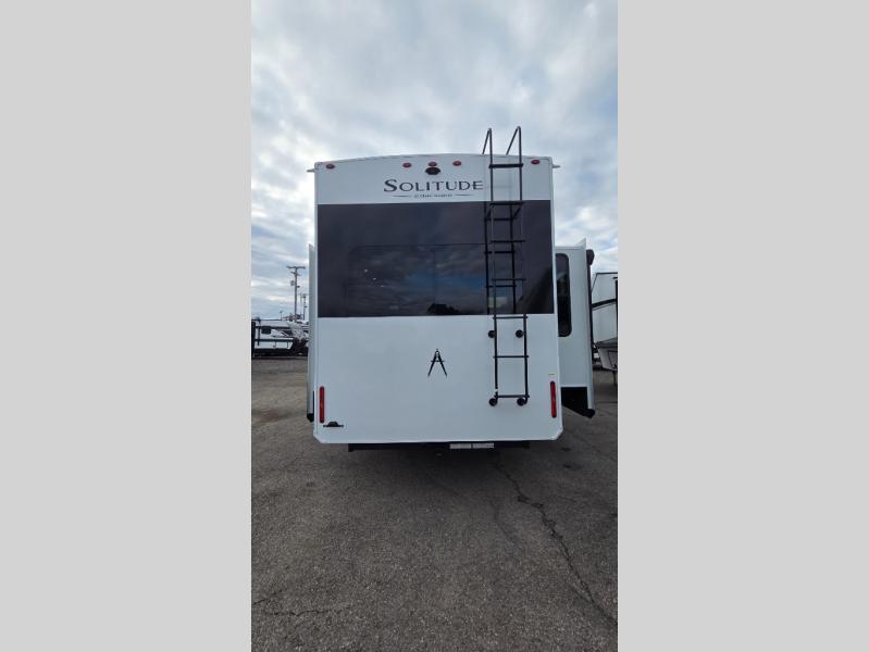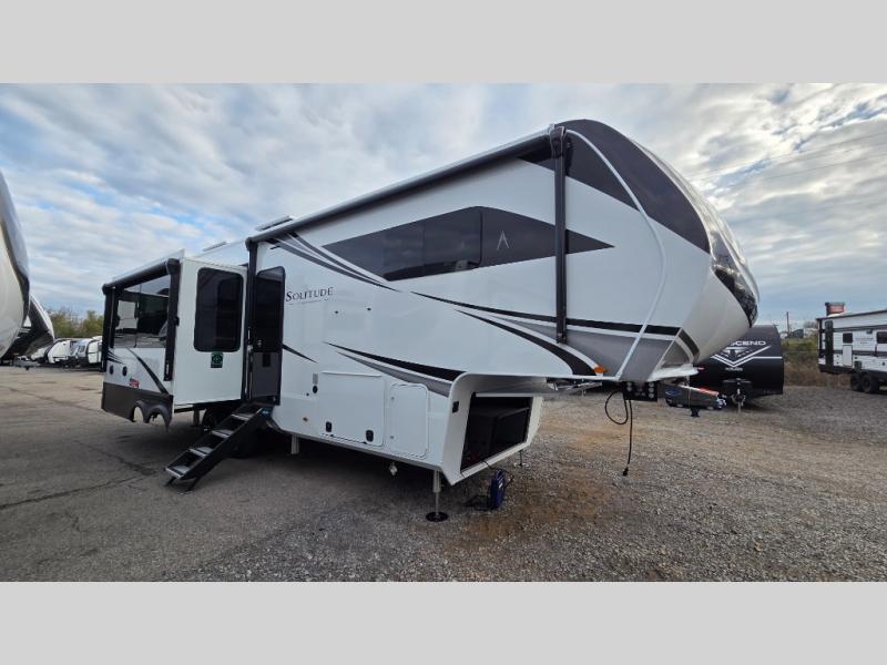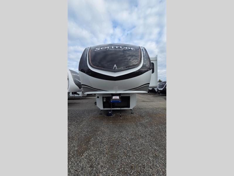 Each Solitude fifth wheel by Grand Design features a 101" wide-body construction, heavy duty 8,000 lb. axles, frameless tinted windows, and high-gloss gel coat sidewalls. You can camp year around thanks to the Weather-Tek Package that includes a 35K BTU high-capacity furnace, an all-in-one enclosed and heated utility center, and a fully enclosed underbelly with heated tanks and storage. Inside, you'll love the premium roller shades, hardwood cabinet doors, solid surface countertops, plus residential finishes throughout to make you truly feel at home. Each model also includes a MORryde CRE3000 suspension system, self adjusting brakes, and a MORryde pin box that will provide smooth towing from home to campground. Affordable luxury is possible with the Solitude fifth wheels; choose yours today!