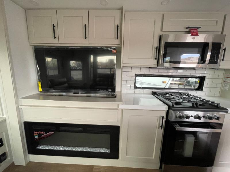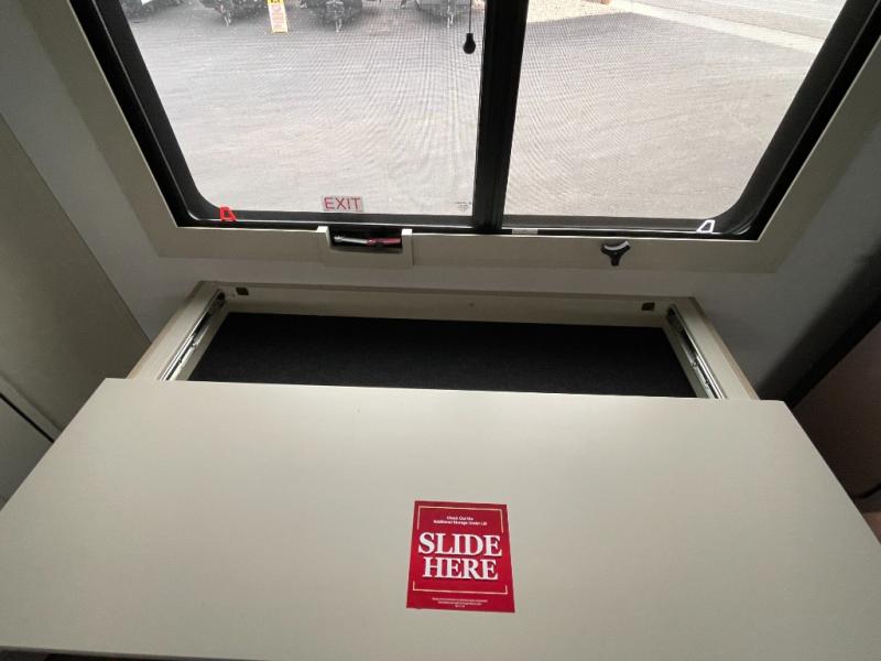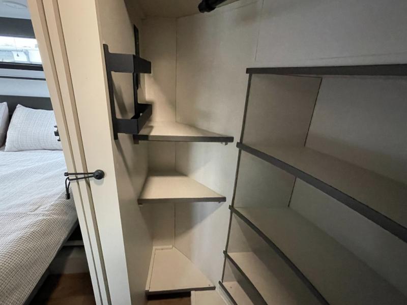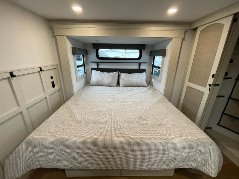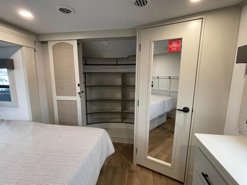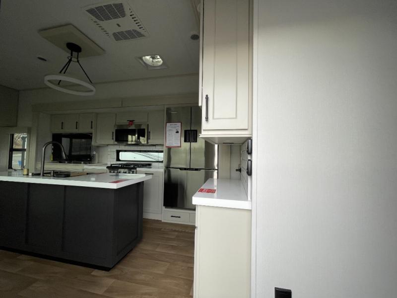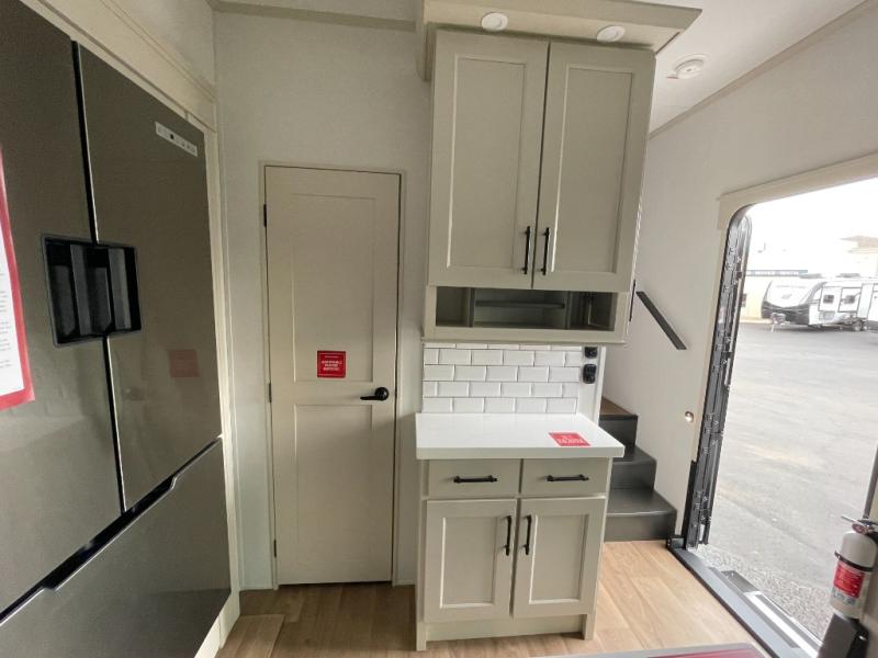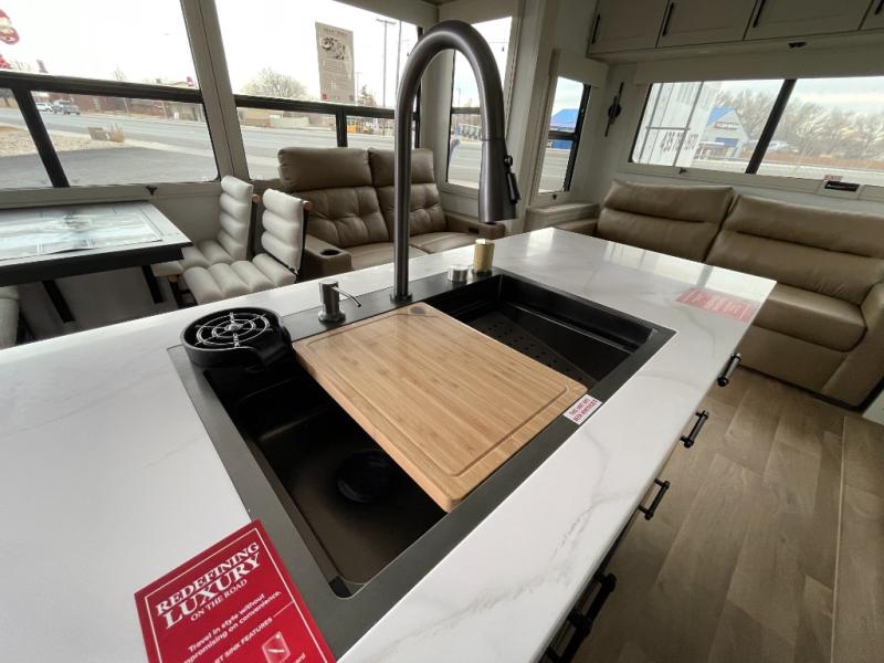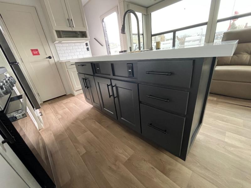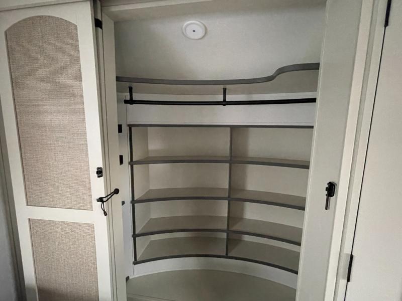 Traveling for long periods at a time is made easy with this gourmet kitchen that can feed your entire group a holiday meal! The professional-grade stainless steel cooktop with a built-in oven, microwave, 12V 20 cu. ft. refrigerator, and a kitchen island offers everything you will need to enjoy cooking for your family and guests. There is abundant storage throughout multiple overhead cabinets, a kitchen pantry and hutch, a bath linen cabinet for your towels, and in the front master bedroom which features a large closet. In the bedroom there is also a queen bed slide for added space to sleep comfortable at night, or you may choose an optional king bed if you enjoy more space. You will also find a closet with washer/dryer prep, large wardrobe, a clothes hamper plus a slide top dresser. Two nice awnings will provide outdoor living space keeping you protected from the sun and rain, and you can add an optional pull-out kitchen to enjoy convenient cooking outdoors as well.