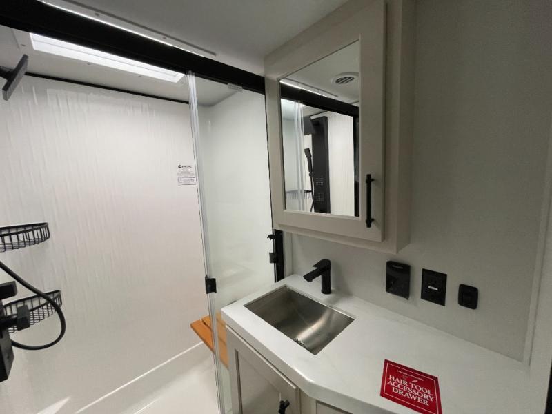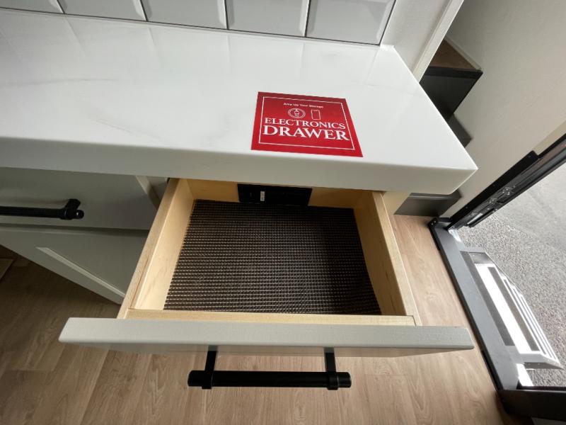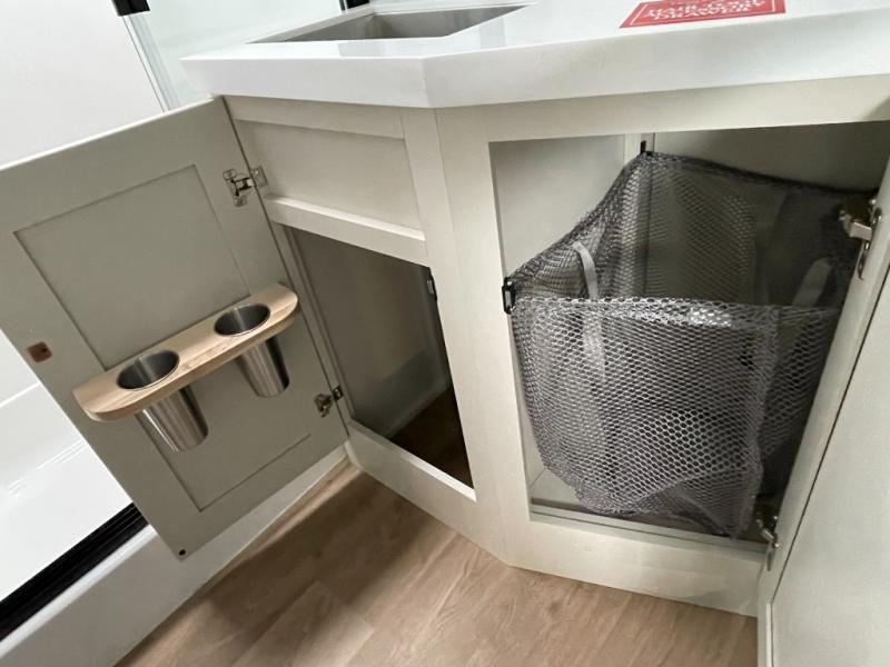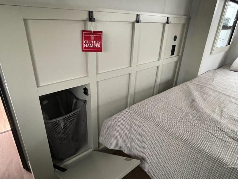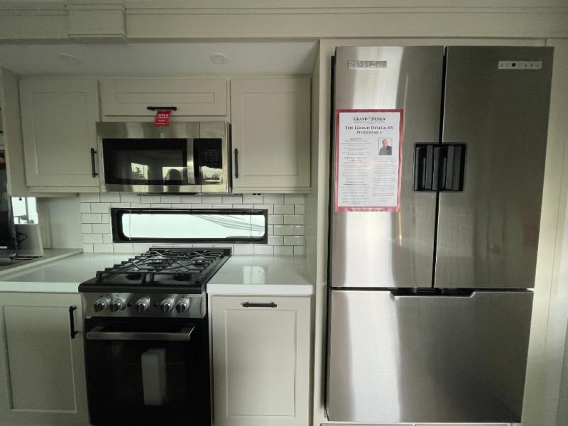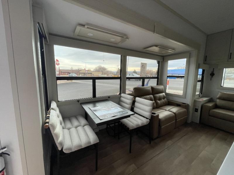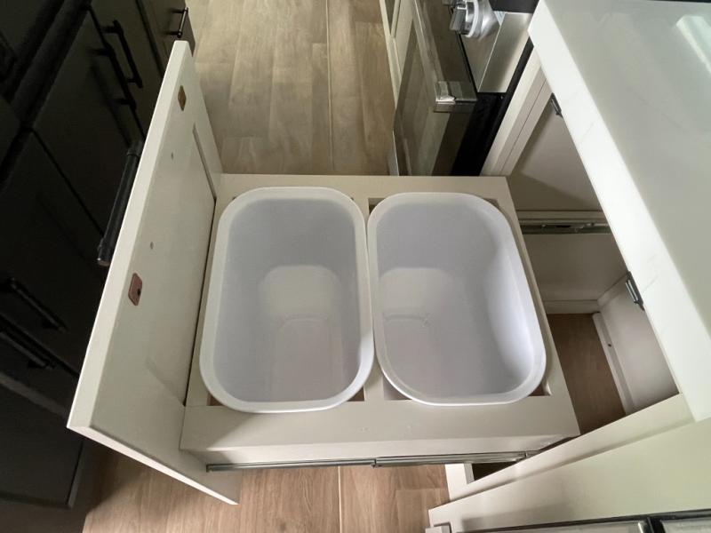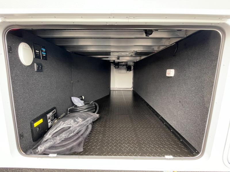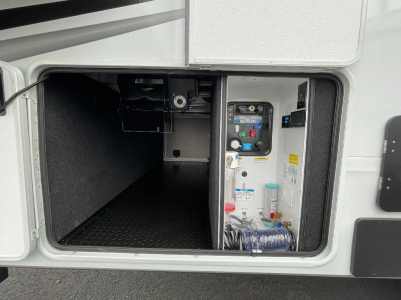 Traveling for long periods at a time is made easy with this gourmet kitchen that can feed your entire group a holiday meal! The professional-grade stainless steel cooktop with a built-in oven, microwave, 12V 20 cu. ft. refrigerator, and a kitchen island offers everything you will need to enjoy cooking for your family and guests. There is abundant storage throughout multiple overhead cabinets, a kitchen pantry and hutch, a bath linen cabinet for your towels, and in the front master bedroom which features a large closet. In the bedroom there is also a queen bed slide for added space to sleep comfortable at night, or you may choose an optional king bed if you enjoy more space. You will also find a closet with washer/dryer prep, large wardrobe, a clothes hamper plus a slide top dresser. Two nice awnings will provide outdoor living space keeping you protected from the sun and rain, and you can add an optional pull-out kitchen to enjoy convenient cooking outdoors as well.