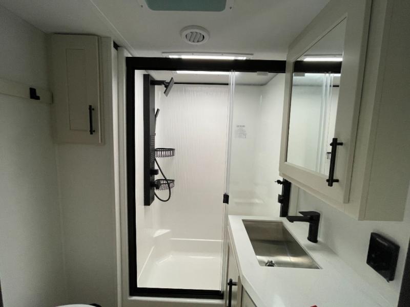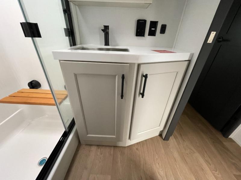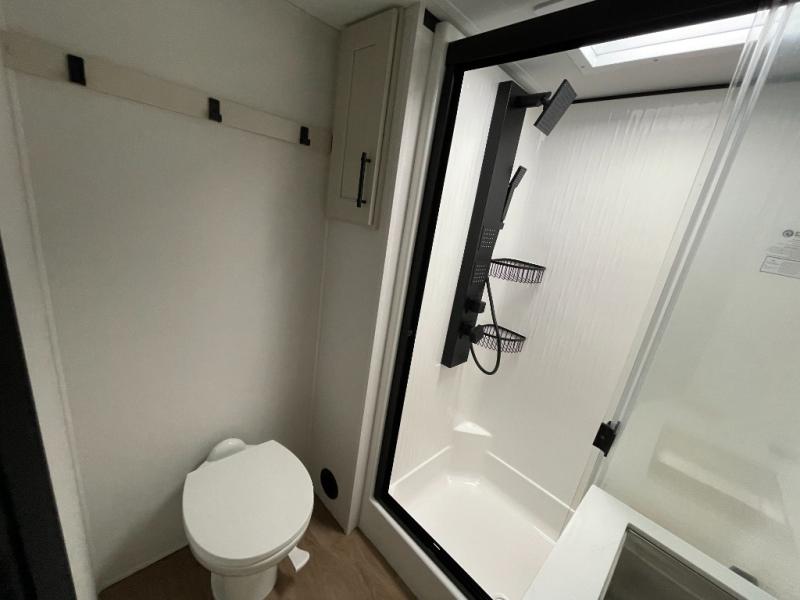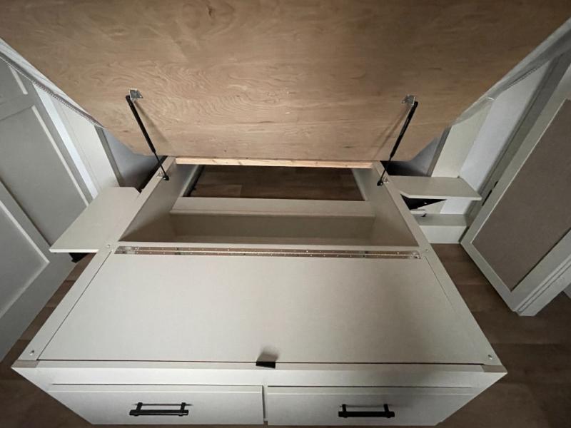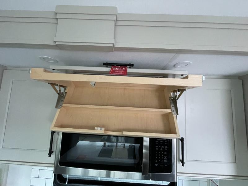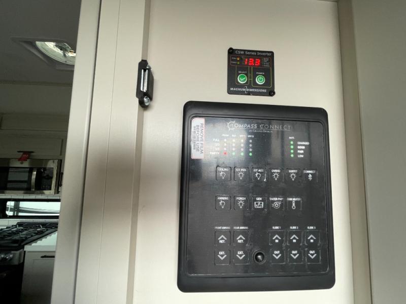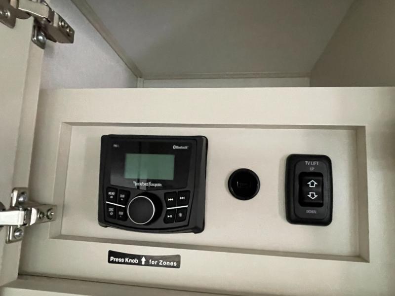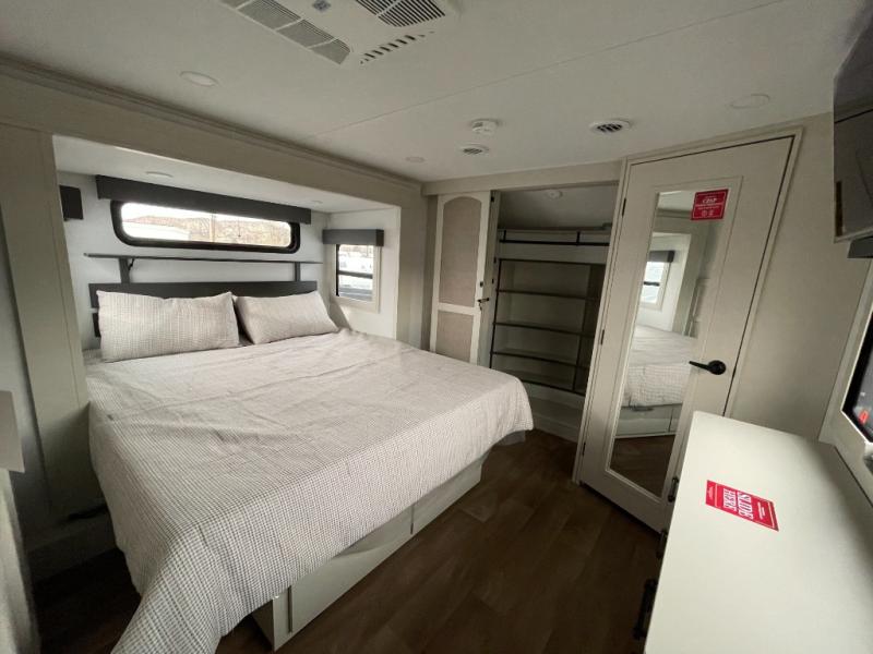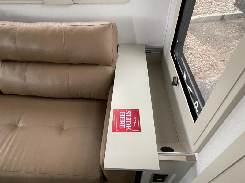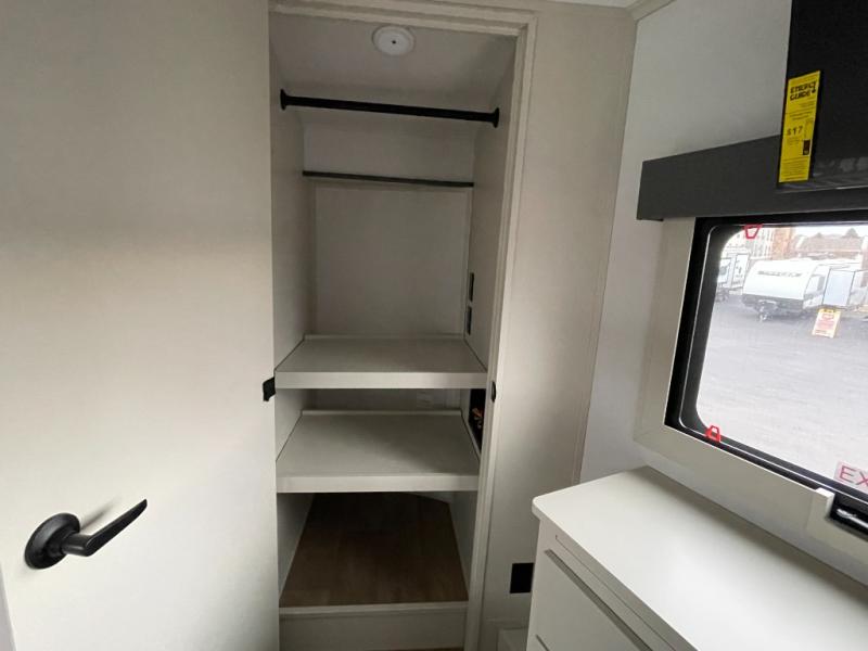 Traveling for long periods at a time is made easy with this gourmet kitchen that can feed your entire group a holiday meal! The professional-grade stainless steel cooktop with a built-in oven, microwave, 12V 20 cu. ft. refrigerator, and a kitchen island offers everything you will need to enjoy cooking for your family and guests. There is abundant storage throughout multiple overhead cabinets, a kitchen pantry and hutch, a bath linen cabinet for your towels, and in the front master bedroom which features a large closet. In the bedroom there is also a queen bed slide for added space to sleep comfortable at night, or you may choose an optional king bed if you enjoy more space. You will also find a closet with washer/dryer prep, large wardrobe, a clothes hamper plus a slide top dresser. Two nice awnings will provide outdoor living space keeping you protected from the sun and rain, and you can add an optional pull-out kitchen to enjoy convenient cooking outdoors as well.