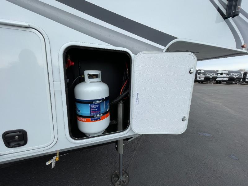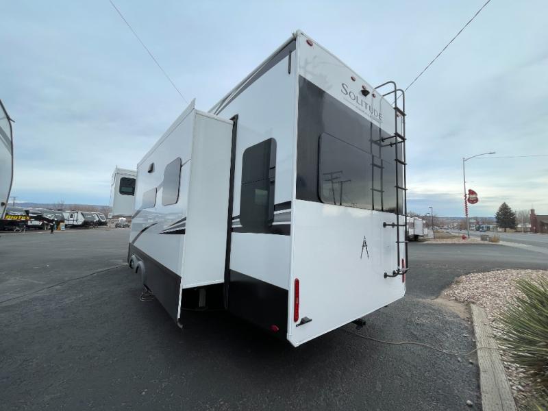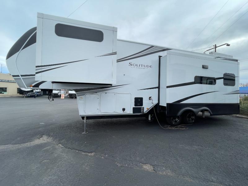 Each Solitude fifth wheel by Grand Design features a 101" wide-body construction, heavy duty 8,000 lb. axles, frameless tinted windows, and high-gloss gel coat sidewalls. You can camp year around thanks to the Weather-Tek Package that includes a 35K BTU high-capacity furnace, an all-in-one enclosed and heated utility center, and a fully enclosed underbelly with heated tanks and storage. Inside, you'll love the premium roller shades, hardwood cabinet doors, solid surface countertops, plus residential finishes throughout to make you truly feel at home. Each model also includes a MORryde CRE3000 suspension system, self adjusting brakes, and a MORryde pin box that will provide smooth towing from home to campground. Affordable luxury is possible with the Solitude fifth wheels; choose yours today!