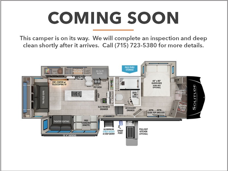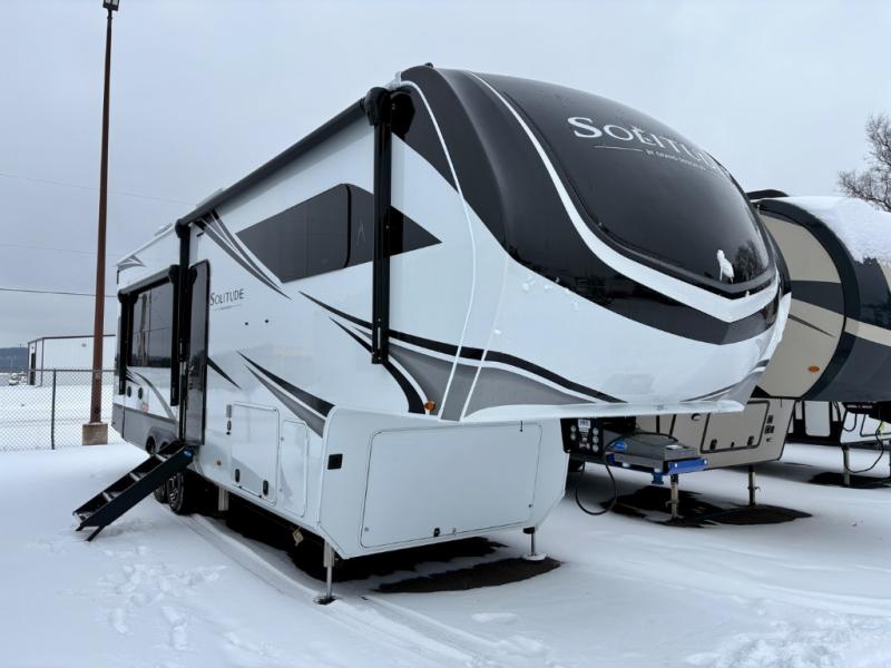 Each Solitude fifth wheel by Grand Design features a 101" wide-body construction, heavy duty 8,000 lb. axles, frameless tinted windows, and high-gloss gel coat sidewalls. You can camp year around thanks to the Weather-Tek Package that includes a 35K BTU high-capacity furnace, an all-in-one enclosed and heated utility center, and a fully enclosed underbelly with heated tanks and storage. Inside, you'll love the premium roller shades, hardwood cabinet doors, solid surface countertops, plus residential finishes throughout to make you truly feel at home. Each model also includes a MORryde CRE3000 suspension system, self adjusting brakes, and a MORryde pin box that will provide smooth towing from home to campground. Affordable luxury is possible with the Solitude fifth wheels; choose yours today!