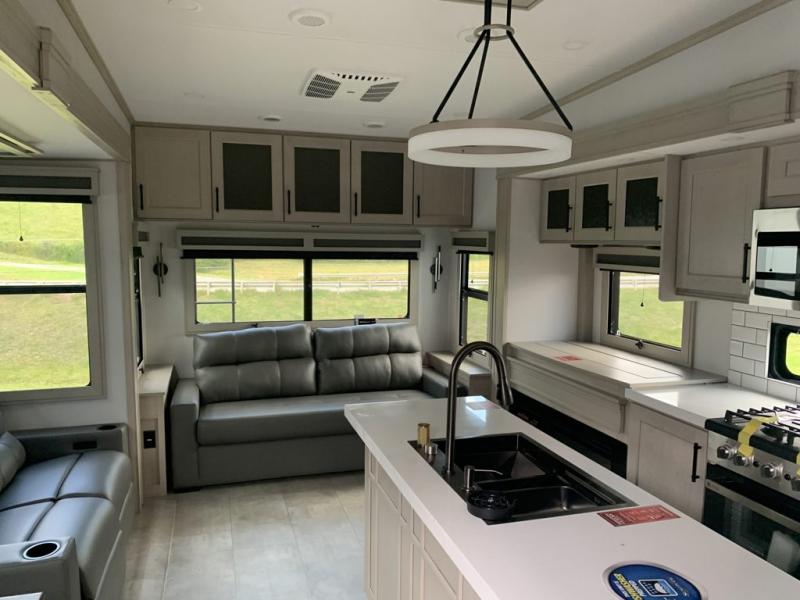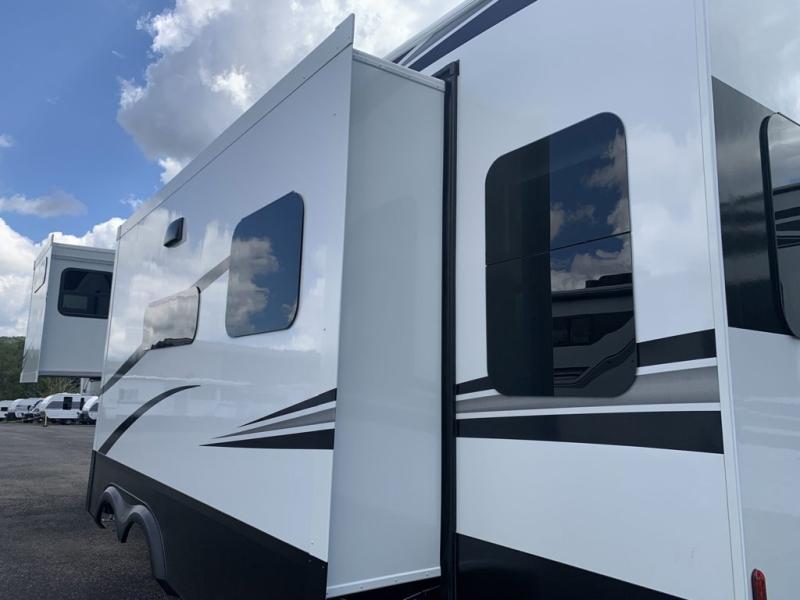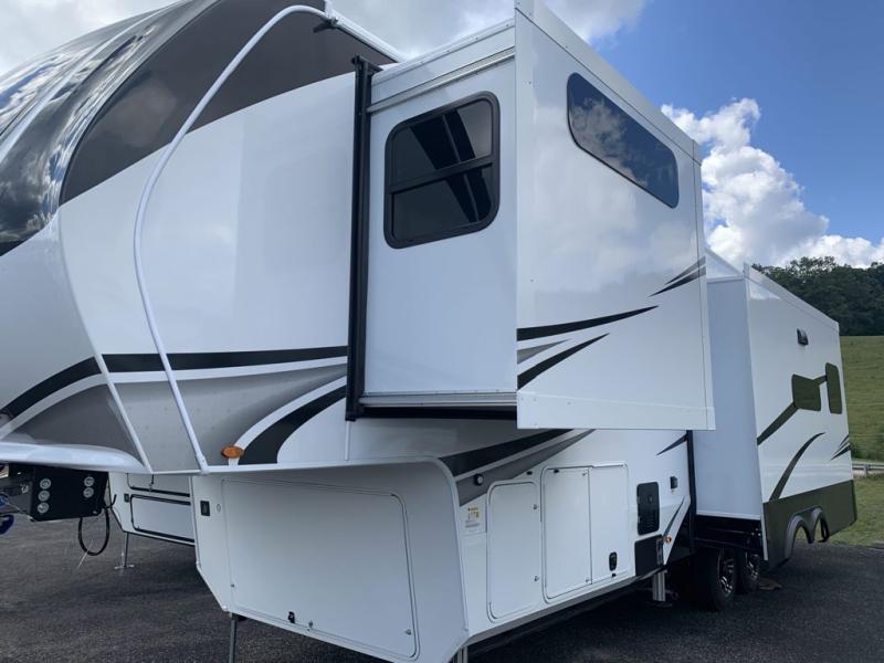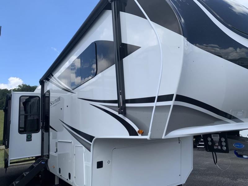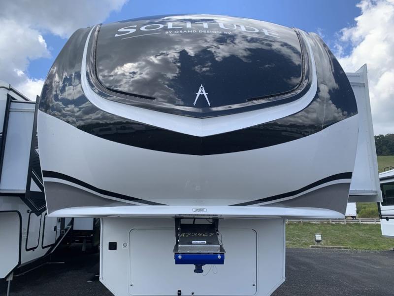 Each Solitude fifth wheel by Grand Design features a 101" wide-body construction, heavy duty 8,000 lb. axles, frameless tinted windows, and high-gloss gel coat sidewalls. You can camp year around thanks to the Weather-Tek Package that includes a 35K BTU high-capacity furnace, an all-in-one enclosed and heated utility center, and a fully enclosed underbelly with heated tanks and storage. Inside, you'll love the premium roller shades, hardwood cabinet doors, solid surface countertops, plus residential finishes throughout to make you truly feel at home. Each model also includes a MORryde CRE3000 suspension system, self adjusting brakes, and a MORryde pin box that will provide smooth towing from home to campground. Affordable luxury is possible with the Solitude fifth wheels; choose yours today!