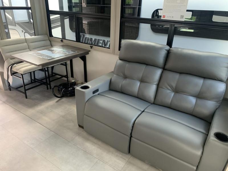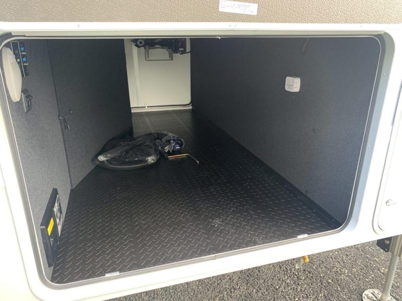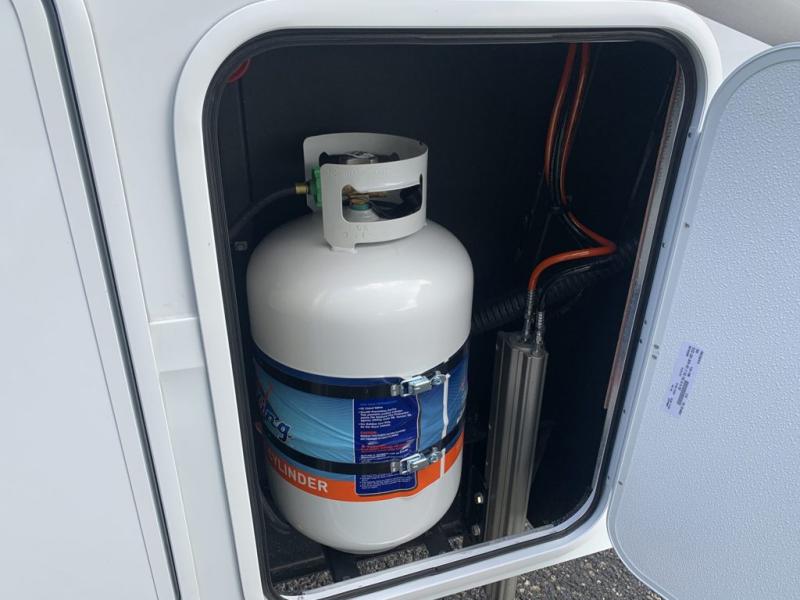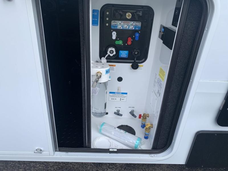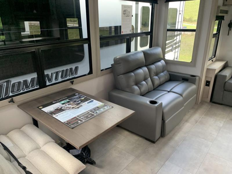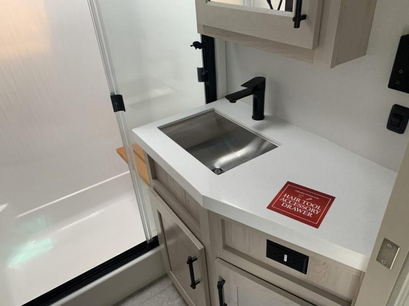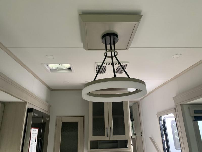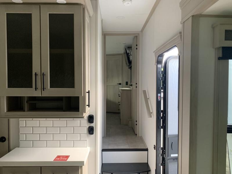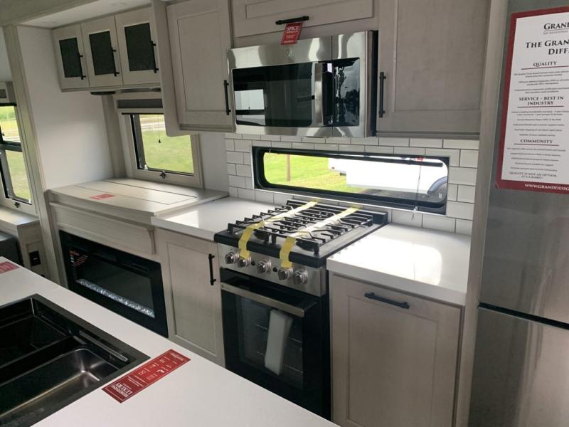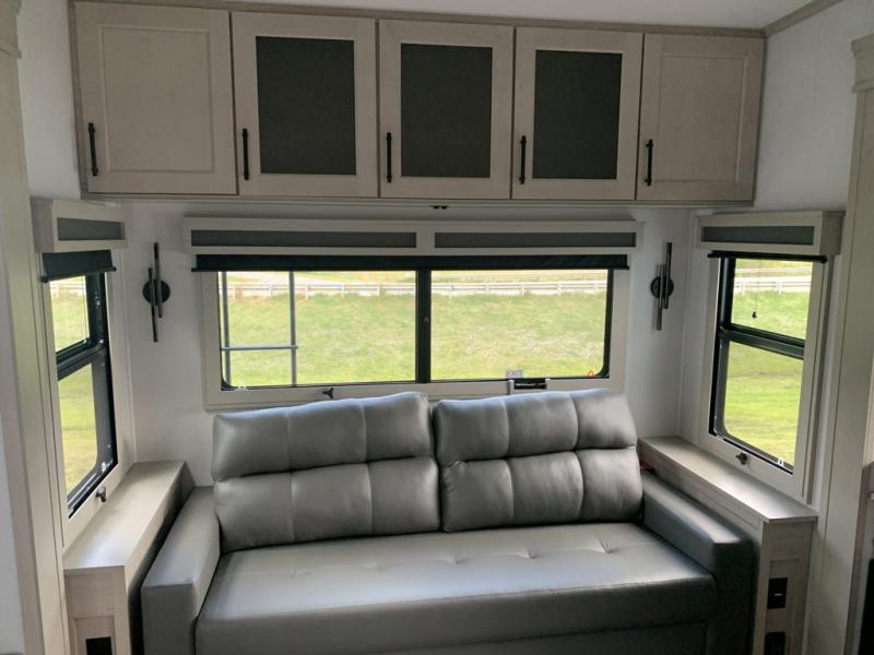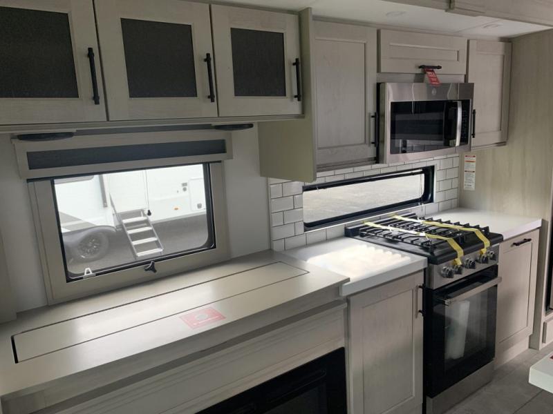 Traveling for long periods at a time is made easy with this gourmet kitchen that can feed your entire group a holiday meal! The professional-grade stainless steel cooktop with a built-in oven, microwave, 12V 20 cu. ft. refrigerator, and a kitchen island offers everything you will need to enjoy cooking for your family and guests. There is abundant storage throughout multiple overhead cabinets, a kitchen pantry and hutch, a bath linen cabinet for your towels, and in the front master bedroom which features a large closet. In the bedroom there is also a queen bed slide for added space to sleep comfortable at night, or you may choose an optional king bed if you enjoy more space. You will also find a closet with washer/dryer prep, large wardrobe, a clothes hamper plus a slide top dresser. Two nice awnings will provide outdoor living space keeping you protected from the sun and rain, and you can add an optional pull-out kitchen to enjoy convenient cooking outdoors as well.