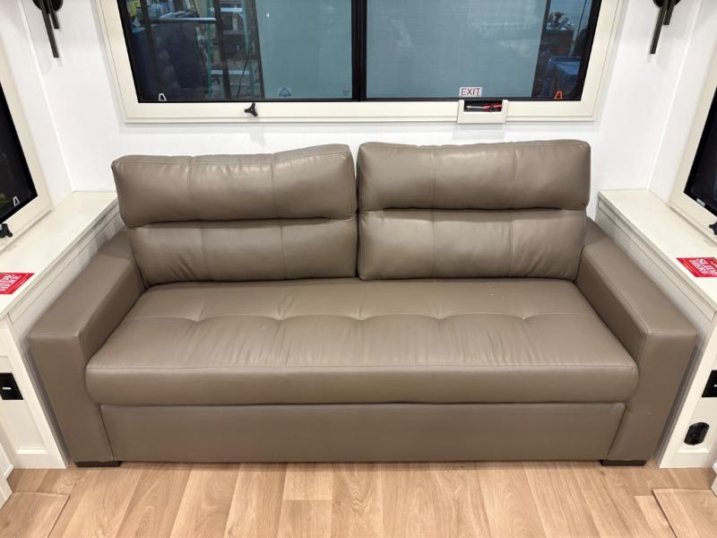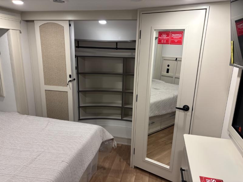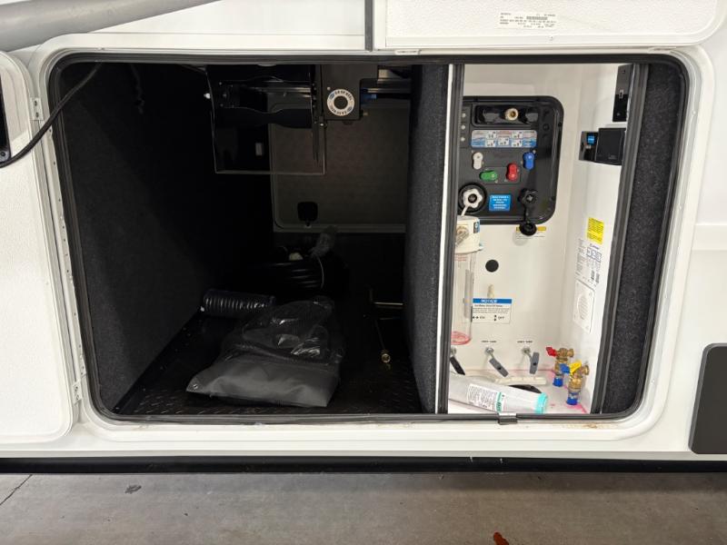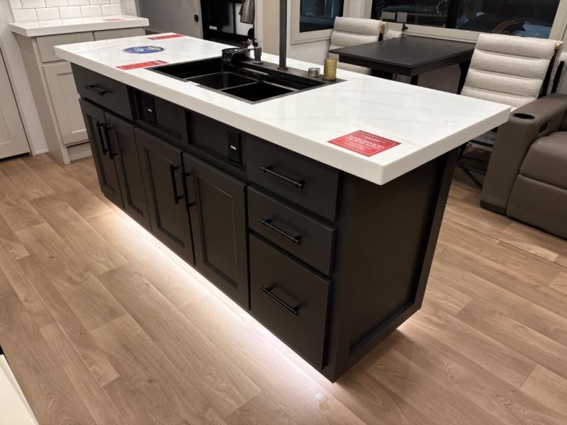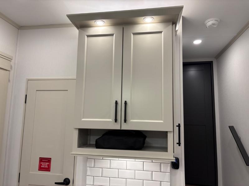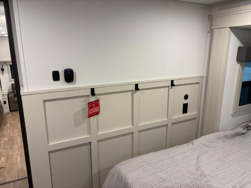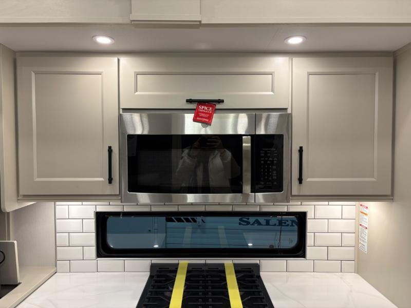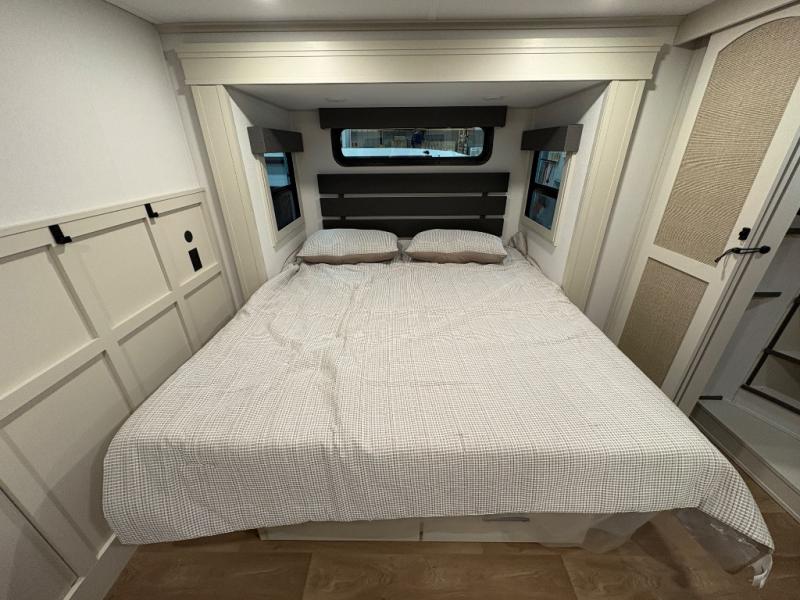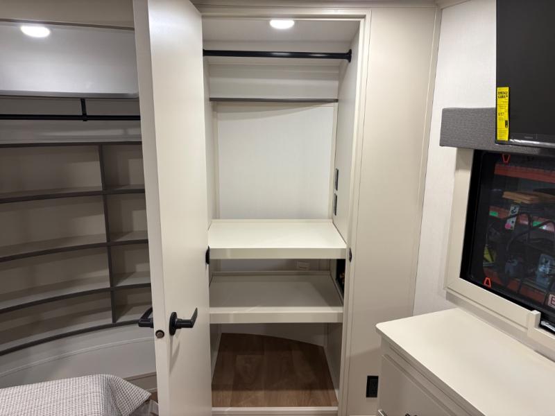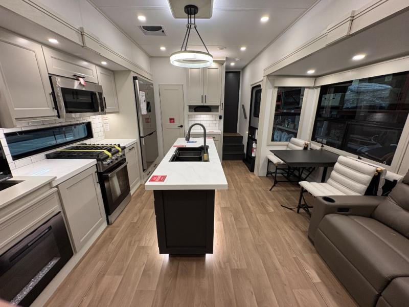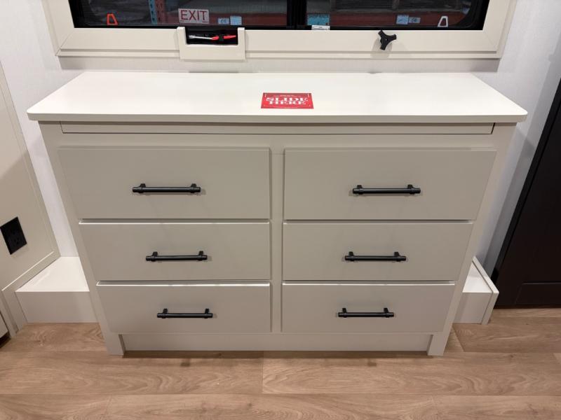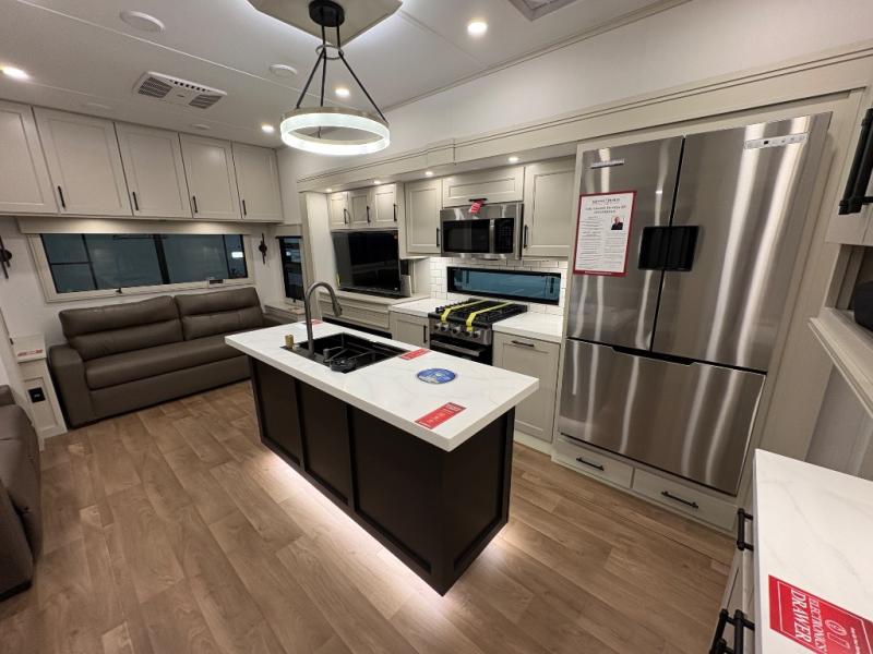 Traveling for long periods at a time is made easy with this gourmet kitchen that can feed your entire group a holiday meal! The professional-grade stainless steel cooktop with a built-in oven, microwave, 20 cu. ft. refrigerator, and a kitchen island offers everything you will need to enjoy cooking for your family and guests. There is abundant storage throughout multiple overhead cabinets, a kitchen pantry and a bath linen cabinet for your towels, and in the front master bedroom which features a large closet. In the bedroom there is also a queen bed slide for added space to sleep comfortable at night, or you may choose an optional king bed if you enjoy more space. You will also find a closet with washer/dryer prep, large wardrobe, clothes hamper plus a slide top dresser. Two nice awnings will provide outdoor living space keeping you protected from the sun and rain, and you can add an optional pull-out kitchen to enjoy convenient cooking outdoors as well.