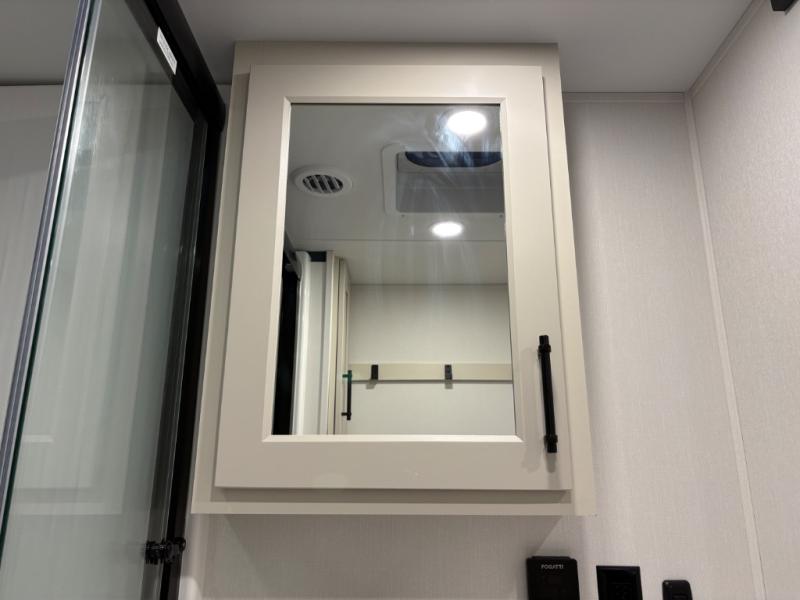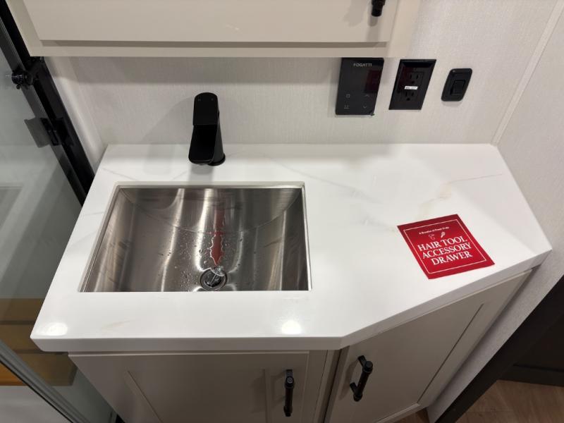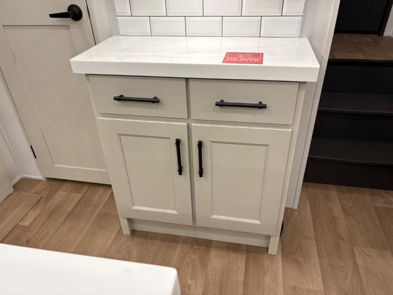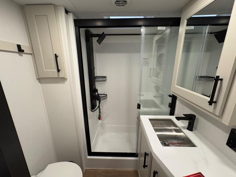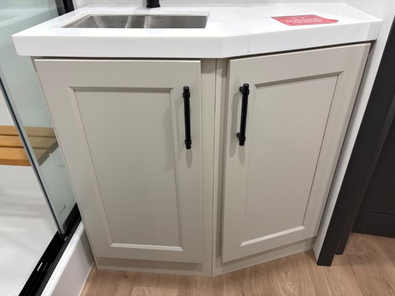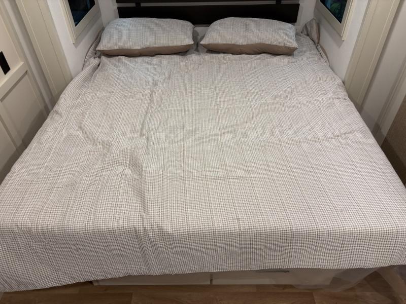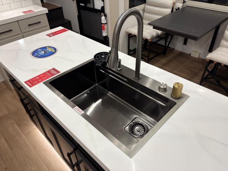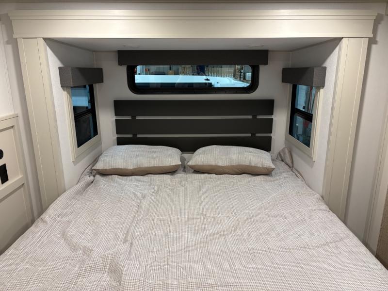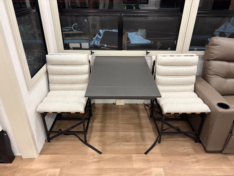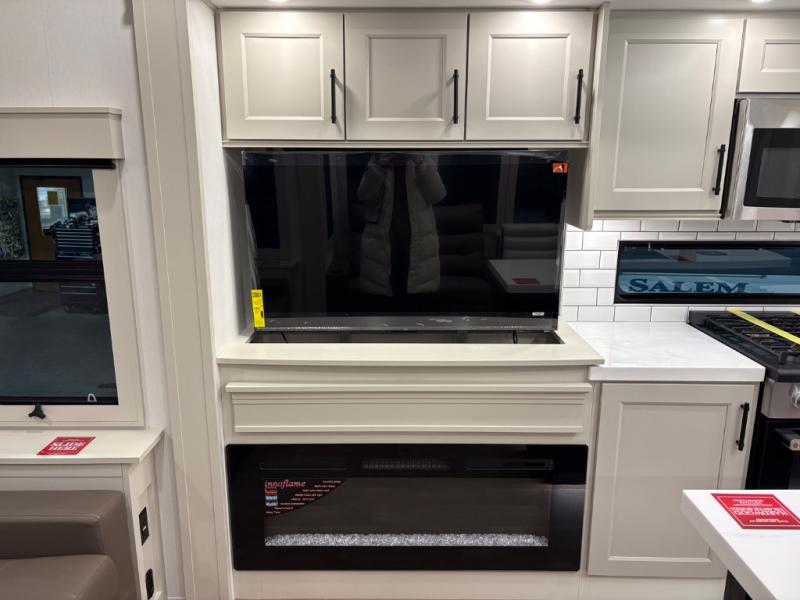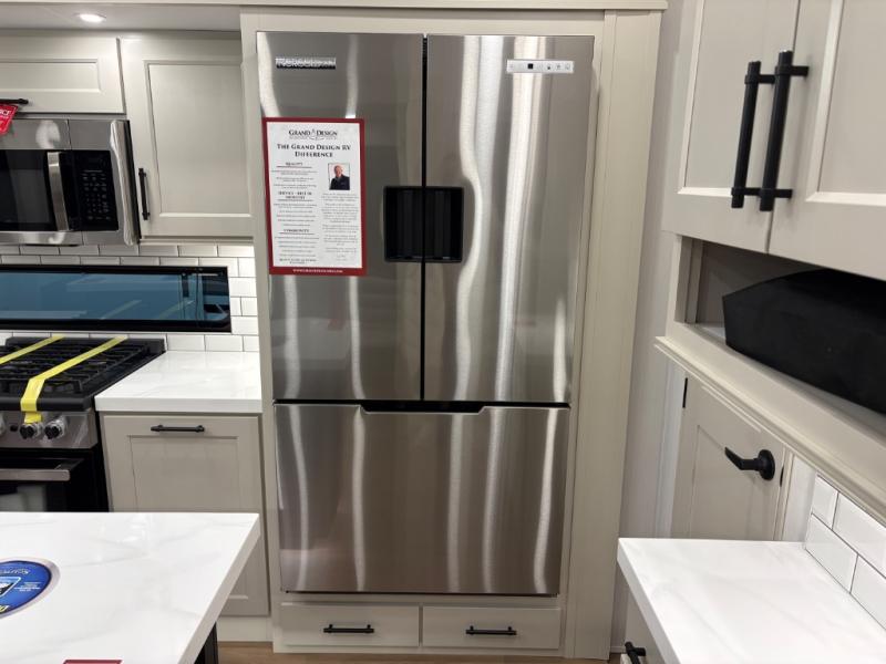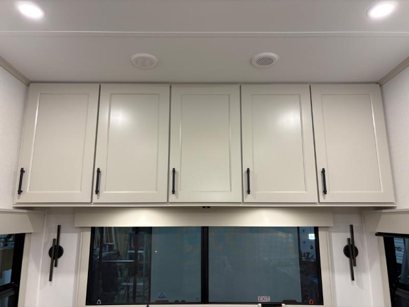 Traveling for long periods at a time is made easy with this gourmet kitchen that can feed your entire group a holiday meal! The professional-grade stainless steel cooktop with a built-in oven, microwave, 20 cu. ft. refrigerator, and a kitchen island offers everything you will need to enjoy cooking for your family and guests. There is abundant storage throughout multiple overhead cabinets, a kitchen pantry and a bath linen cabinet for your towels, and in the front master bedroom which features a large closet. In the bedroom there is also a queen bed slide for added space to sleep comfortable at night, or you may choose an optional king bed if you enjoy more space. You will also find a closet with washer/dryer prep, large wardrobe, clothes hamper plus a slide top dresser. Two nice awnings will provide outdoor living space keeping you protected from the sun and rain, and you can add an optional pull-out kitchen to enjoy convenient cooking outdoors as well.