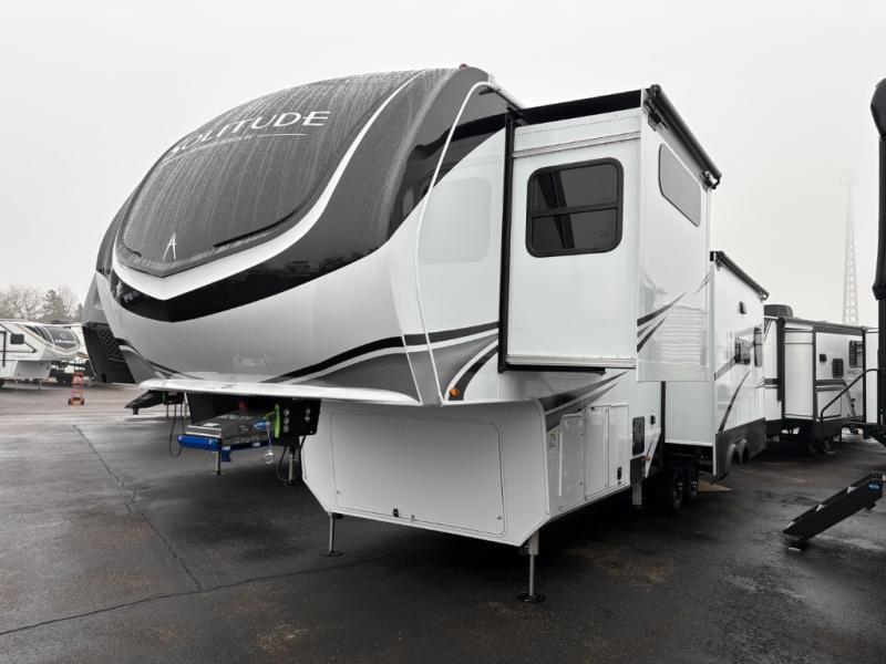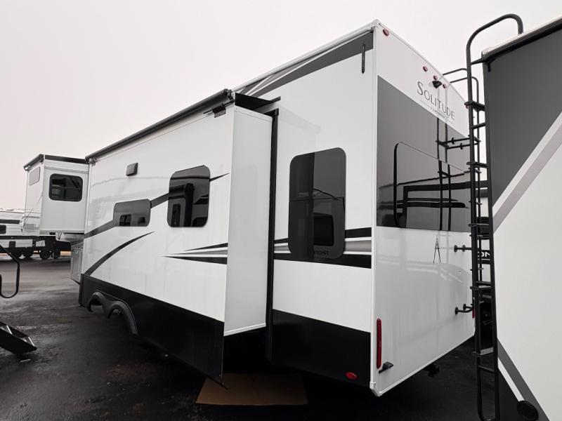 Each Solitude fifth wheel by Grand Design features a 101" wide-body construction, heavy duty 8,000 lb. axles, frameless tinted windows, and high-gloss gel coat sidewalls. You can camp during harsh weather thanks to the Weather-Tek Package that includes a 35K BTU high-capacity furnace, an all-in-one enclosed and heated utility center, and a fully enclosed underbelly with heated tanks and storage. Inside, you'll love the premium roller shades, hardwood cabinet doors, solid surface countertops, plus residential finishes throughout to make you truly feel at home. Each model also includes a MORryde CRE3000 suspension system, and a MORryde pin box that will provide smooth towing from home to campground. Affordable luxury is possible with the Solitude fifth wheels; choose yours today!
