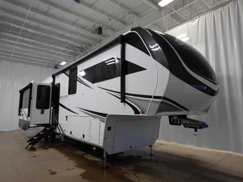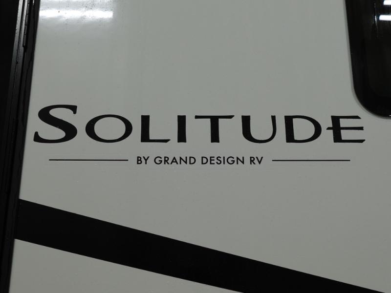 Each Solitude fifth wheel by Grand Design features a 101" wide-body construction, heavy duty 8,000 lb. axles, frameless tinted windows, and high-gloss gel coat sidewalls. You can camp year around thanks to the Weather-Tek Package that includes a 35K BTU high-capacity furnace, an all-in-one enclosed and heated utility center, and a fully enclosed underbelly with heated tanks and storage. Inside, you'll love the premium roller shades, hardwood cabinet doors, solid surface countertops, plus residential finishes throughout to make you truly feel at home. Each model also includes a MORryde CRE3000 suspension system, self adjusting brakes, and a MORryde pin box that will provide smooth towing from home to campground. Affordable luxury is possible with the Solitude fifth wheels; choose yours today!