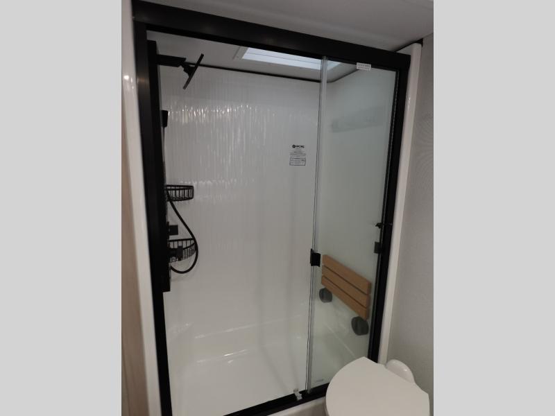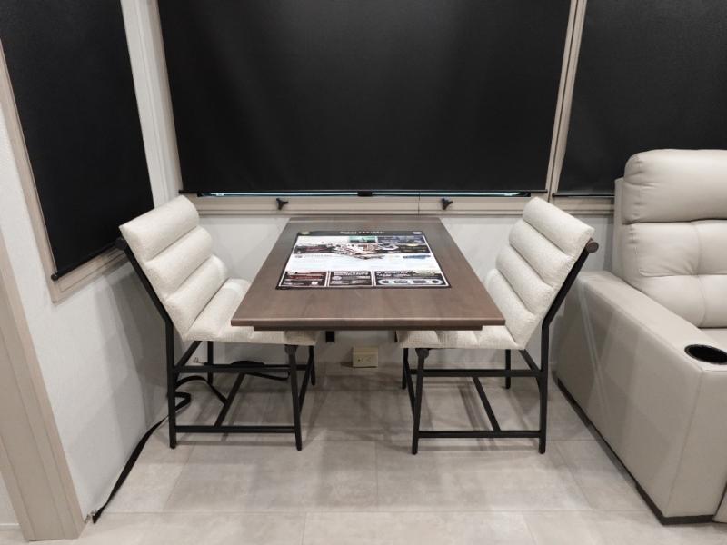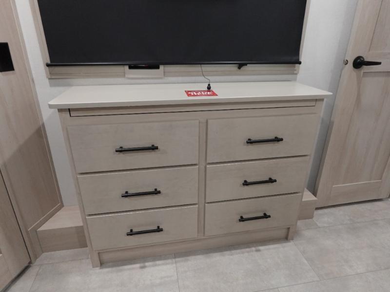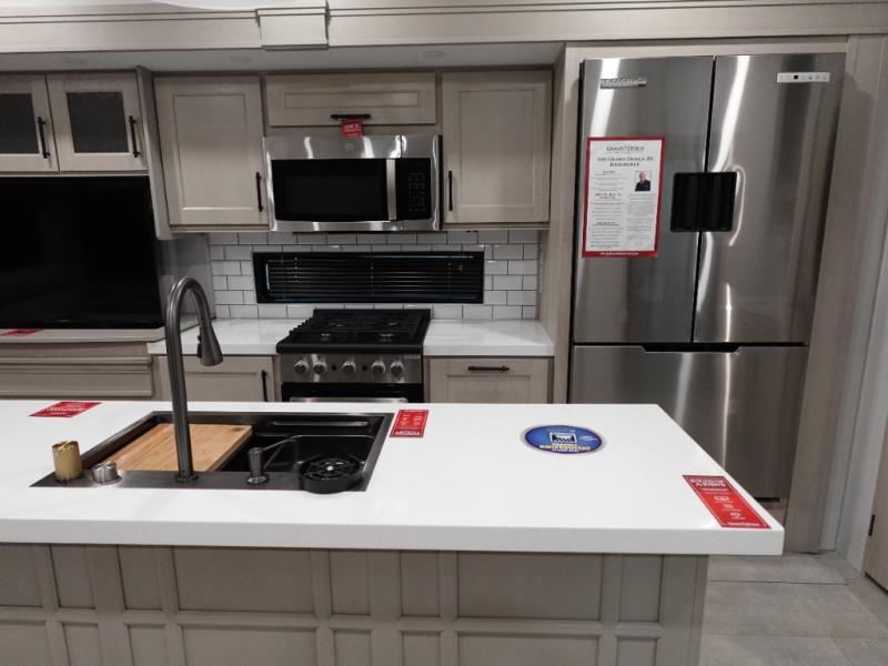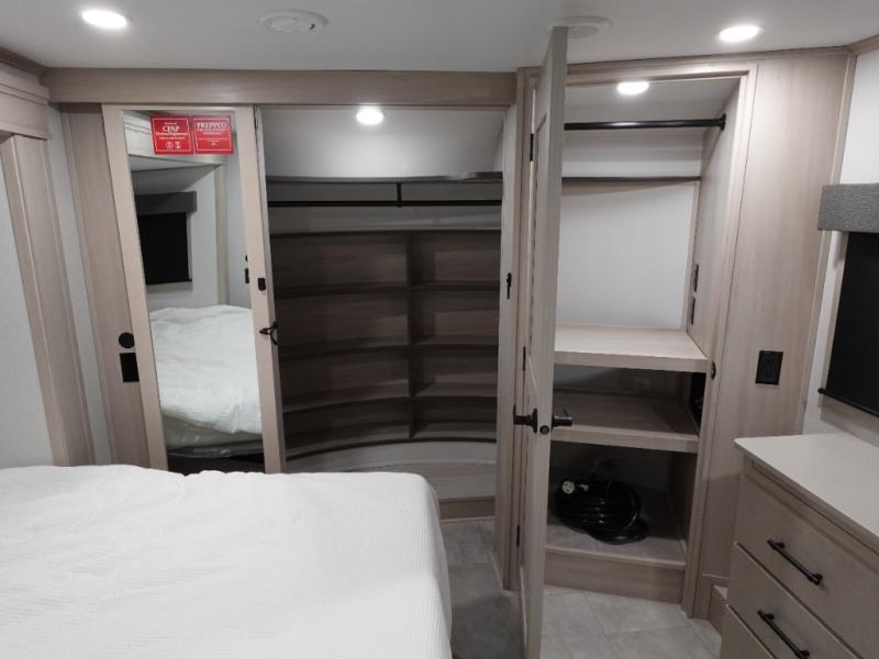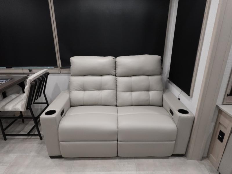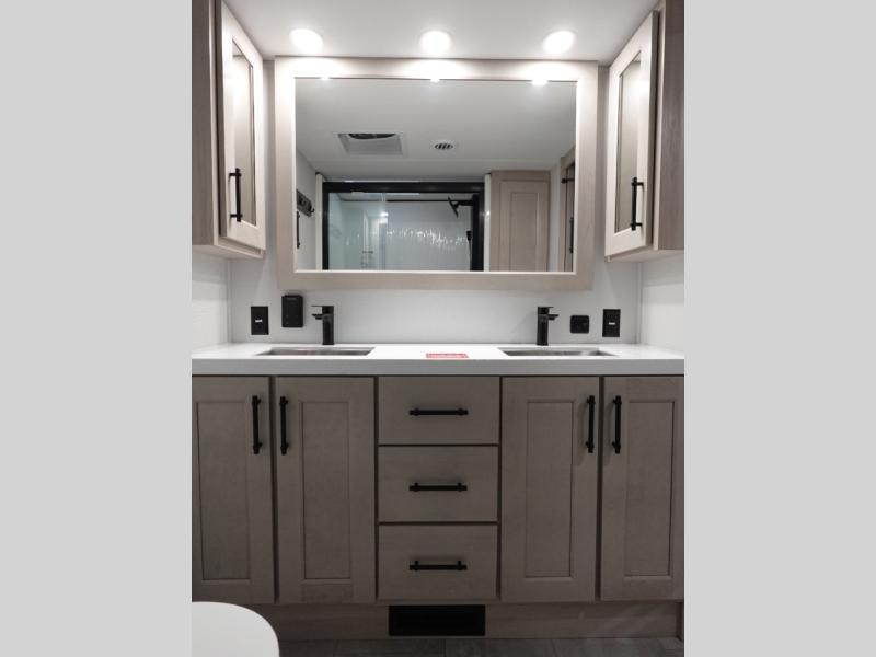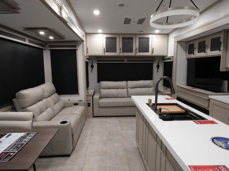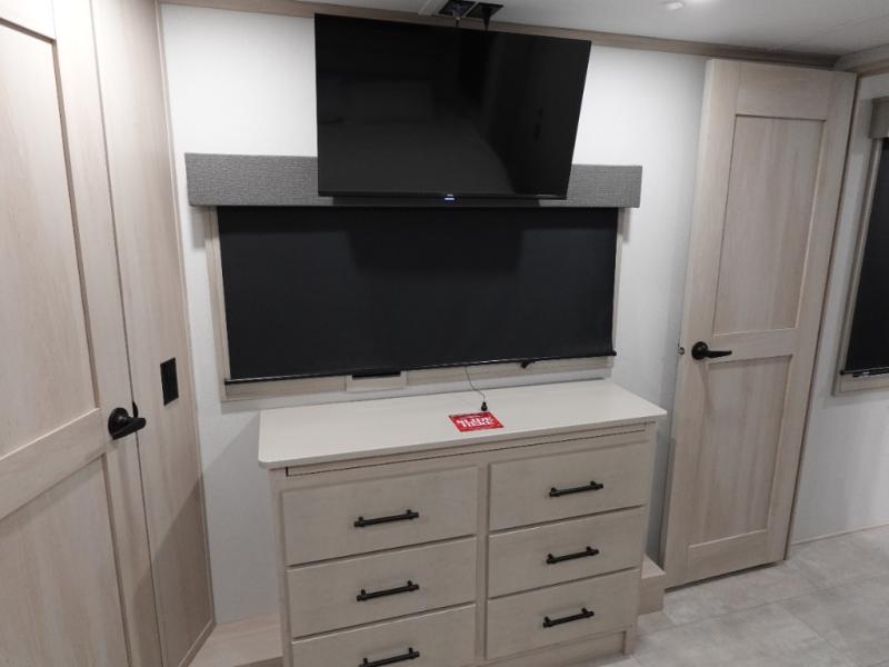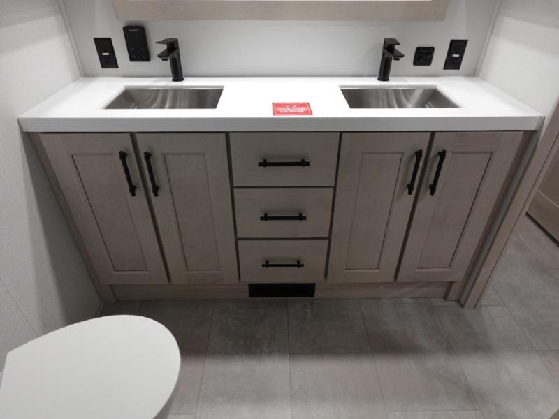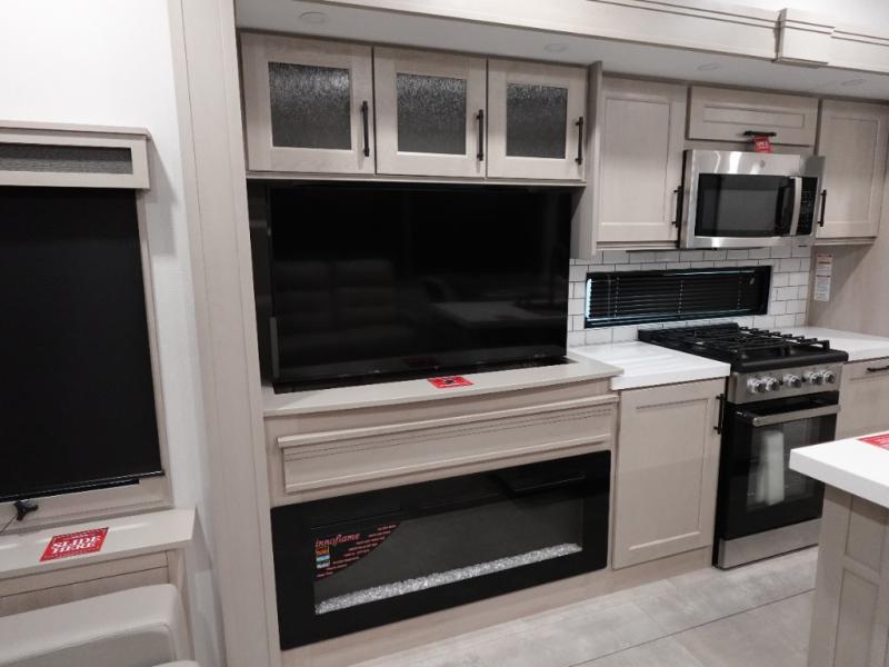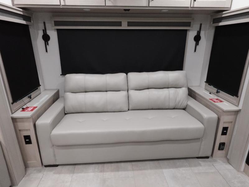 Are you looking to upgrade from a travel trailer to a fifth wheel? If so, this model will be perfect for you! Once you arrive at the campground, you can unload your gear from the pass-through storage, put out the two power awnings, then relax with a cold drink. Inside, you can kick your feet up on the theater seating, play a game at the free-standing dinette, or relax on the tri-fold sofa. The chef of your group will have a kitchen island with a Smart sink, plus a spacious 20 cu. ft. 12V refrigerator. There is also a built-in oven, plus a pantry and a hutch for storage galore! Having two bath sinks in the full bath is sure to be a big convenience when getting ready for bed, and the bed slide out in the front bedroom will provide a great night's rest. You will also find a front wardrobe, a slide top dresser, plus washer/dryer prep!