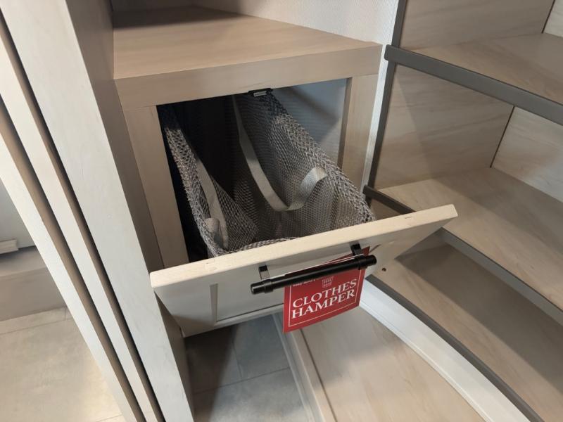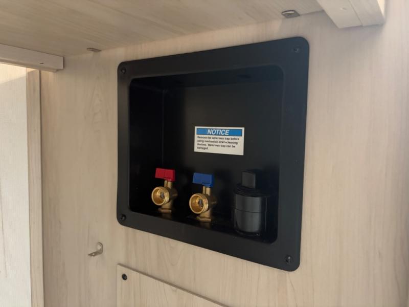 - Front wardrobe, slide-top dresser, and washer/dryer prep