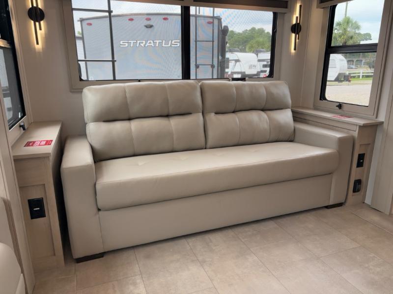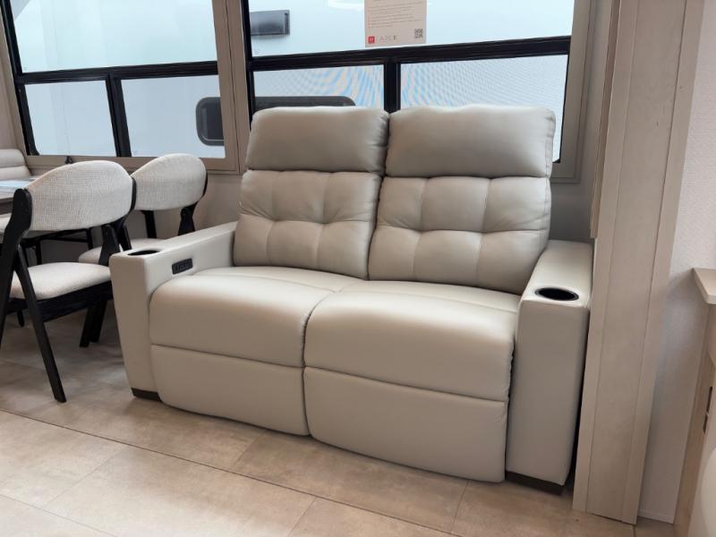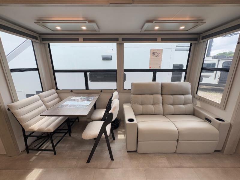 - Spacious main living area with theater seating, free-standing dinette, and tri-fold sofa