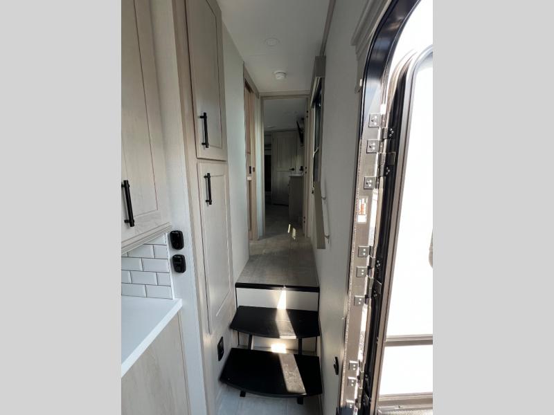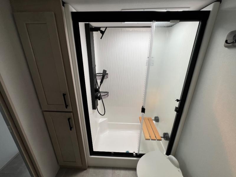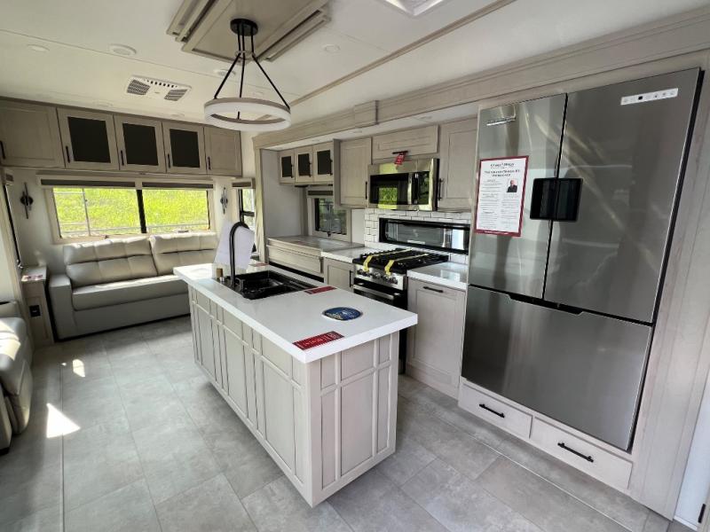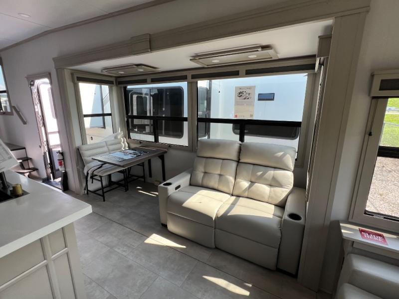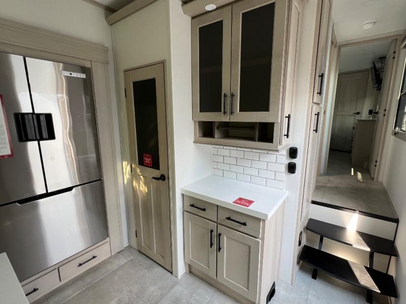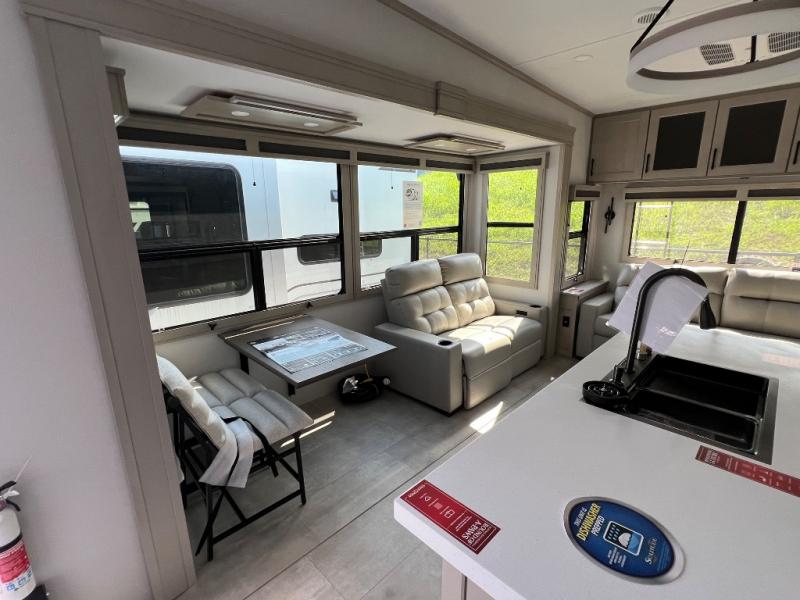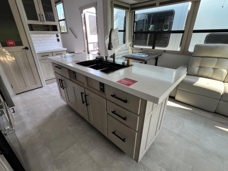 Are you looking to upgrade from a travel trailer to a fifth wheel? If so, this model will be perfect for you! Once you arrive at the campground, you can unload your gear from the pass-through storage, put out the two power awnings, then relax with a cold drink. Inside, you can kick your feet up on the theater seating, play a game at the free-standing dinette, or relax on the tri-fold sofa. The chef of your group will have a kitchen island with a Smart sink, dishwasher prep if you want the option to make cleaning up easier, plus a spacious 20 cu. ft. 12V refrigerator. There is also a built-in oven, plus a pantry and a hutch for storage galore! Having two bath sinks in the full bath is sure to be a big convenience when getting ready for bed, and the queen bed slide out in the front bedroom will provide a great night's rest. You will also find a front wardrobe, a slide top dresser, plus washer/dryer prep!