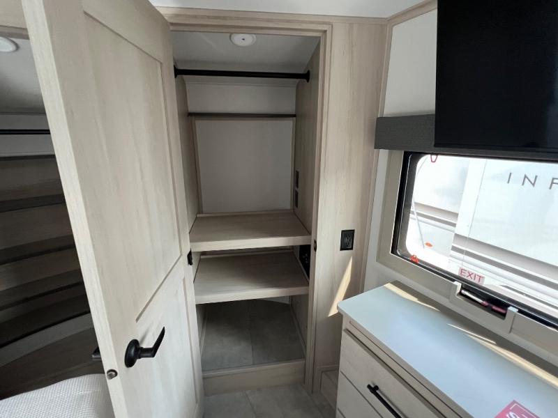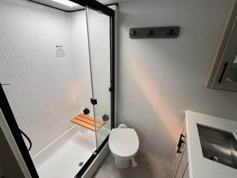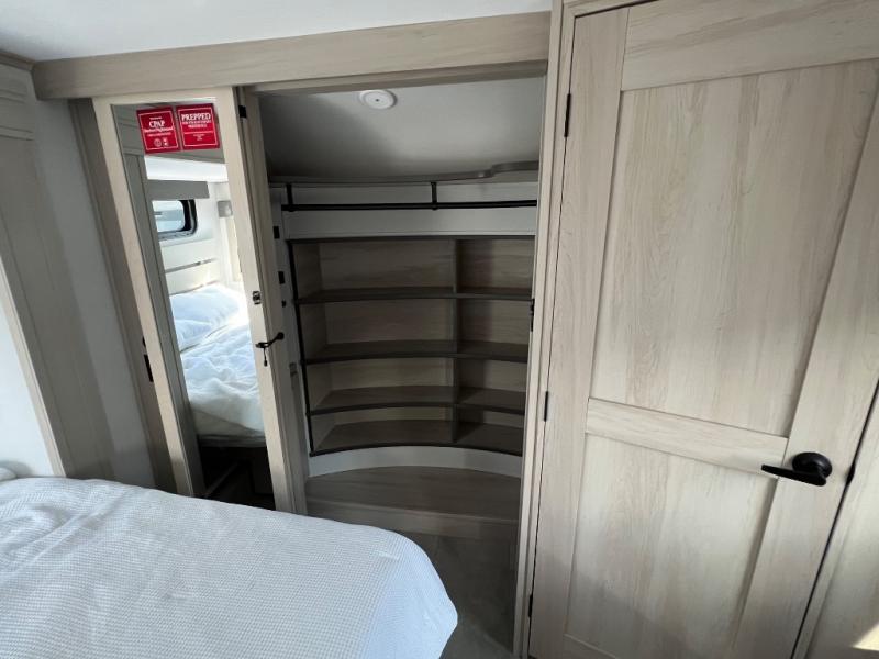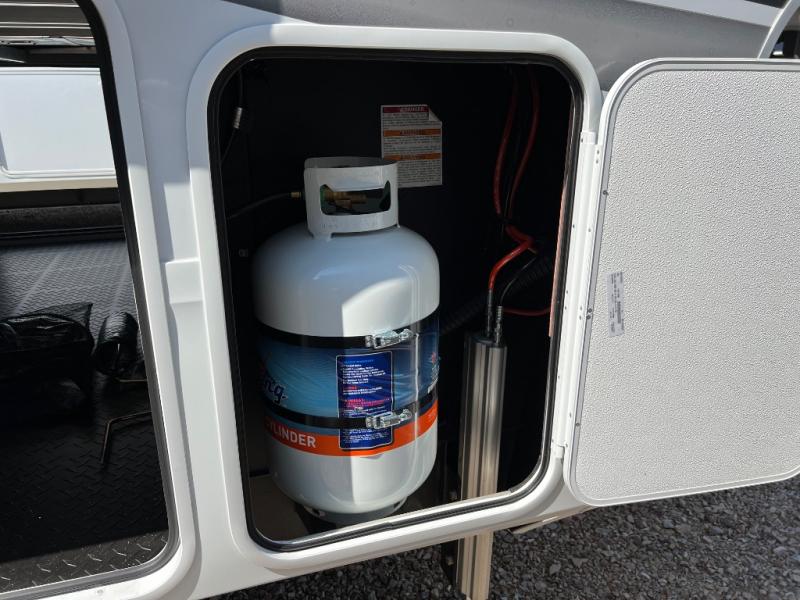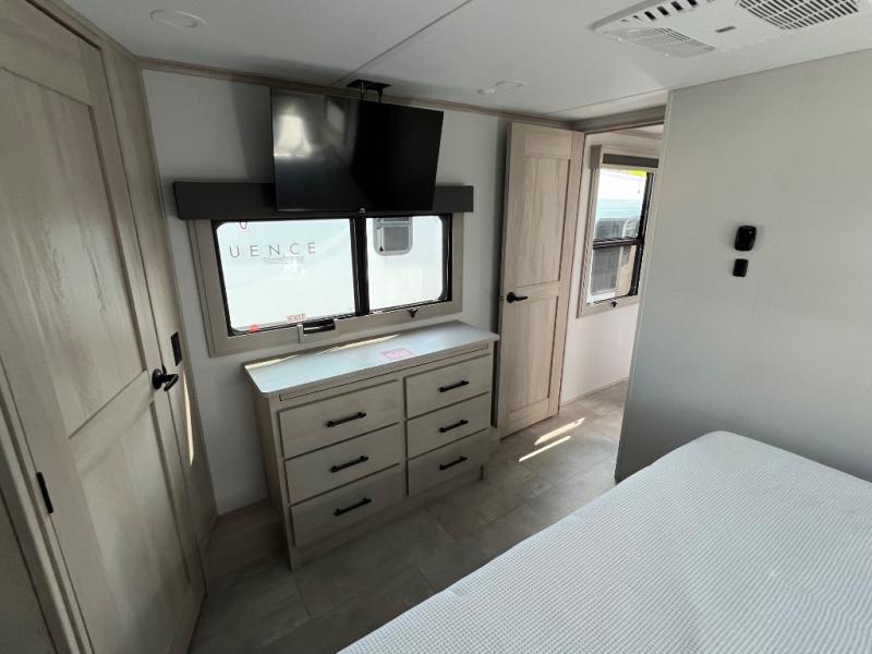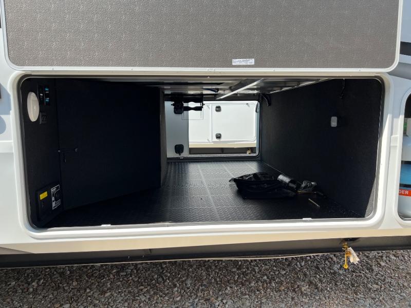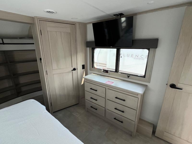 Are you looking to upgrade from a travel trailer to a fifth wheel? If so, this model will be perfect for you! Once you arrive at the campground, you can unload your gear from the pass-through storage, put out the two power awnings, then relax with a cold drink. Inside, you can kick your feet up on the theater seating, play a game at the free-standing dinette, or relax on the tri-fold sofa. The chef of your group will have a kitchen island with a Smart sink, dishwasher prep if you want the option to make cleaning up easier, plus a spacious 20 cu. ft. 12V refrigerator. There is also a built-in oven, plus a pantry and a hutch for storage galore! Having two bath sinks in the full bath is sure to be a big convenience when getting ready for bed, and the queen bed slide out in the front bedroom will provide a great night's rest. You will also find a front wardrobe, a slide top dresser, plus washer/dryer prep!