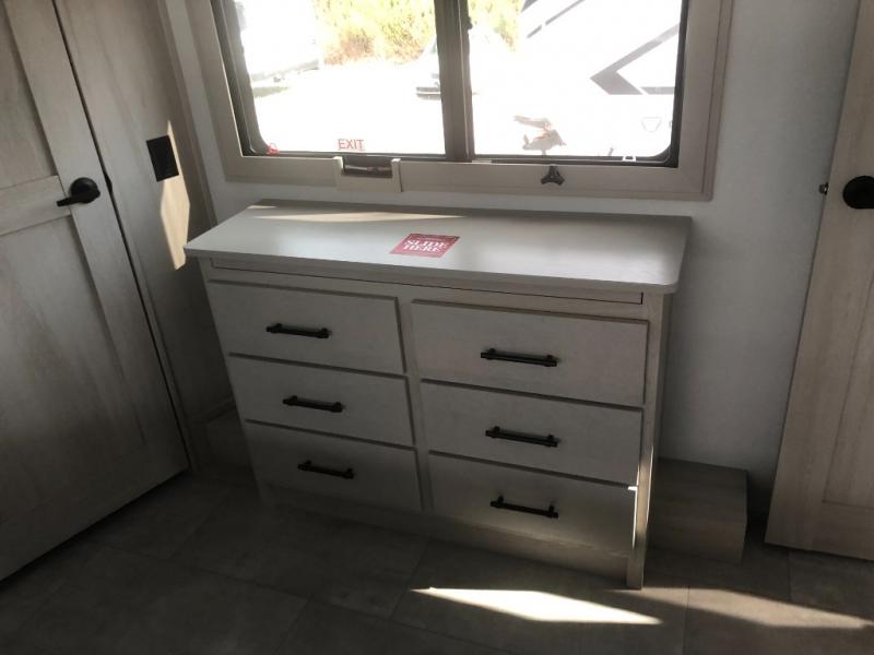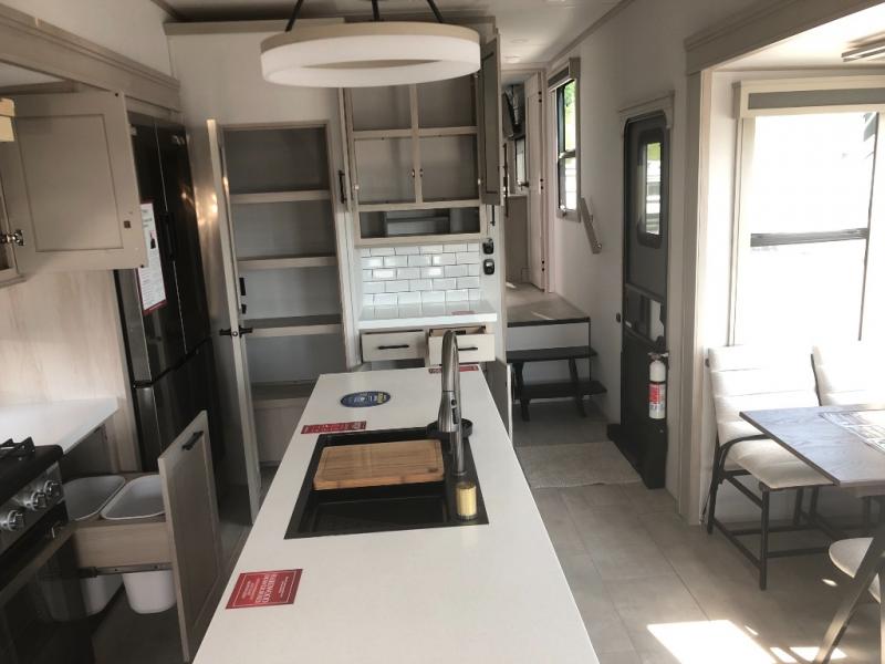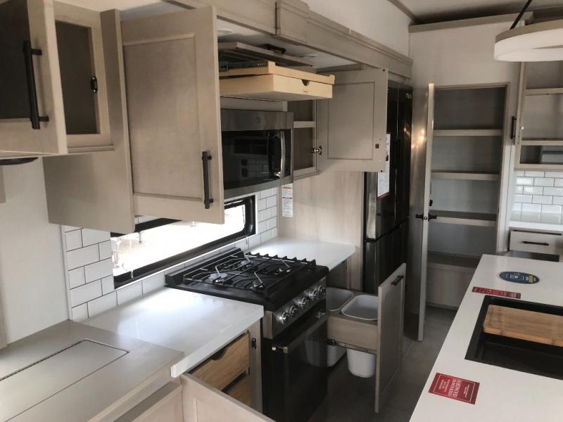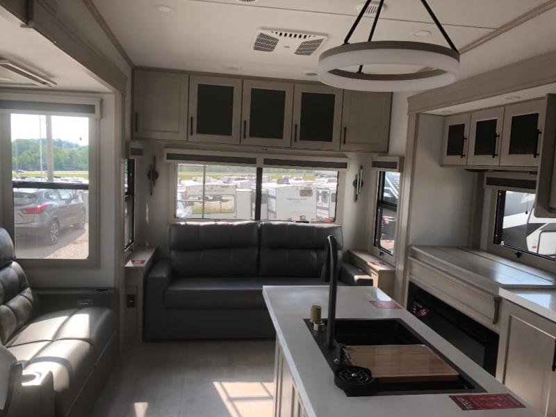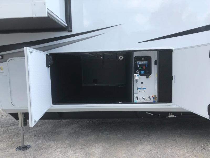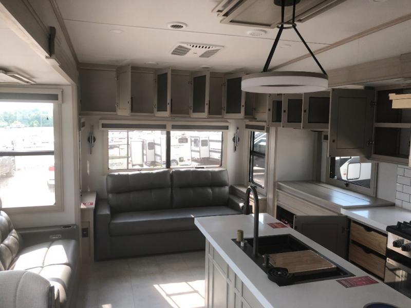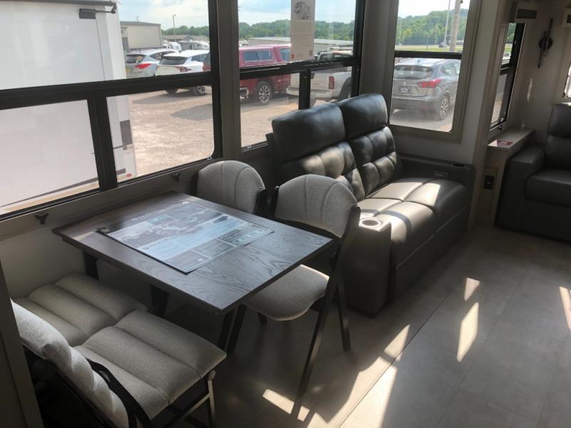 Are you looking to upgrade from a travel trailer to a fifth wheel? If so, this model will be perfect for you! Once you arrive at the campground, you can unload your gear from the pass-through storage, put out the two power awnings, then relax with a cold drink. Inside, you can kick your feet up on the theater seating, play a game at the free-standing dinette, or relax on the tri-fold sofa. The chef of your group will have a kitchen island with a Smart sink, dishwasher prep if you want the option to make cleaning up easier, plus a spacious 20 cu. ft. 12V refrigerator. There is also a built-in oven, plus a pantry and a hutch for storage galore! Having two bath sinks in the full bath is sure to be a big convenience when getting ready for bed, and the queen bed slide out in the front bedroom will provide a great night's rest. You will also find a front wardrobe, a slide top dresser, plus washer/dryer prep!