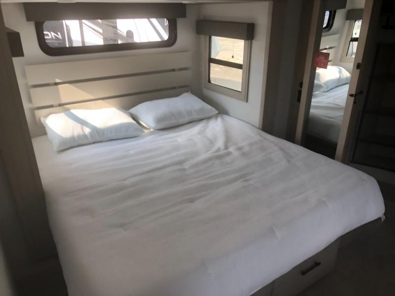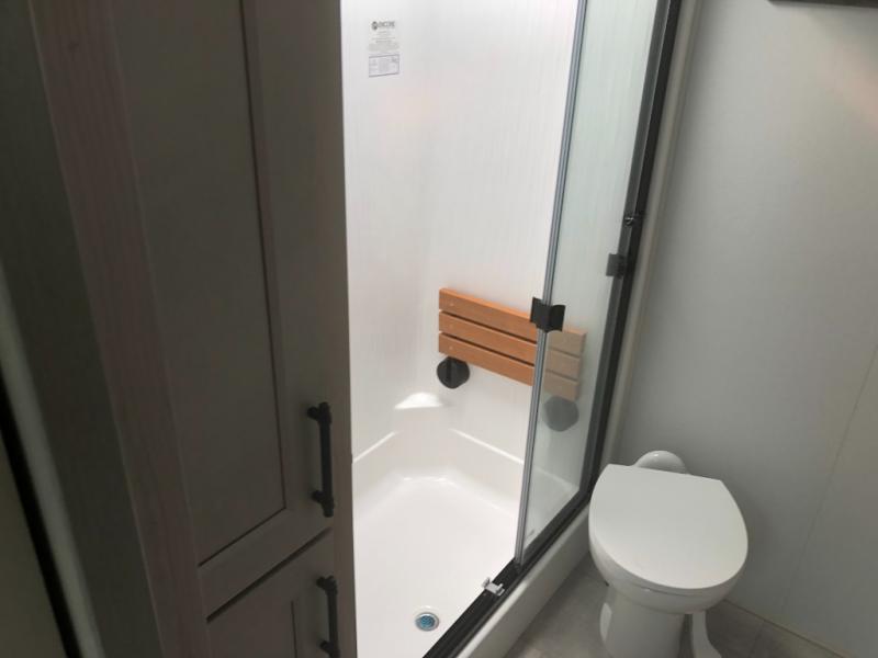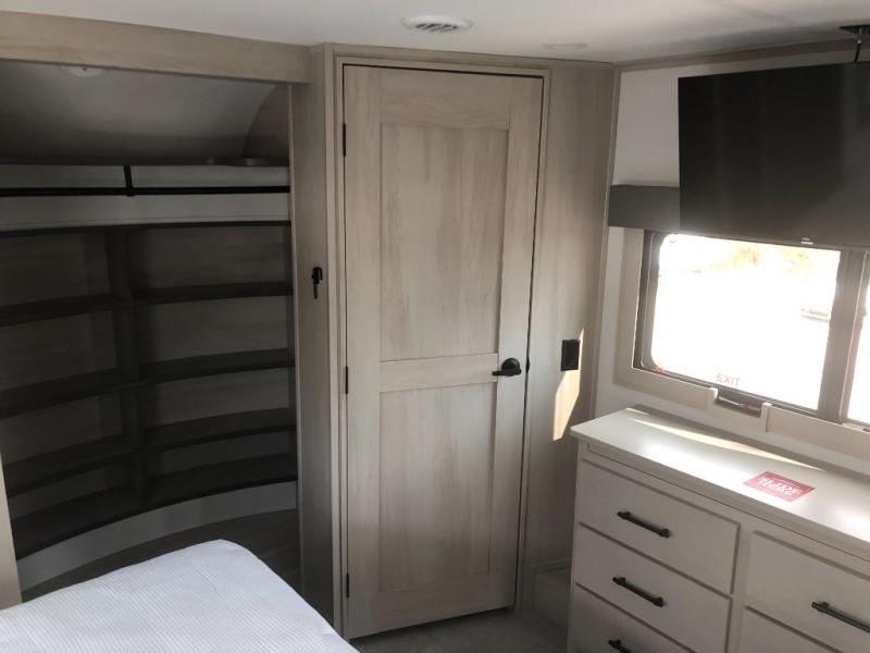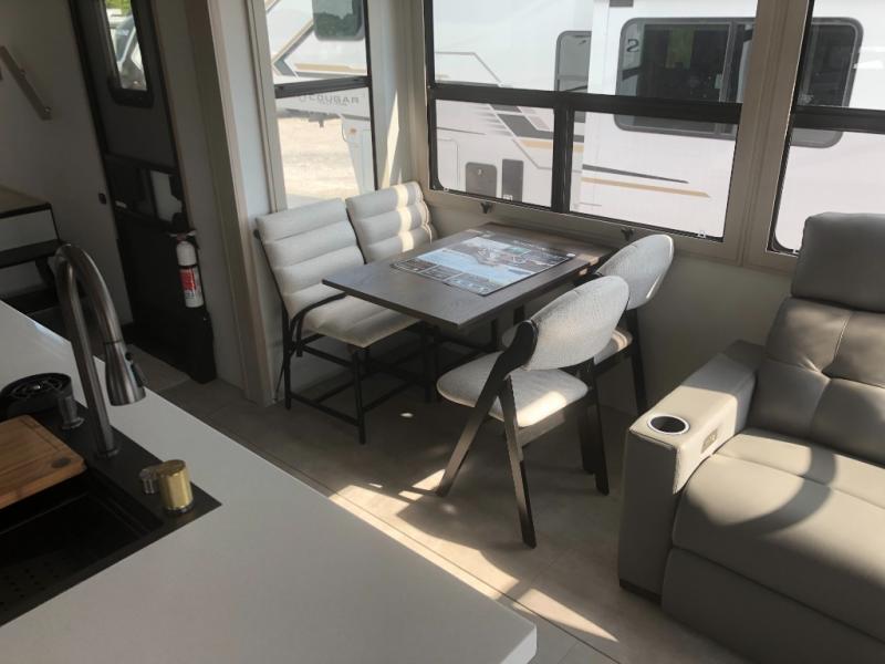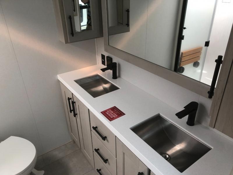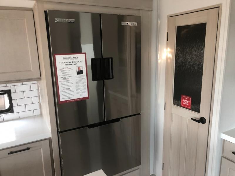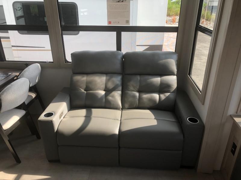 Are you looking to upgrade from a travel trailer to a fifth wheel? If so, this model will be perfect for you! Once you arrive at the campground, you can unload your gear from the pass-through storage, put out the two power awnings, then relax with a cold drink. Inside, you can kick your feet up on the theater seating, play a game at the free-standing dinette, or relax on the tri-fold sofa. The chef of your group will have a kitchen island with a Smart sink, dishwasher prep if you want the option to make cleaning up easier, plus a spacious 20 cu. ft. 12V refrigerator. There is also a built-in oven, plus a pantry and a hutch for storage galore! Having two bath sinks in the full bath is sure to be a big convenience when getting ready for bed, and the queen bed slide out in the front bedroom will provide a great night's rest. You will also find a front wardrobe, a slide top dresser, plus washer/dryer prep!