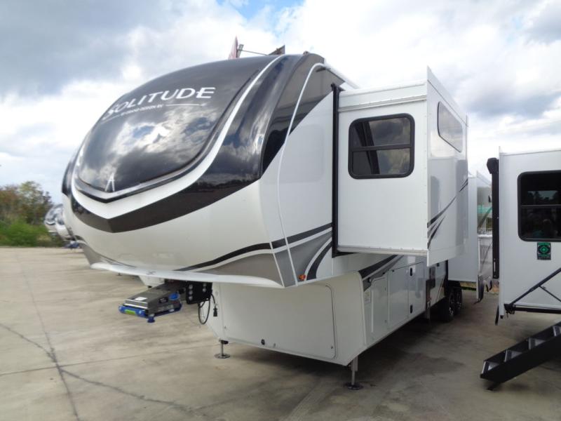 Each Solitude fifth wheel by Grand Design features a 101" wide-body construction, heavy duty 8,000 lb. axles, frameless tinted windows, and high-gloss gel coat sidewalls. You can camp year around thanks to the Weather-Tek Package that includes a 35K BTU high-capacity furnace, an all-in-one enclosed and heated utility center, and a fully enclosed underbelly with heated tanks and storage. Inside, you'll love the premium roller shades, hardwood cabinet doors, solid surface countertops, plus residential finishes throughout to make you truly feel at home. Each model also includes a MORryde CRE3000 suspension system, self adjusting brakes, and a MORryde pin box that will provide smooth towing from home to campground. Affordable luxury is possible with the Solitude fifth wheels; choose yours today!