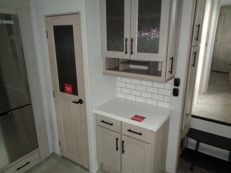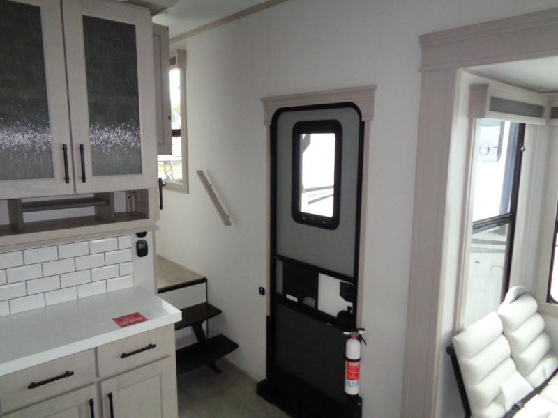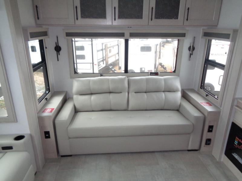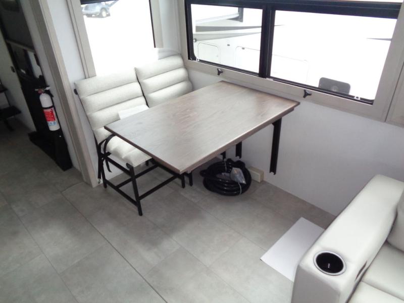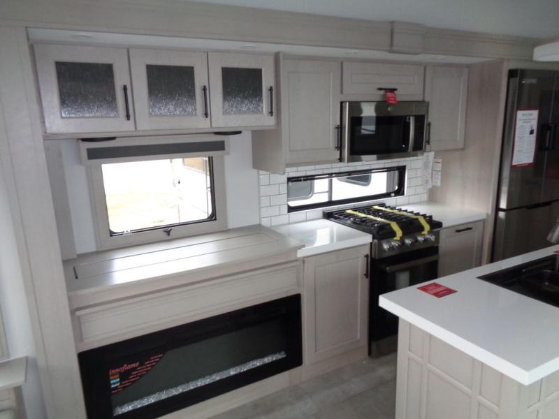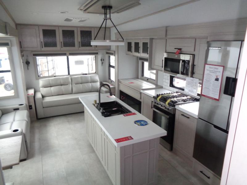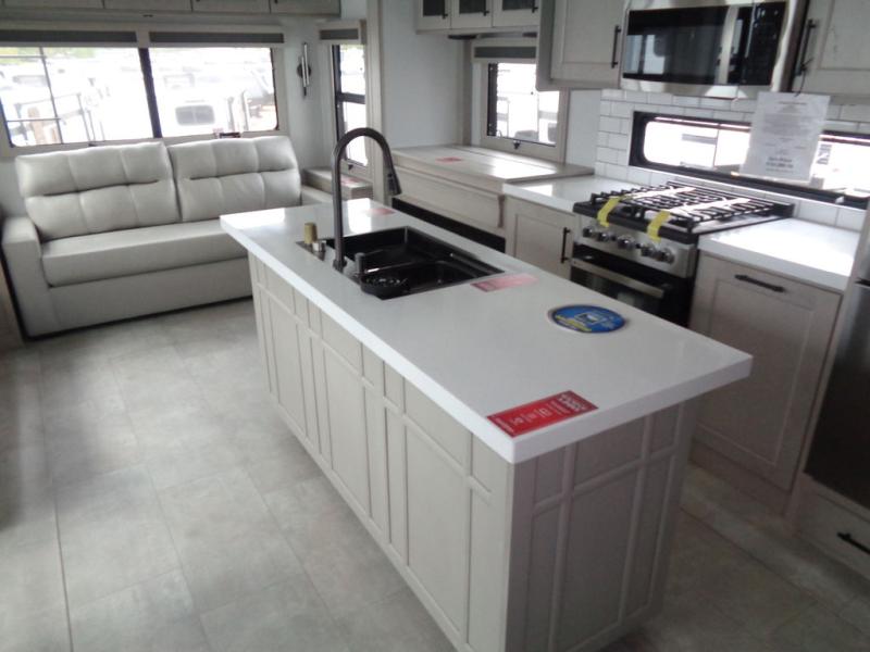 Are you looking to upgrade from a travel trailer to a fifth wheel? If so, this model will be perfect for you! Once you arrive at the campground, you can unload your gear from the pass-through storage, put out the two power awnings, then relax with a cold drink. Inside, you can kick your feet up on the theater seating, play a game at the free-standing dinette, or relax on the tri-fold sofa. The chef of your group will have a kitchen island with a Smart sink, dishwasher prep if you want the option to make cleaning up easier, plus a spacious 20 cu. ft. 12V refrigerator. There is also a built-in oven, plus a pantry and a hutch for storage galore! Having two bath sinks in the full bath is sure to be a big convenience when getting ready for bed, and the queen bed slide out in the front bedroom will provide a great night's rest. You will also find a front wardrobe, a slide top dresser, plus washer/dryer prep!