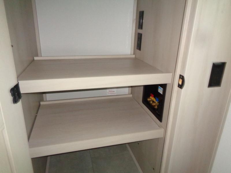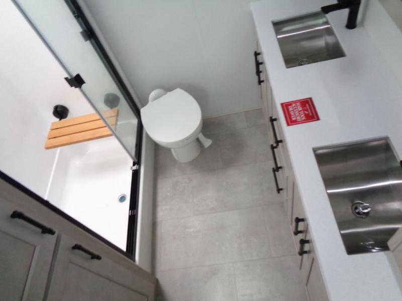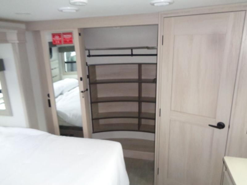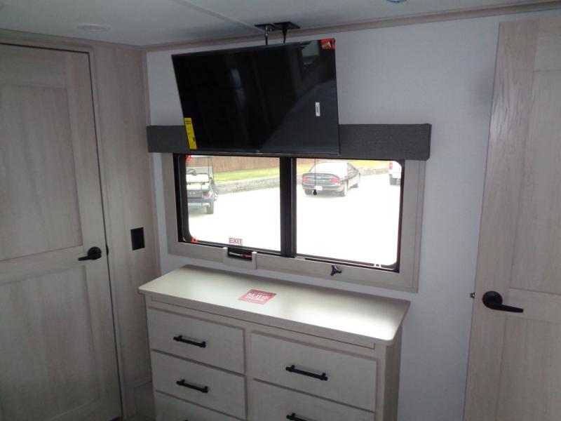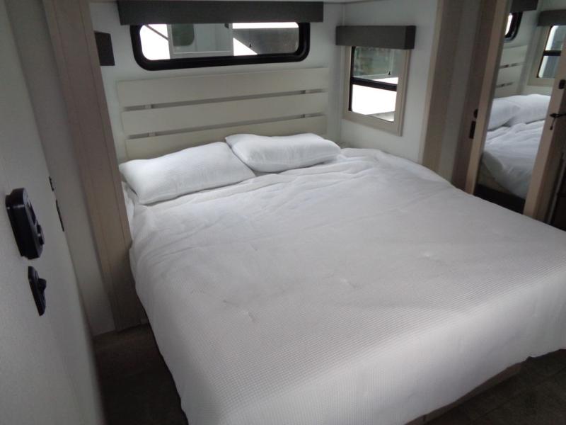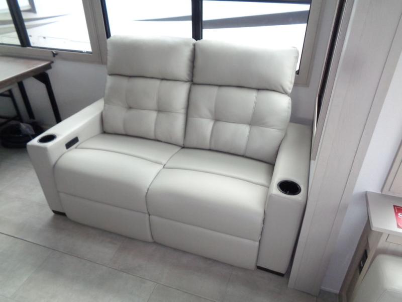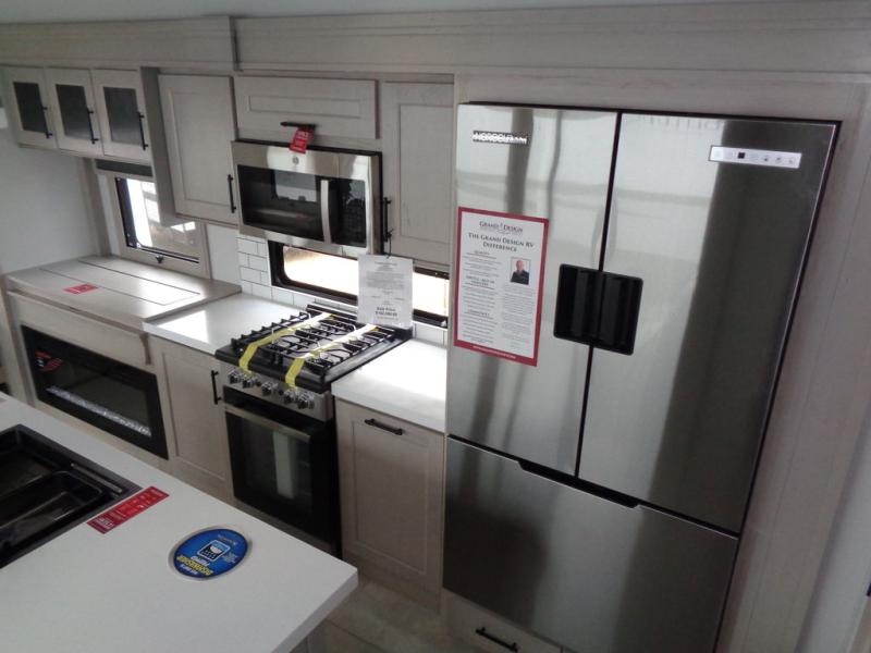 Are you looking to upgrade from a travel trailer to a fifth wheel? If so, this model will be perfect for you! Once you arrive at the campground, you can unload your gear from the pass-through storage, put out the two power awnings, then relax with a cold drink. Inside, you can kick your feet up on the theater seating, play a game at the free-standing dinette, or relax on the tri-fold sofa. The chef of your group will have a kitchen island with a Smart sink, dishwasher prep if you want the option to make cleaning up easier, plus a spacious 20 cu. ft. 12V refrigerator. There is also a built-in oven, plus a pantry and a hutch for storage galore! Having two bath sinks in the full bath is sure to be a big convenience when getting ready for bed, and the queen bed slide out in the front bedroom will provide a great night's rest. You will also find a front wardrobe, a slide top dresser, plus washer/dryer prep!