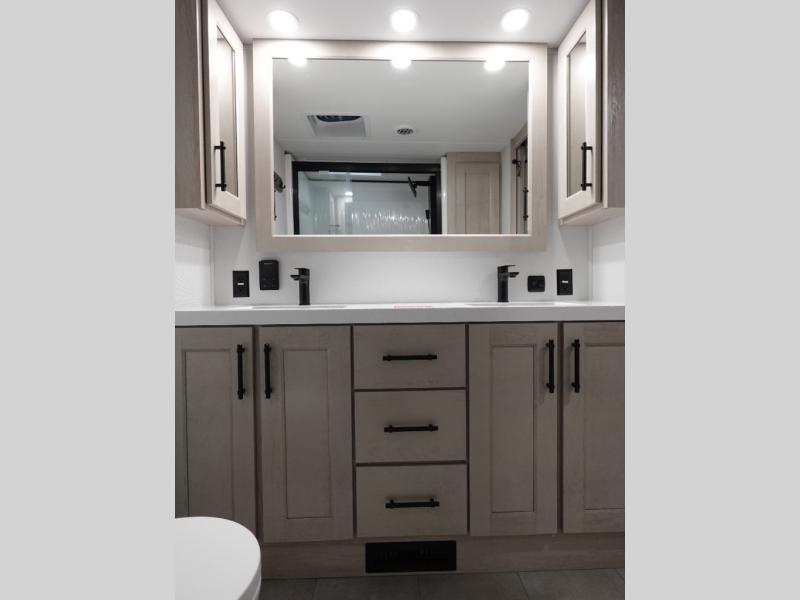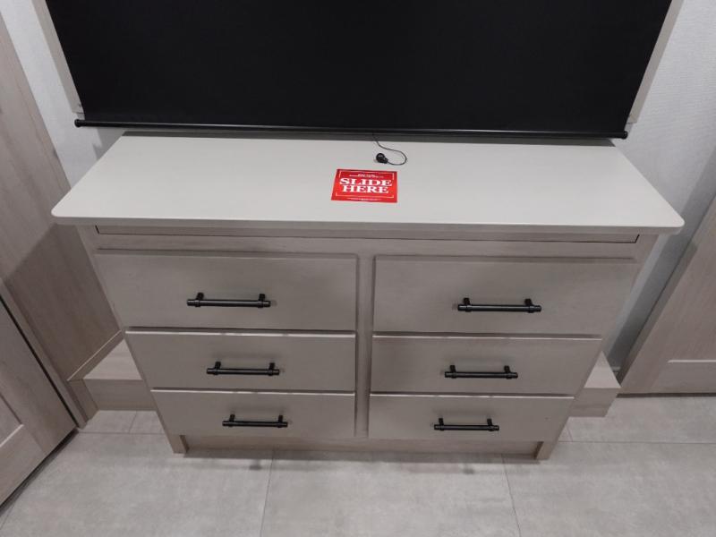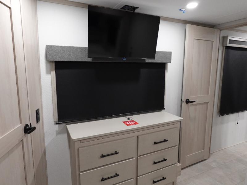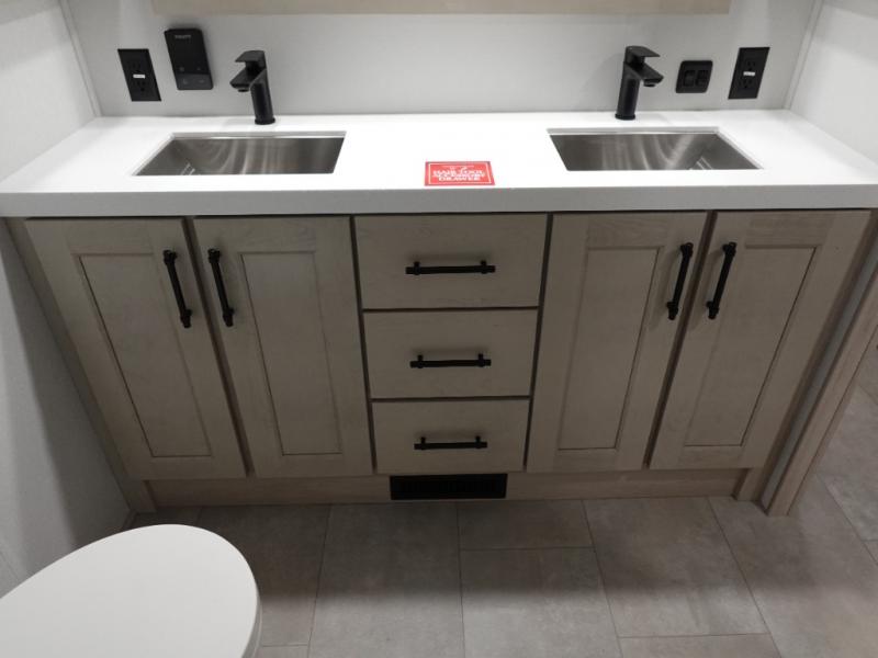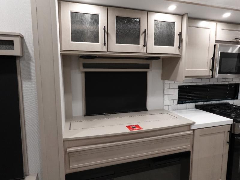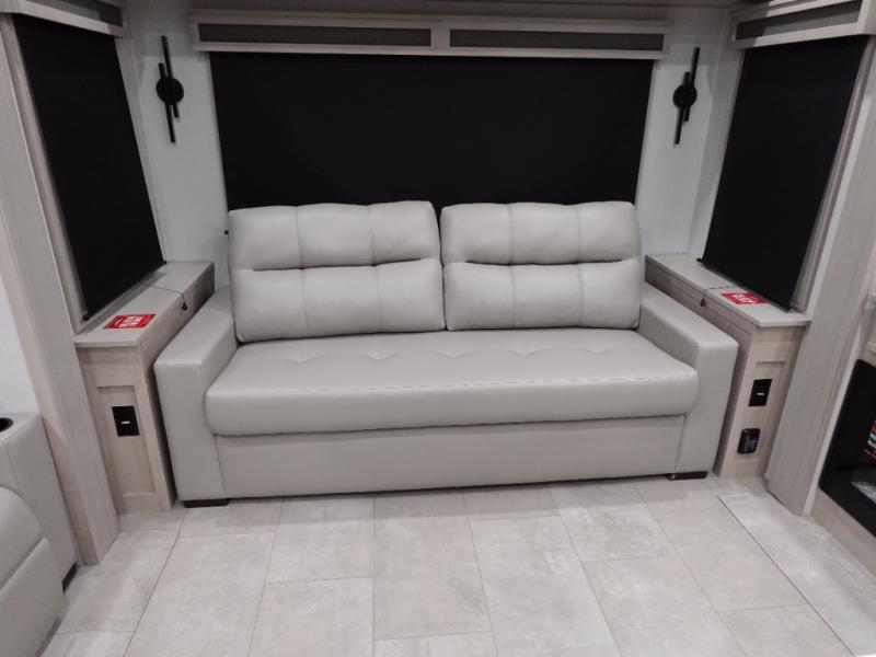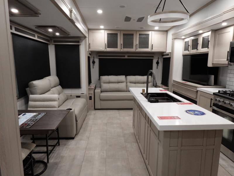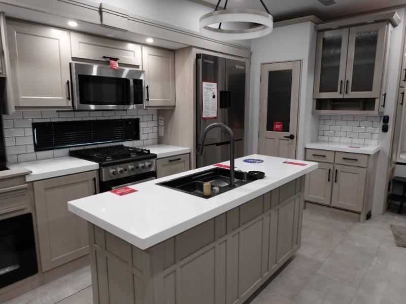Are you looking to upgrade from a travel trailer to a fifth wheel? If so, this model will be perfect for you! Once you arrive at the campground, you can unload your gear from the pass-through storage, put out the two power awnings, then relax with a cold drink. Inside, you can kick your feet up on the theater seating, play a game at the free-standing dinette, or relax on the tri-fold sofa. The chef of your group will have a kitchen island with a Smart sink, dishwasher prep if you want the option to make cleaning up easier, plus a spacious 20 cu. ft. 12V refrigerator. There is also a built-in oven, plus a pantry and a hutch for storage galore! Having two bath sinks in the full bath is sure to be a big convenience when getting ready for bed, and the king bed slide out in the front bedroom will provide a great night's rest. You will also find a front wardrobe, a slide top dresser, plus washer/dryer prep!