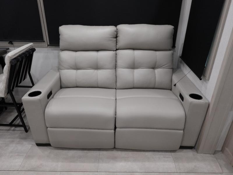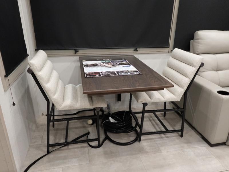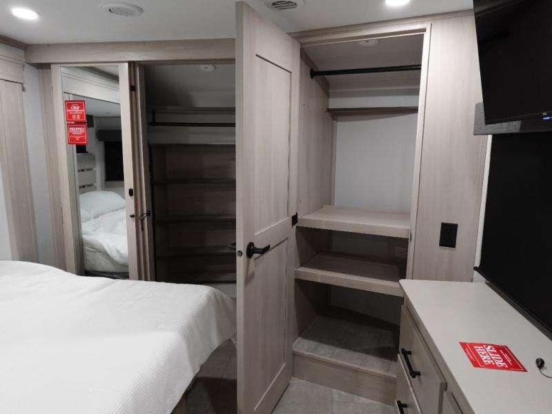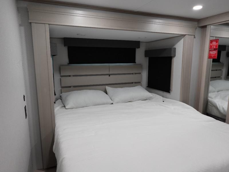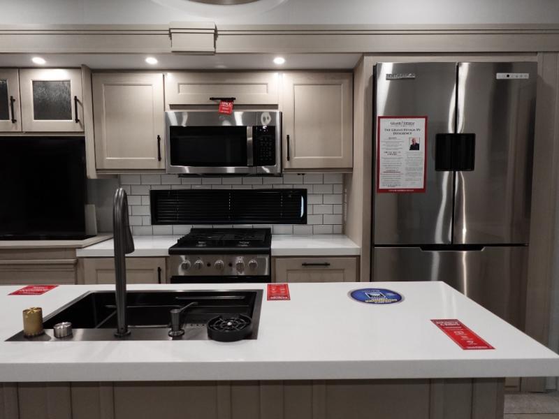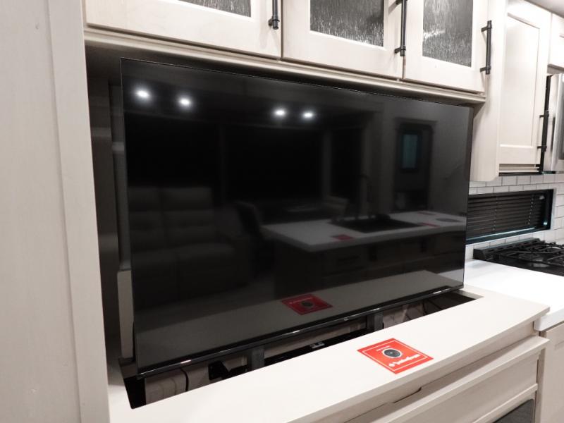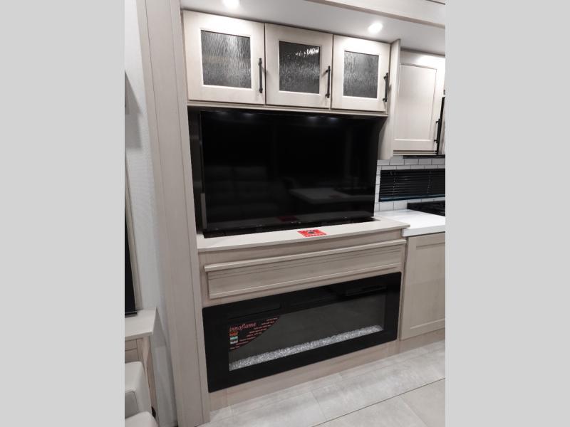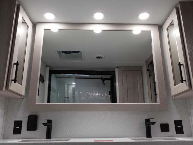 Are you looking to upgrade from a travel trailer to a fifth wheel? If so, this model will be perfect for you! Once you arrive at the campground, you can unload your gear from the pass-through storage, put out the two power awnings, then relax with a cold drink. Inside, you can kick your feet up on the theater seating, play a game at the free-standing dinette, or relax on the tri-fold sofa. The chef of your group will have a kitchen island with a Smart sink, dishwasher prep if you want the option to make cleaning up easier, plus a spacious 20 cu. ft. 12V refrigerator. There is also a built-in oven, plus a pantry and a hutch for storage galore! Having two bath sinks in the full bath is sure to be a big convenience when getting ready for bed, and the king bed slide out in the front bedroom will provide a great night's rest. You will also find a front wardrobe, a slide top dresser, plus washer/dryer prep!