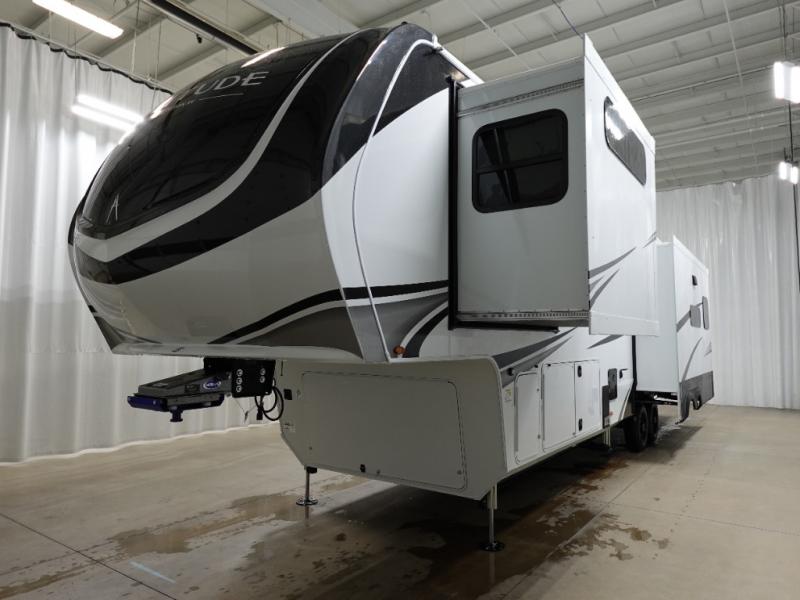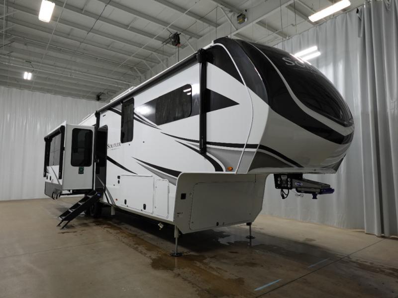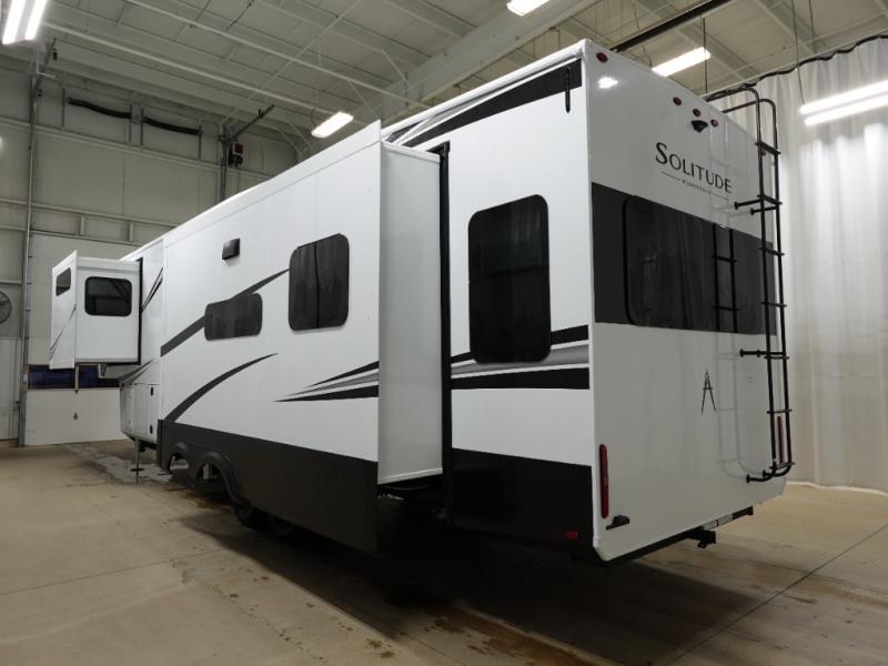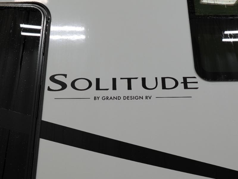 Each Solitude fifth wheel by Grand Design features a 101" wide-body construction, heavy duty 8,000 lb. axles, frameless tinted windows, and high-gloss gel coat sidewalls. You can camp year around thanks to the Weather-Tek Package that includes a 35K BTU high-capacity furnace, an all-in-one enclosed and heated utility center, and a fully enclosed underbelly with heated tanks and storage. Inside, you'll love the premium roller shades, hardwood cabinet doors, solid surface countertops, plus residential finishes throughout to make you truly feel at home. Each model also includes a MORryde CRE3000 suspension system, self adjusting brakes, and a MORryde pin box that will provide smooth towing from home to campground. Affordable luxury is possible with the Solitude fifth wheels; choose yours today!
