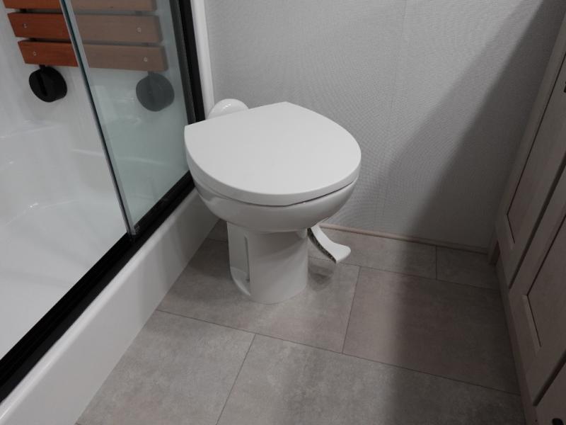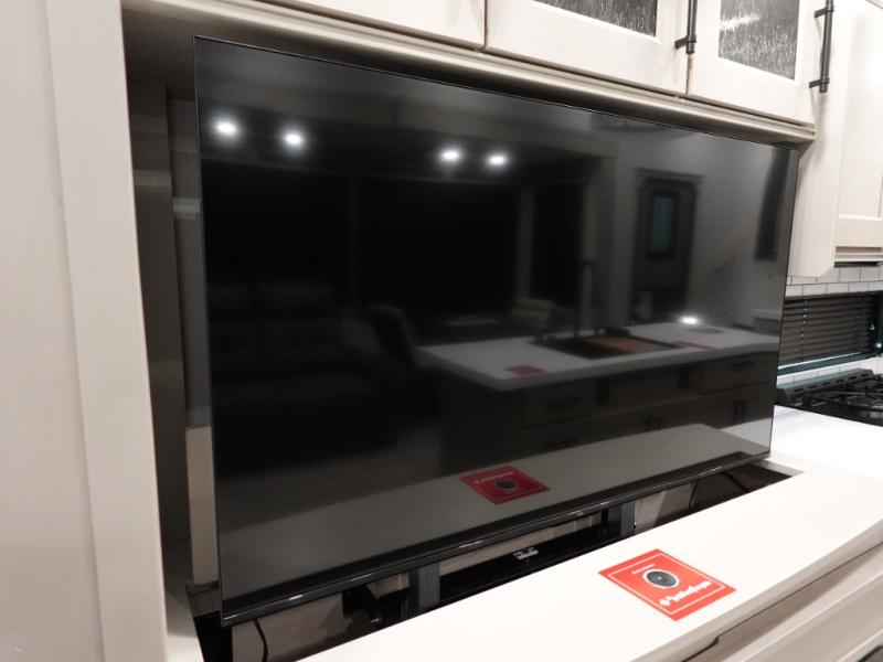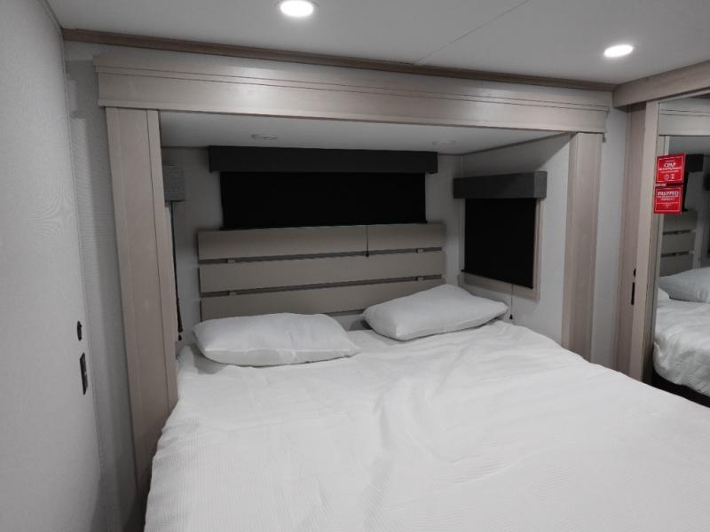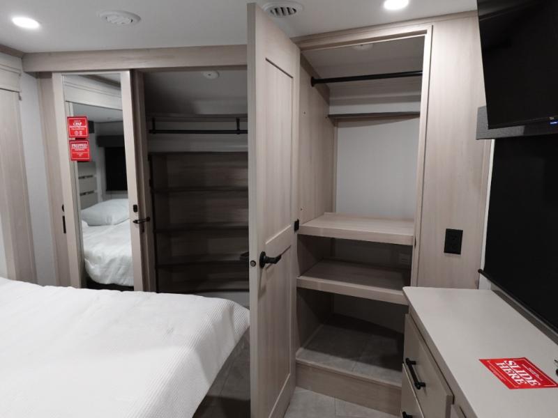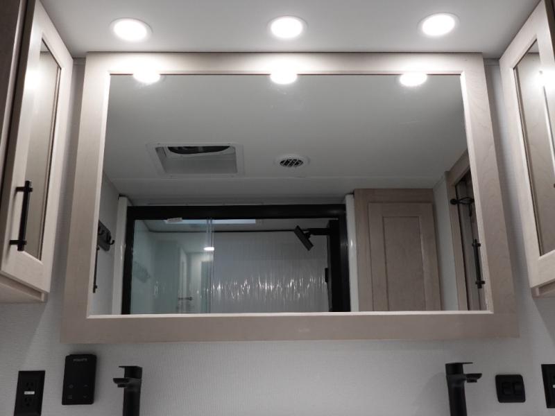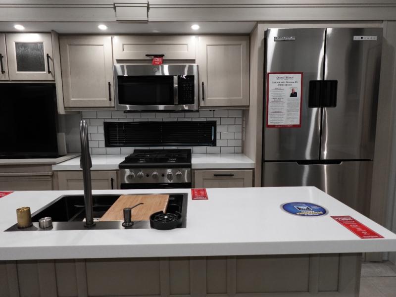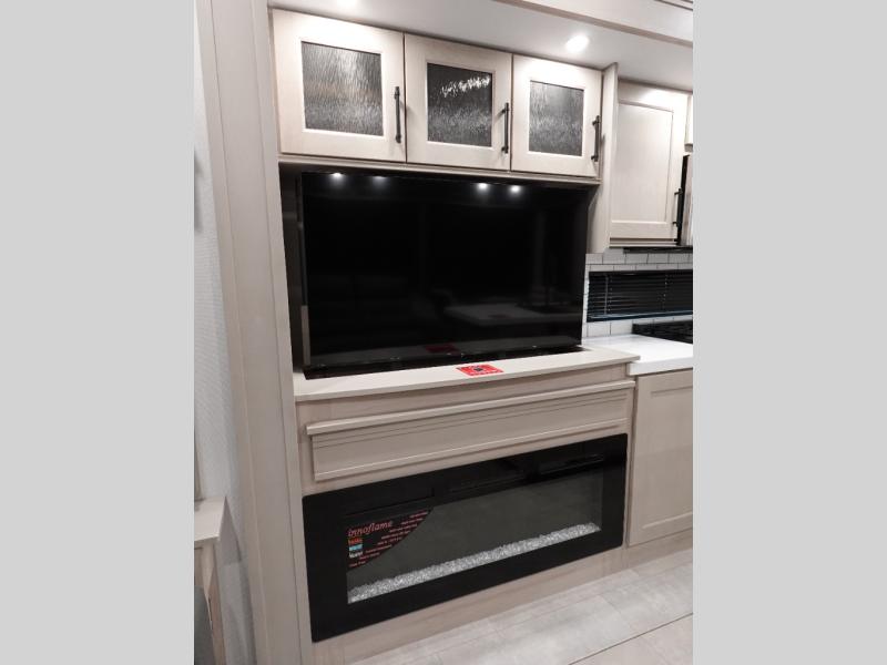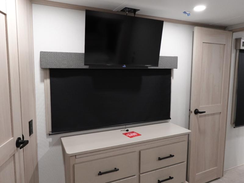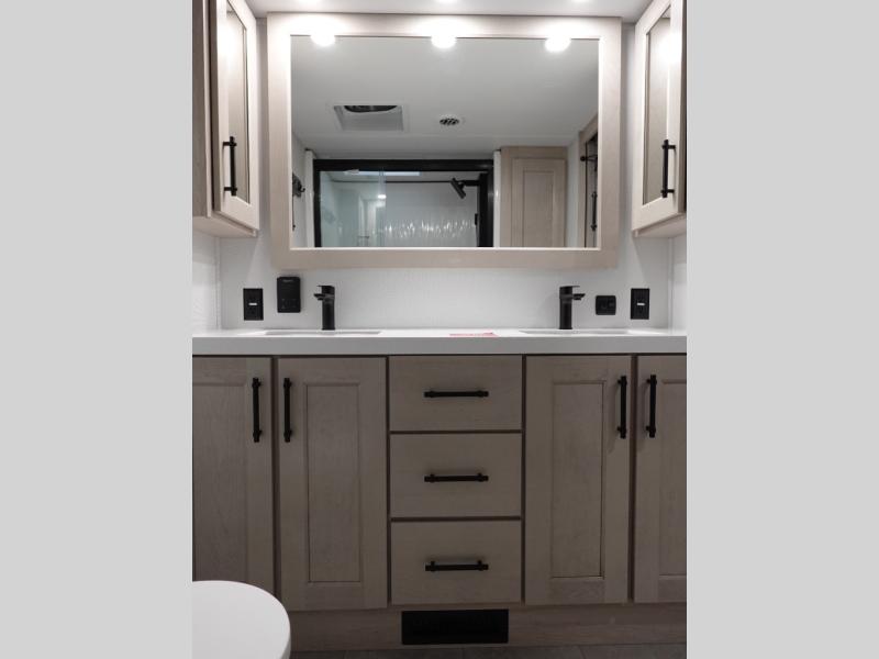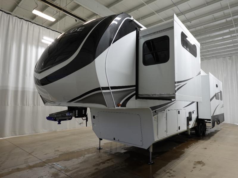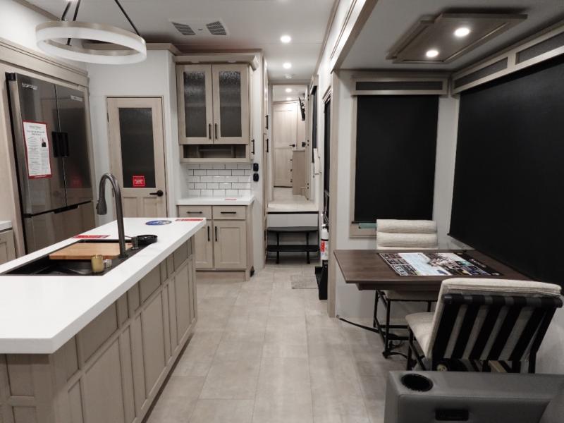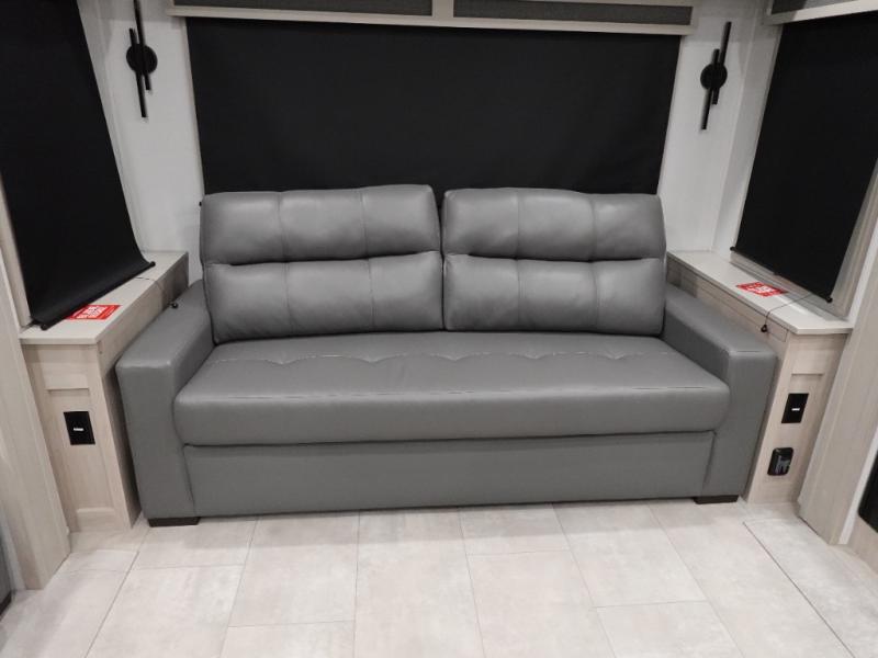 Are you looking to upgrade from a travel trailer to a fifth wheel? If so, this model will be perfect for you! Once you arrive at the campground, you can unload your gear from the pass-through storage, put out the two power awnings, then relax with a cold drink. Inside, you can kick your feet up on the theater seating, play a game at the free-standing dinette, or relax on the tri-fold sofa. The chef of your group will have a kitchen island with a Smart sink, dishwasher prep if you want the option to make cleaning up easier, plus a spacious 20 cu. ft. 12V refrigerator. There is also a built-in oven, plus a pantry and a hutch for storage galore! Having two bath sinks in the full bath is sure to be a big convenience when getting ready for bed, and the king bed slide out in the front bedroom will provide a great night's rest. You will also find a front wardrobe, a slide top dresser, plus washer/dryer prep!