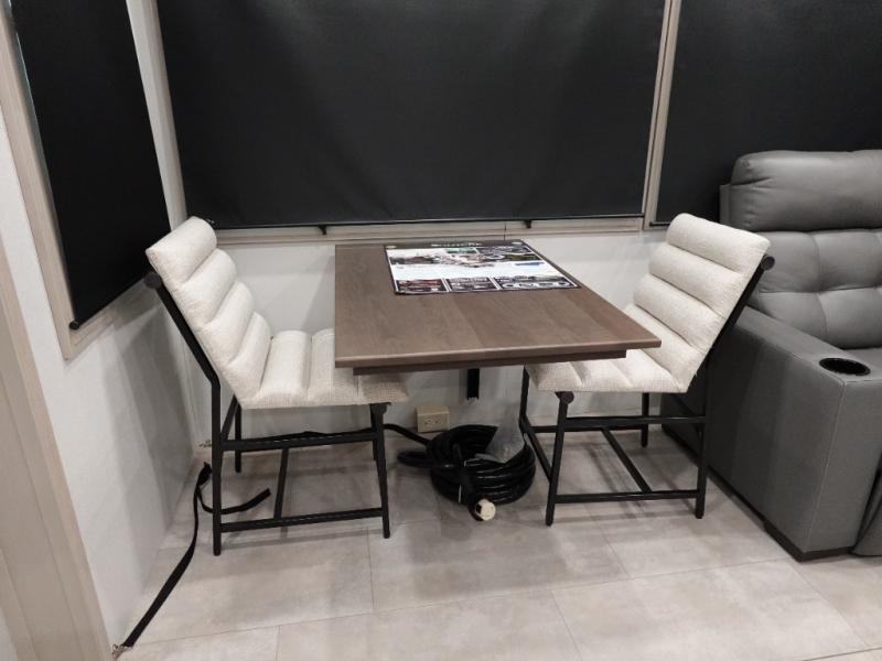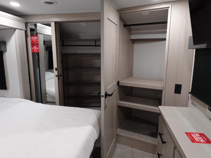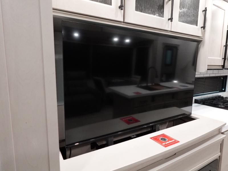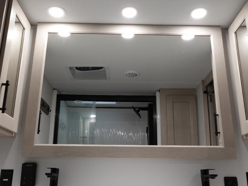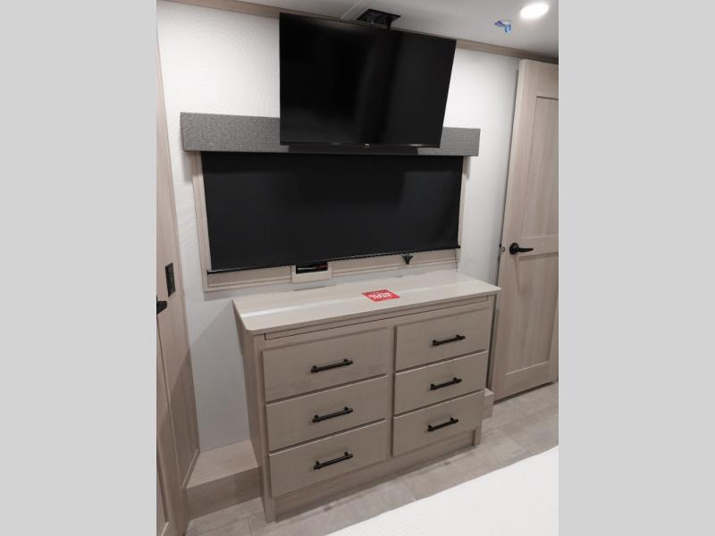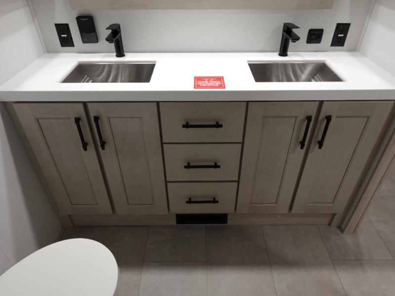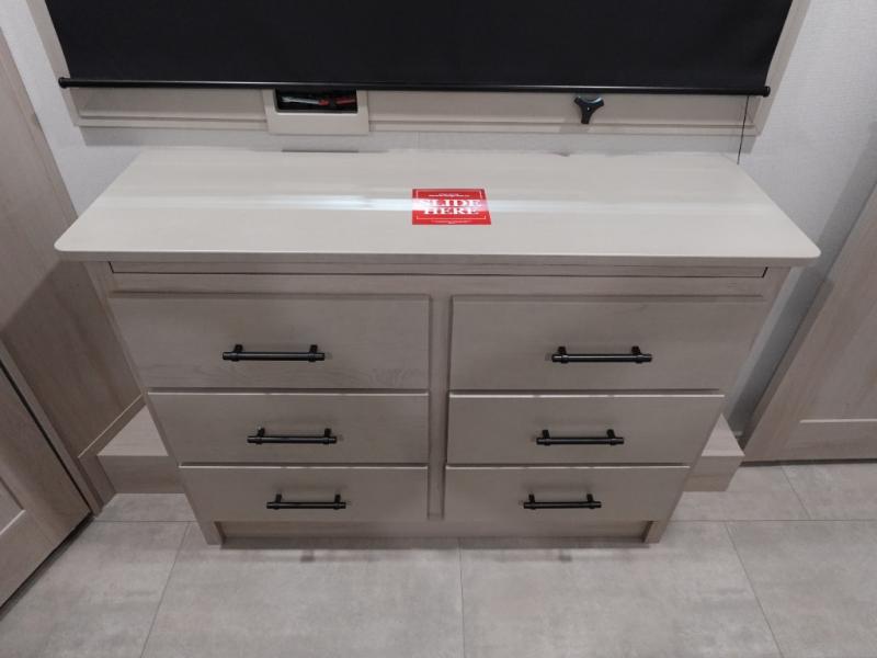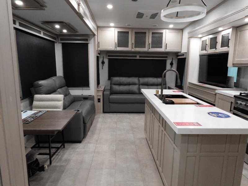 Are you looking to upgrade from a travel trailer to a fifth wheel? If so, this model will be perfect for you! Once you arrive at the campground, you can unload your gear from the pass-through storage, put out the two power awnings, then relax with a cold drink. Inside, you can kick your feet up on the theater seating, play a game at the free-standing dinette, or relax on the tri-fold sofa. The chef of your group will have a kitchen island with a Smart sink plus a spacious 20 cu. ft. 12V refrigerator. There is also a built-in oven, plus a pantry and a hutch for storage galore! Having two bath sinks in the full bath is sure to be a big convenience when getting ready for bed, and the King bed slide out in the front bedroom will provide a great night's rest. You will also find a front wardrobe, a slide top dresser, plus washer/dryer prep!