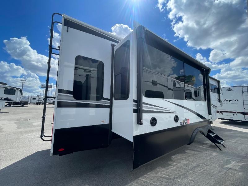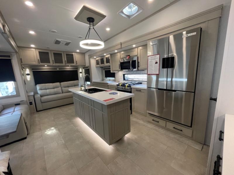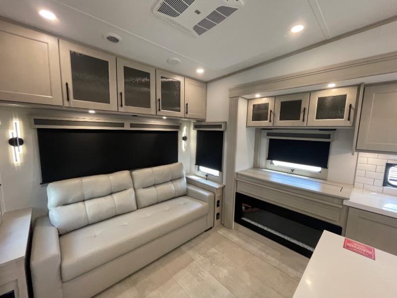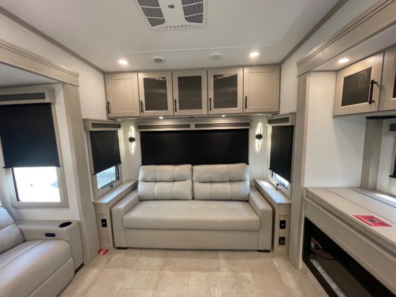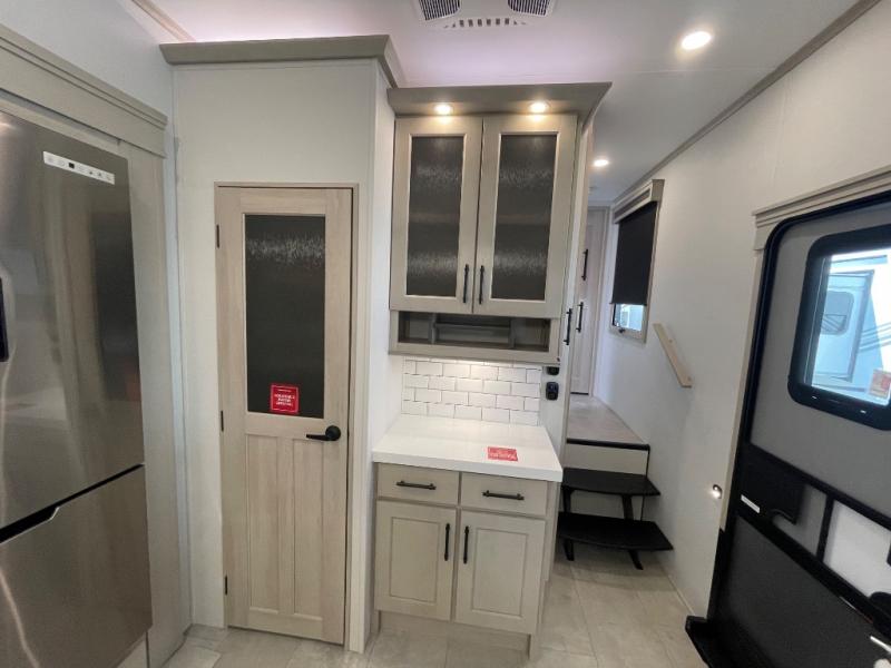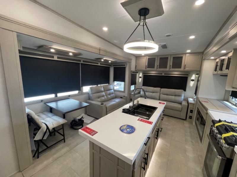 Are you looking to upgrade from a travel trailer to a fifth wheel? If so, this model will be perfect for you! Once you arrive at the campground, you can unload your gear from the pass-through storage, put out the two power awnings, then relax with a cold drink. Inside, you can kick your feet up on the theater seating, play a game at the free-standing dinette, or relax on the tri-fold sofa. The chef of your group will have a kitchen island with a Smart sink, dishwasher prep if you want the option to make cleaning up easier, plus a spacious 20 cu. ft. 12V refrigerator. There is also a built-in oven, plus a pantry and a hutch for storage galore! Having two bath sinks in the full bath is sure to be a big convenience when getting ready for bed, and the queen bed slide out in the front bedroom will provide a great night's rest. You will also find a front wardrobe, a slide top dresser, plus washer/dryer prep!