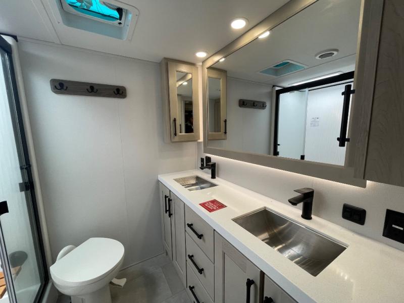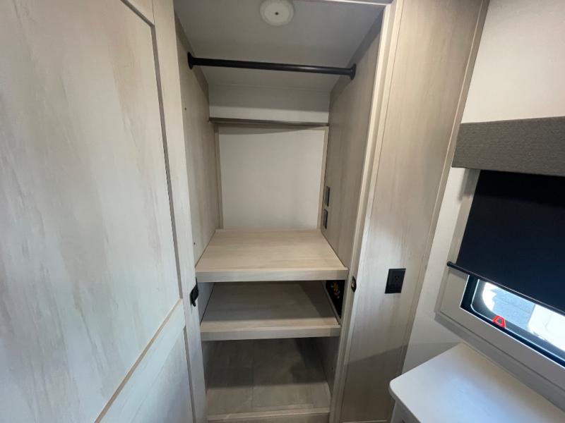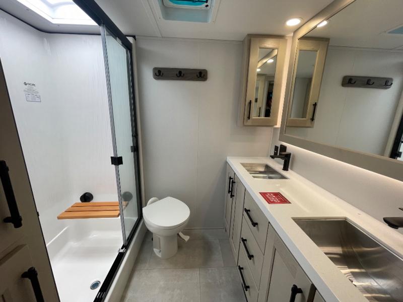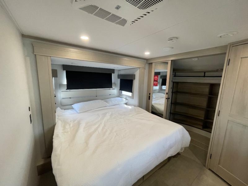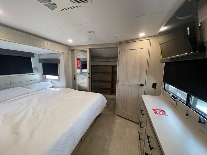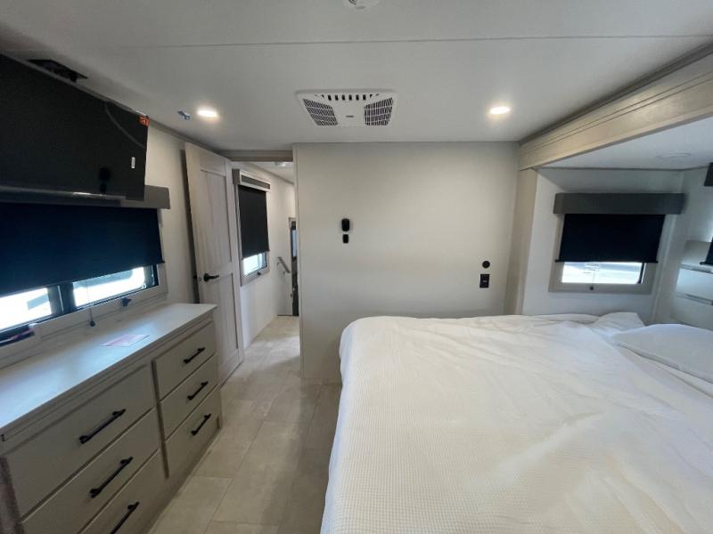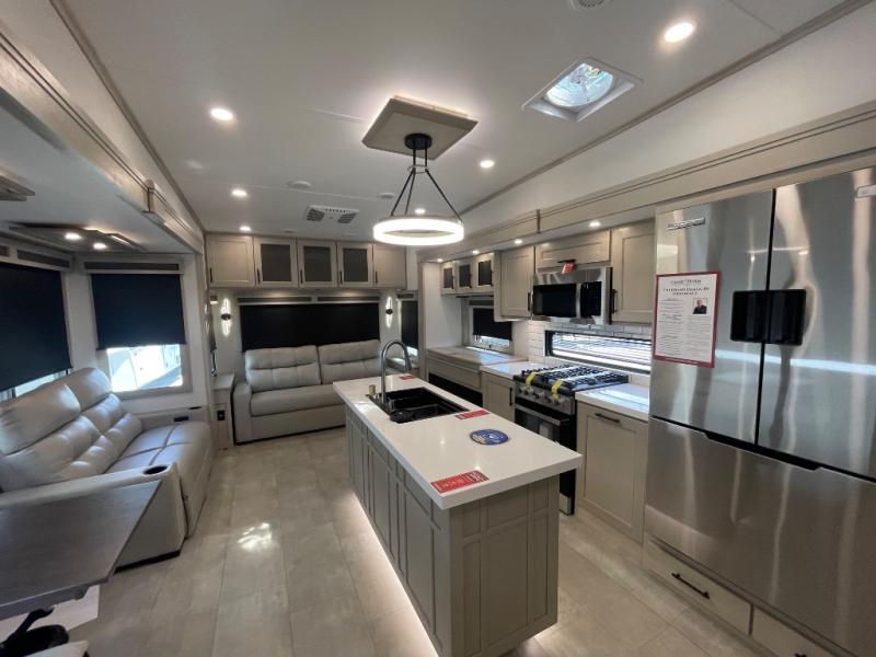Are you looking to upgrade from a travel trailer to a fifth wheel? If so, this model will be perfect for you! Once you arrive at the campground, you can unload your gear from the pass-through storage, put out the two power awnings, then relax with a cold drink. Inside, you can kick your feet up on the theater seating, play a game at the free-standing dinette, or relax on the tri-fold sofa. The chef of your group will have a kitchen island with a Smart sink, dishwasher prep if you want the option to make cleaning up easier, plus a spacious 20 cu. ft. 12V refrigerator. There is also a built-in oven, plus a pantry and a hutch for storage galore! Having two bath sinks in the full bath is sure to be a big convenience when getting ready for bed, and the queen bed slide out in the front bedroom will provide a great night's rest. You will also find a front wardrobe, a slide top dresser, plus washer/dryer prep!