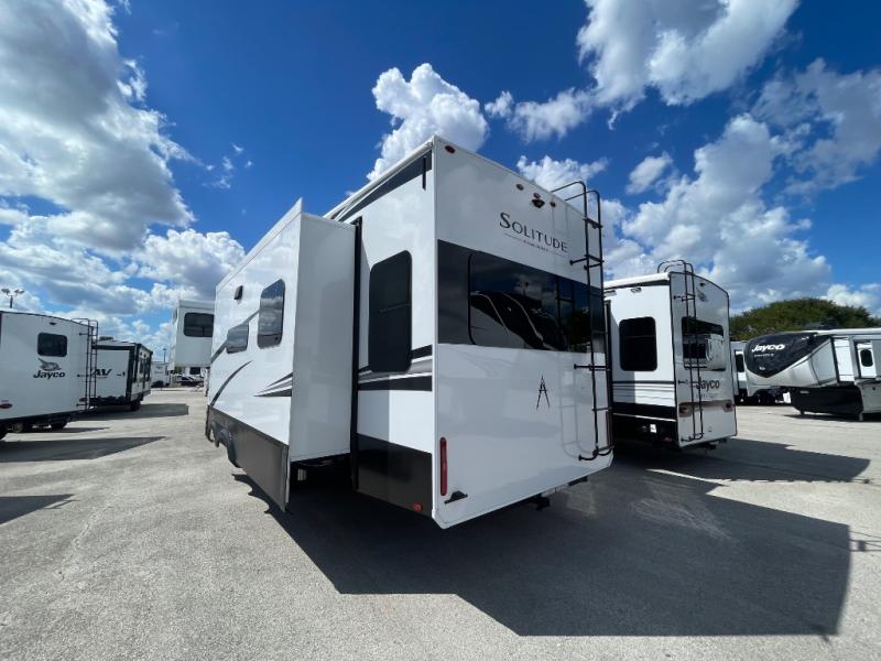 Each Solitude fifth wheel by Grand Design features a 101" wide-body construction, heavy duty 8,000 lb. axles, frameless tinted windows, and high-gloss gel coat sidewalls. You can camp year around thanks to the Weather-Tek Package that includes a 35K BTU high-capacity furnace, an all-in-one enclosed and heated utility center, and a fully enclosed underbelly with heated tanks and storage. Inside, you'll love the premium roller shades, hardwood cabinet doors, solid surface countertops, plus residential finishes throughout to make you truly feel at home. Each model also includes a MORryde CRE3000 suspension system, self adjusting brakes, and a MORryde pin box that will provide smooth towing from home to campground. Affordable luxury is possible with the Solitude fifth wheels; choose yours today!