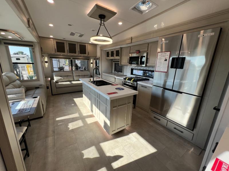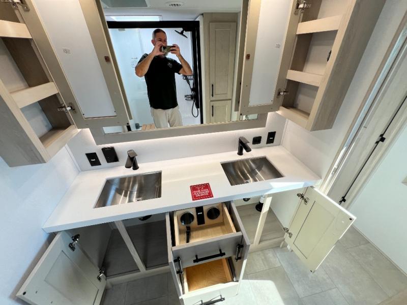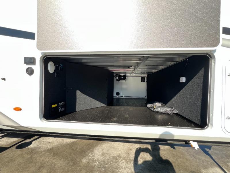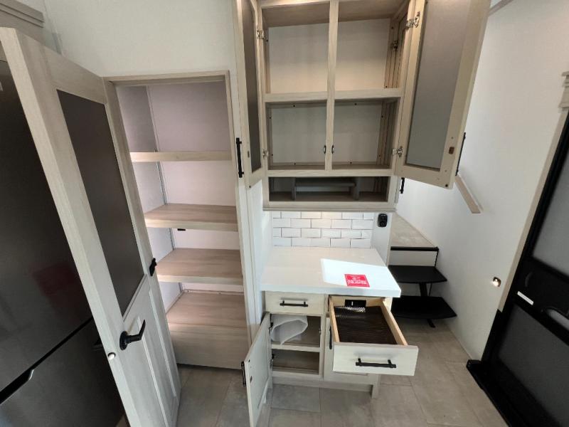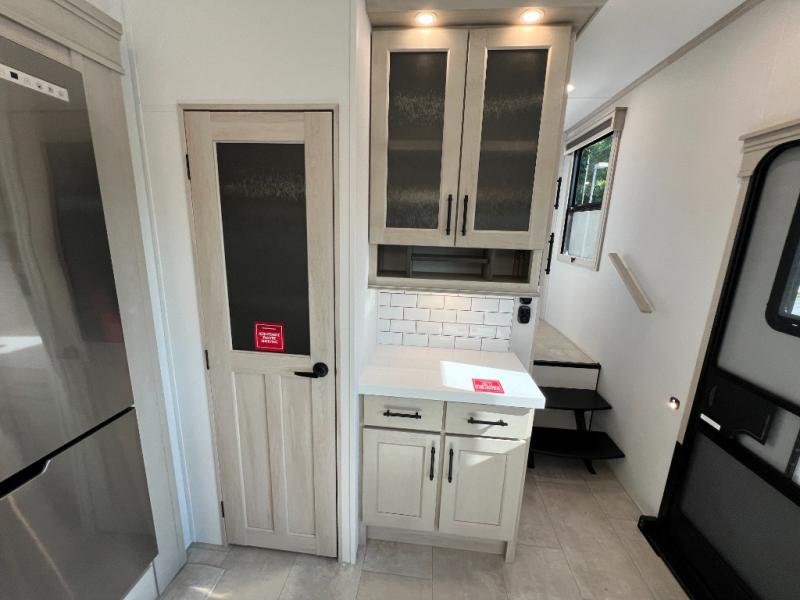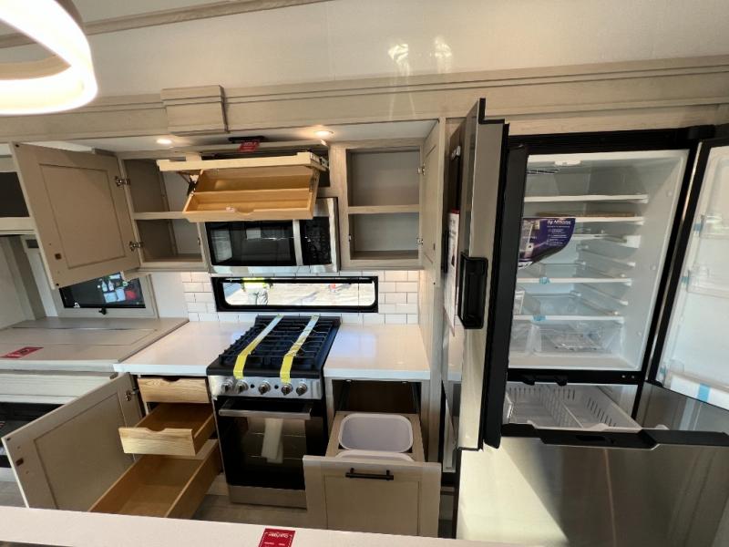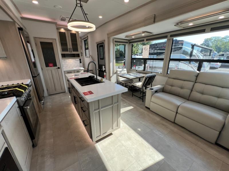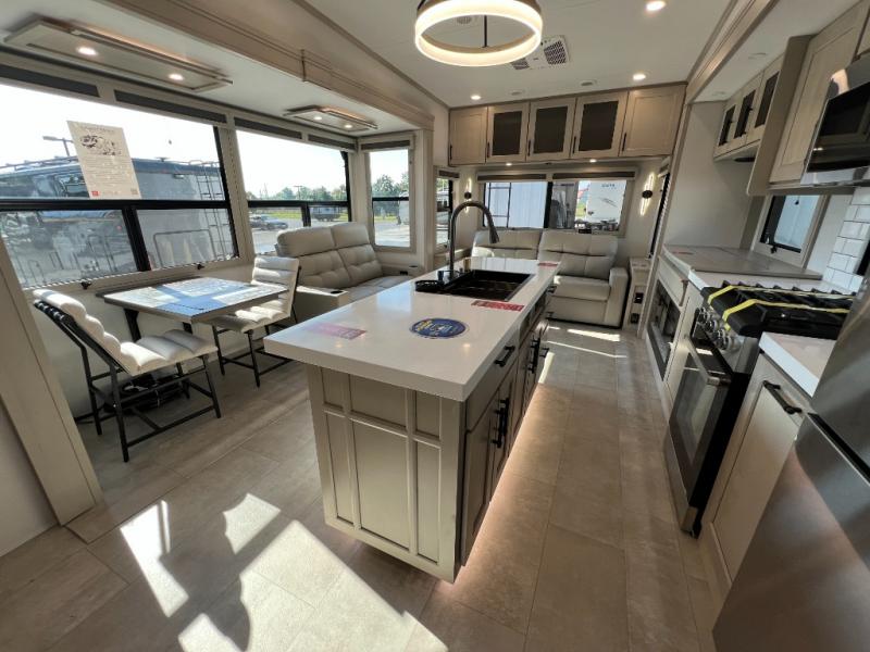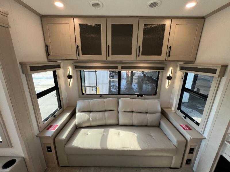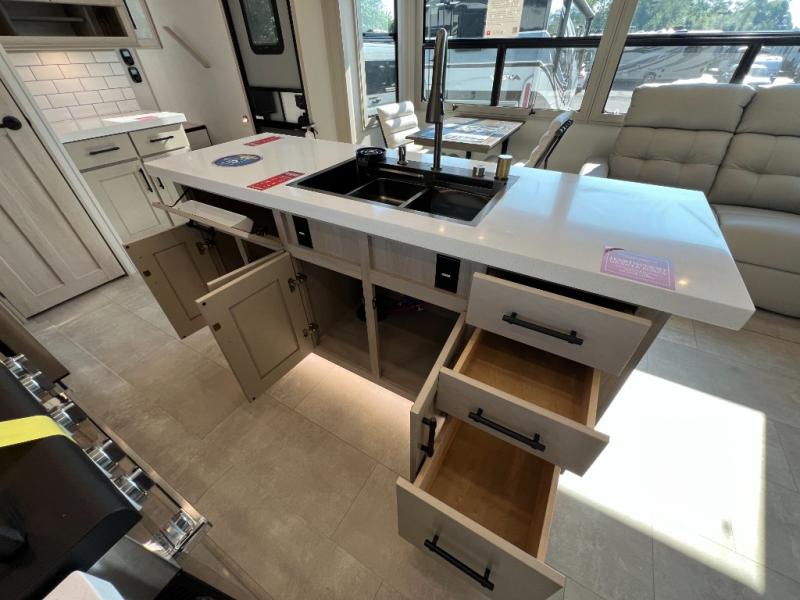 Are you looking to upgrade from a travel trailer to a fifth wheel? If so, this model will be perfect for you! Once you arrive at the campground, you can unload your gear from the pass-through storage, put out the two power awnings, then relax with a cold drink. Inside, you can kick your feet up on the theater seating, play a game at the free-standing dinette, or relax on the tri-fold sofa. The chef of your group will have a kitchen island with a Smart sink, dishwasher prep if you want the option to make cleaning up easier, plus a spacious 20 cu. ft. 12V refrigerator. There is also a built-in oven, plus a pantry and a hutch for storage galore! Having two bath sinks in the full bath is sure to be a big convenience when getting ready for bed, and the queen bed slide out in the front bedroom will provide a great night's rest. You will also find a front wardrobe, a slide top dresser, plus washer/dryer prep!