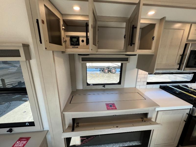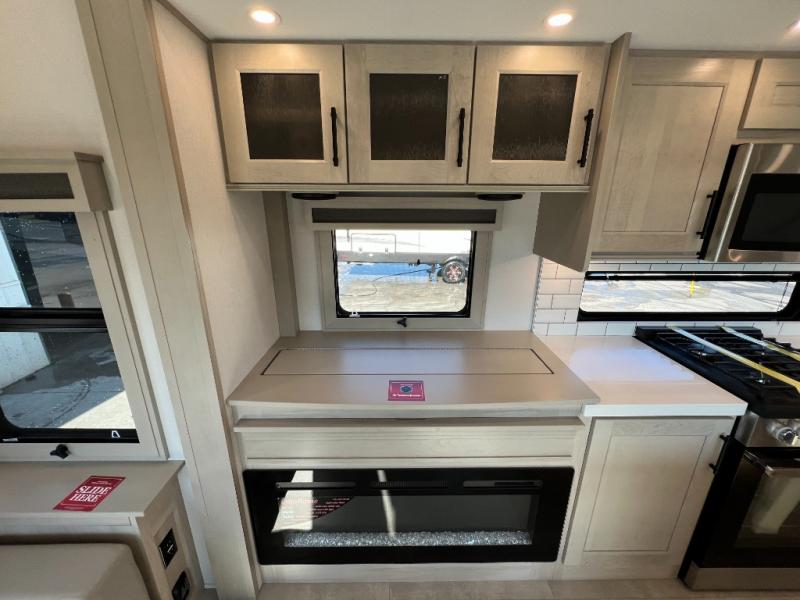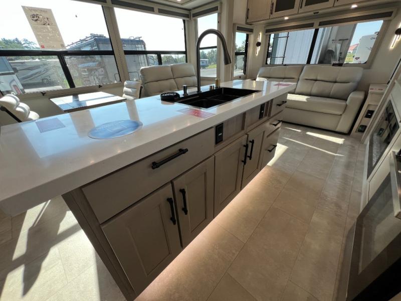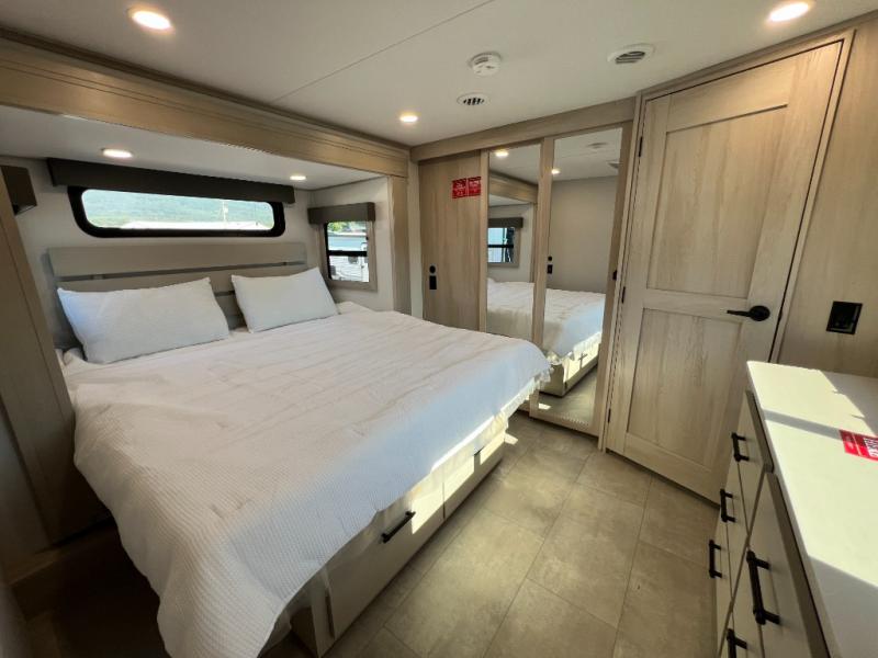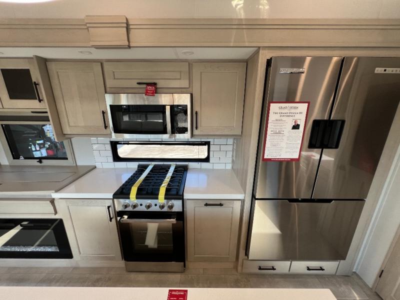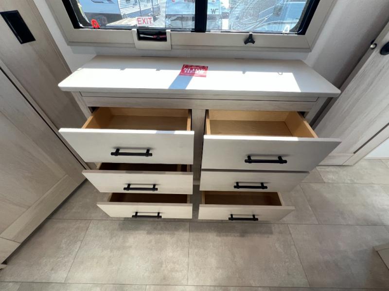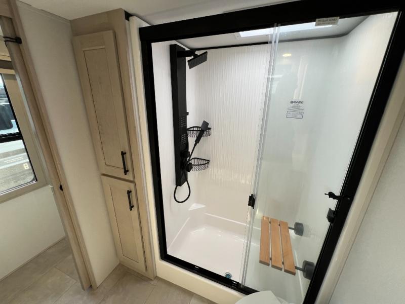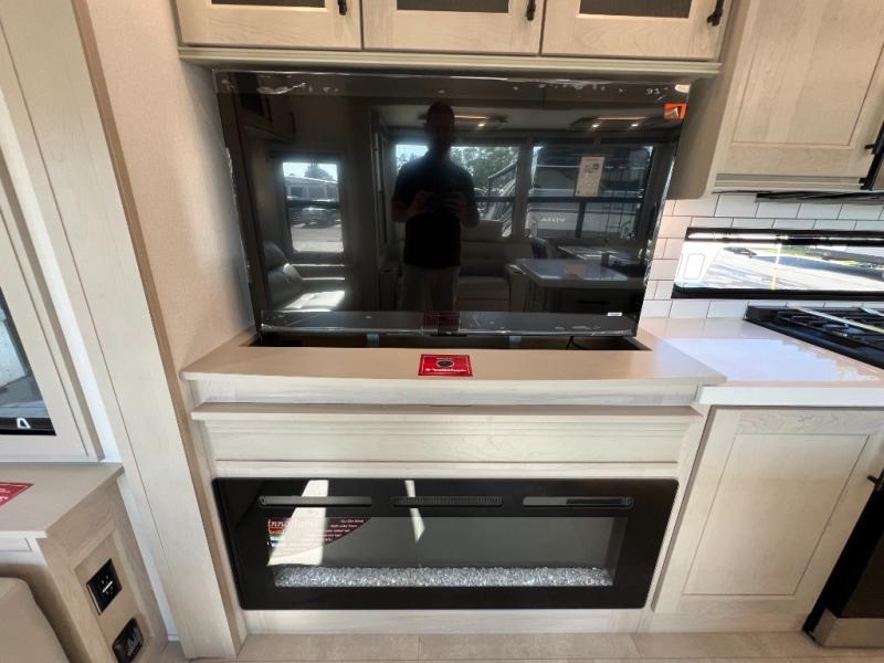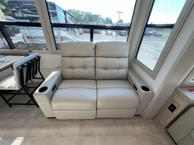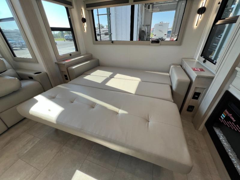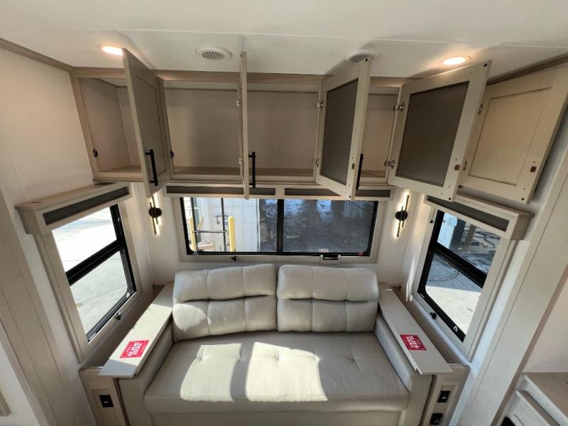 Are you looking to upgrade from a travel trailer to a fifth wheel? If so, this model will be perfect for you! Once you arrive at the campground, you can unload your gear from the pass-through storage, put out the two power awnings, then relax with a cold drink. Inside, you can kick your feet up on the theater seating, play a game at the free-standing dinette, or relax on the tri-fold sofa. The chef of your group will have a kitchen island with a Smart sink, dishwasher prep if you want the option to make cleaning up easier, plus a spacious 20 cu. ft. 12V refrigerator. There is also a built-in oven, plus a pantry and a hutch for storage galore! Having two bath sinks in the full bath is sure to be a big convenience when getting ready for bed, and the queen bed slide out in the front bedroom will provide a great night's rest. You will also find a front wardrobe, a slide top dresser, plus washer/dryer prep!