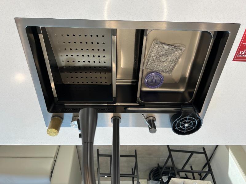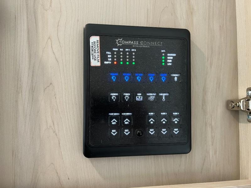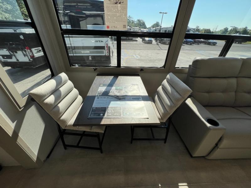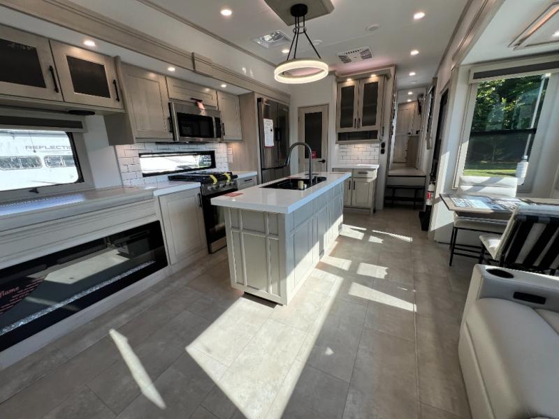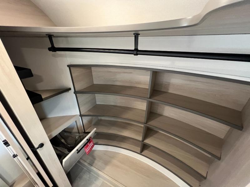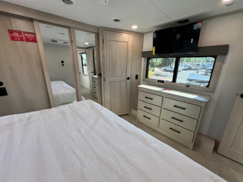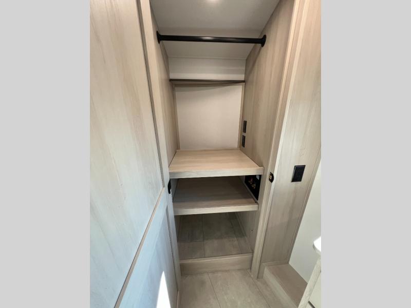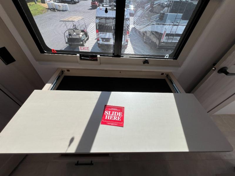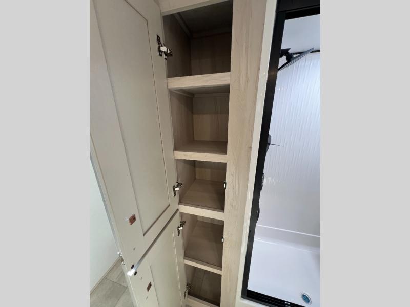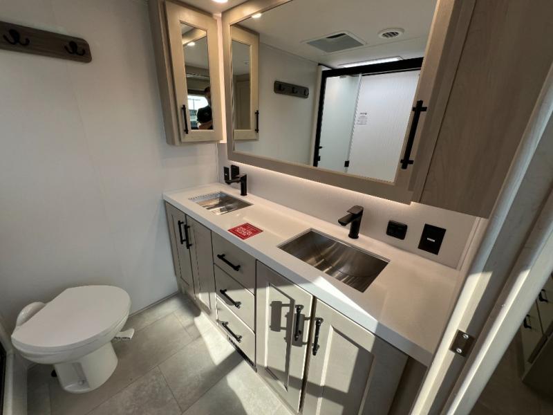 Are you looking to upgrade from a travel trailer to a fifth wheel? If so, this model will be perfect for you! Once you arrive at the campground, you can unload your gear from the pass-through storage, put out the two power awnings, then relax with a cold drink. Inside, you can kick your feet up on the theater seating, play a game at the free-standing dinette, or relax on the tri-fold sofa. The chef of your group will have a kitchen island with a Smart sink, dishwasher prep if you want the option to make cleaning up easier, plus a spacious 20 cu. ft. 12V refrigerator. There is also a built-in oven, plus a pantry and a hutch for storage galore! Having two bath sinks in the full bath is sure to be a big convenience when getting ready for bed, and the queen bed slide out in the front bedroom will provide a great night's rest. You will also find a front wardrobe, a slide top dresser, plus washer/dryer prep!