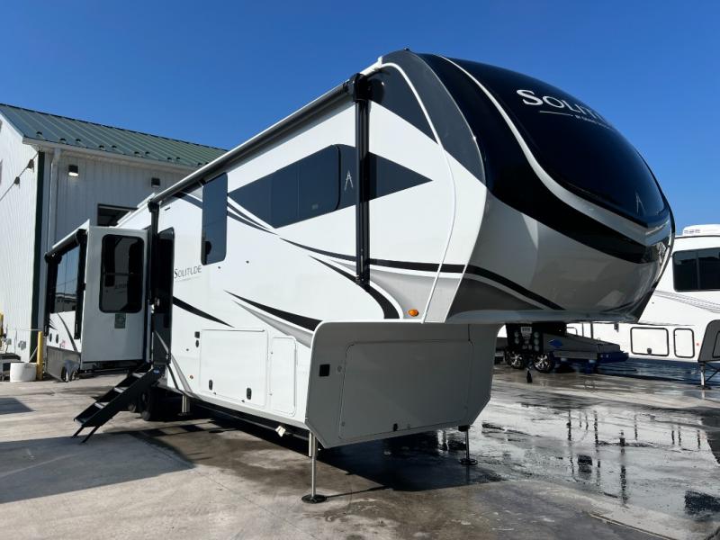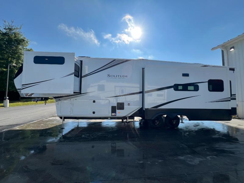 Each Solitude fifth wheel by Grand Design features a 101" wide-body construction, heavy duty 8,000 lb. axles, frameless tinted windows, and high-gloss gel coat sidewalls. You can camp year around thanks to the Weather-Tek Package that includes a 35K BTU high-capacity furnace, an all-in-one enclosed and heated utility center, and a fully enclosed underbelly with heated tanks and storage. Inside, you'll love the premium roller shades, hardwood cabinet doors, solid surface countertops, plus residential finishes throughout to make you truly feel at home. Each model also includes a MORryde CRE3000 suspension system, self adjusting brakes, and a MORryde pin box that will provide smooth towing from home to campground. Affordable luxury is possible with the Solitude fifth wheels; choose yours today!