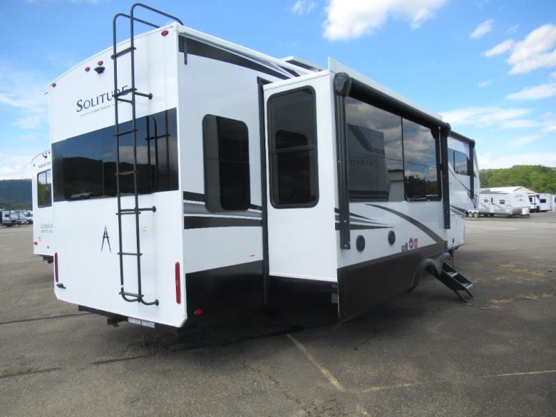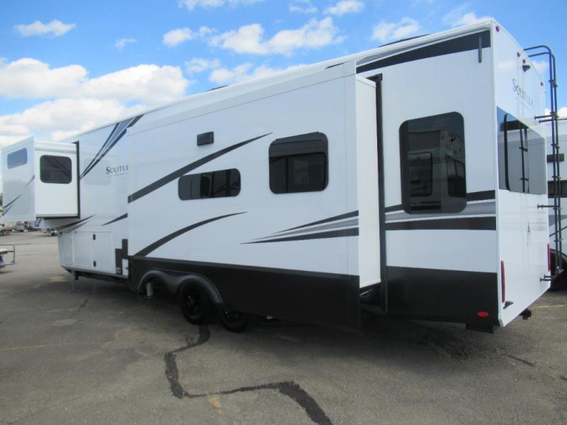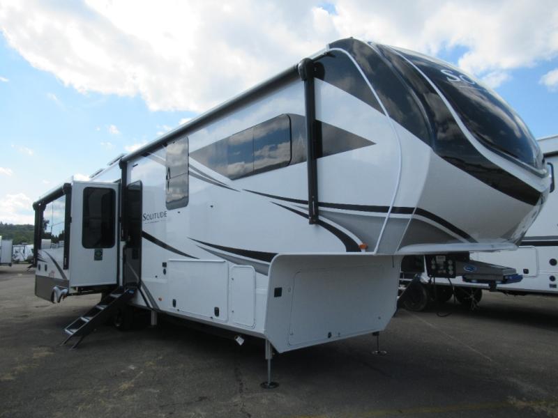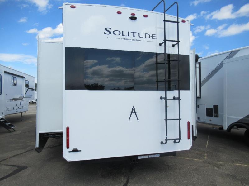 Each Solitude fifth wheel by Grand Design features a 101" wide-body construction, heavy duty 8,000 lb. axles, frameless tinted windows, and high-gloss gel coat sidewalls. You can camp year around thanks to the Weather-Tek Package that includes a 35K BTU high-capacity furnace, an all-in-one enclosed and heated utility center, and a fully enclosed underbelly with heated tanks and storage. Inside, you'll love the premium roller shades, hardwood cabinet doors, solid surface countertops, plus residential finishes throughout to make you truly feel at home. Each model also includes a MORryde CRE3000 suspension system, self adjusting brakes, and a MORryde pin box that will provide smooth towing from home to campground. Affordable luxury is possible with the Solitude fifth wheels; choose yours today!