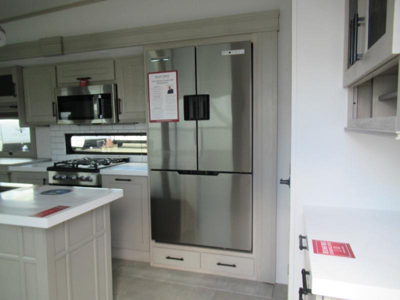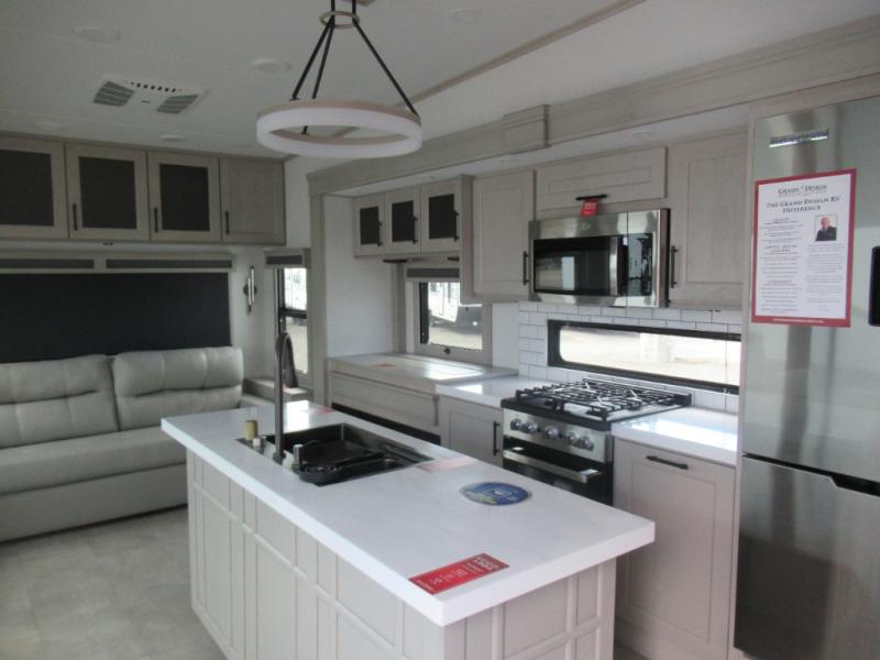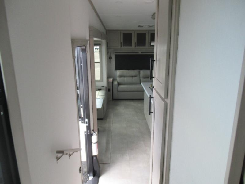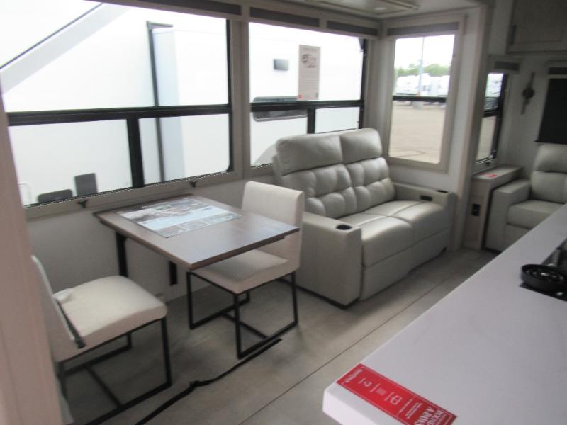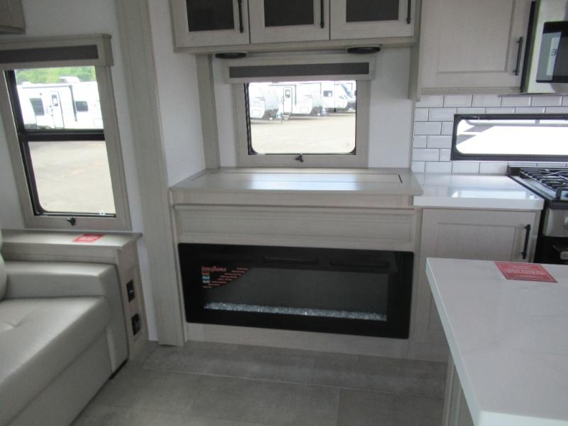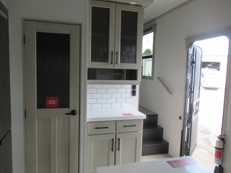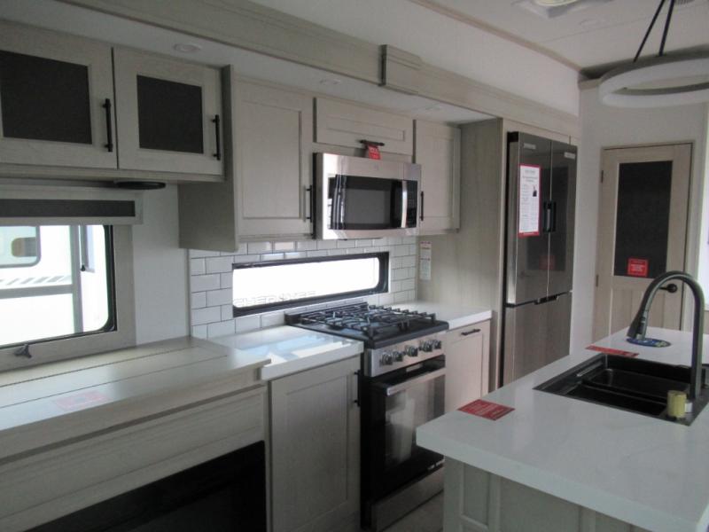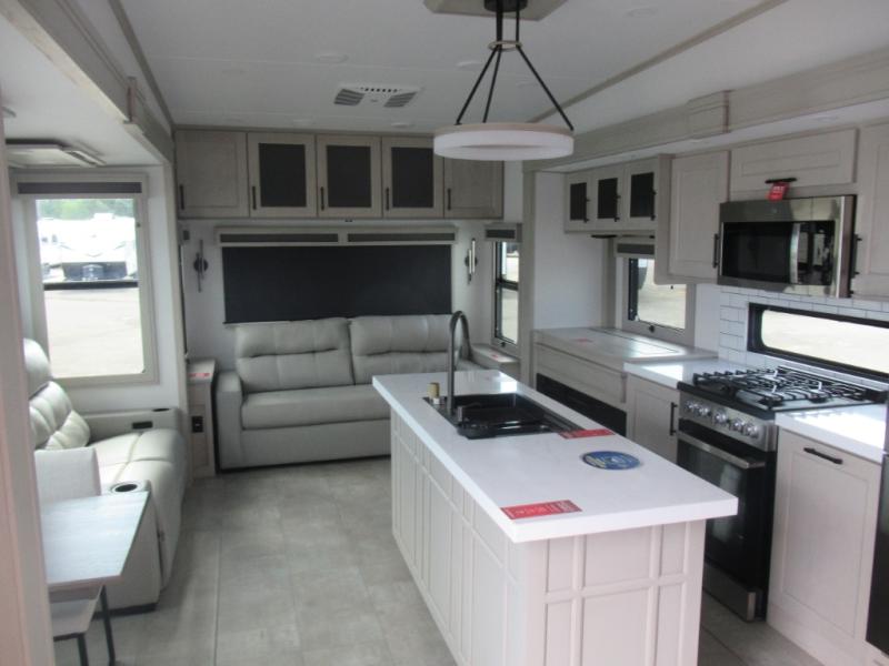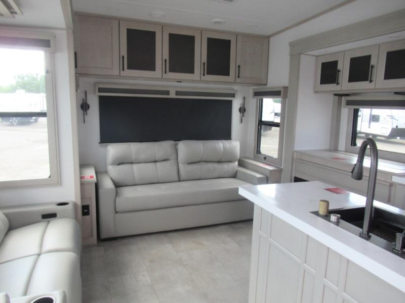 Are you looking to upgrade from a travel trailer to a fifth wheel? If so, this model will be perfect for you! Once you arrive at the campground, you can unload your gear from the pass-through storage, put out the two power awnings, then relax with a cold drink. Inside, you can kick your feet up on the theater seating, play a game at the free-standing dinette, or relax on the tri-fold sofa. The chef of your group will have a kitchen island with a Smart sink, dishwasher prep if you want the option to make cleaning up easier, plus a spacious 20 cu. ft. 12V refrigerator. There is also a built-in oven, plus a pantry and a hutch for storage galore! Having two bath sinks in the full bath is sure to be a big convenience when getting ready for bed, and the queen bed slide out in the front bedroom will provide a great night's rest. You will also find a front wardrobe, a slide top dresser, plus washer/dryer prep!