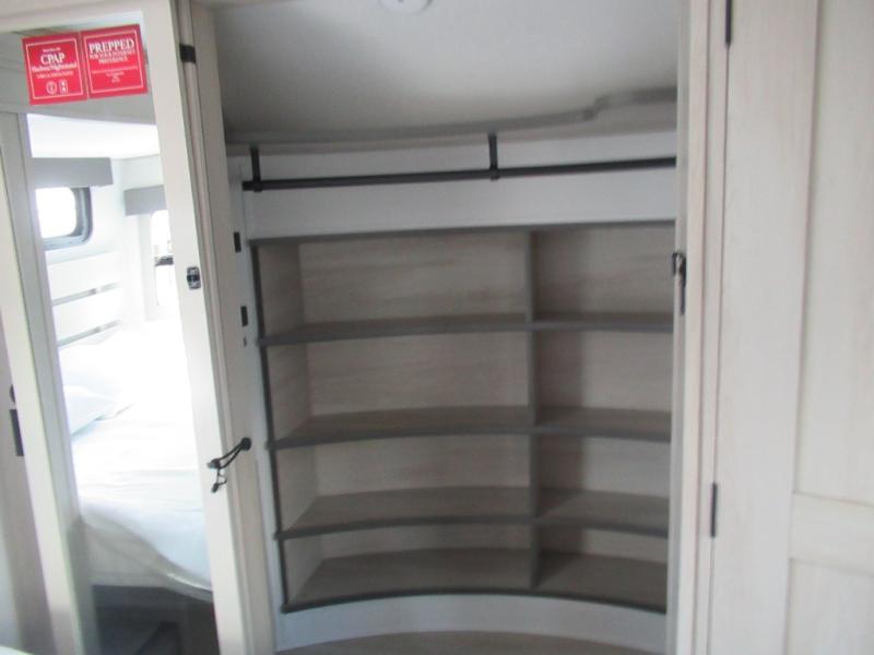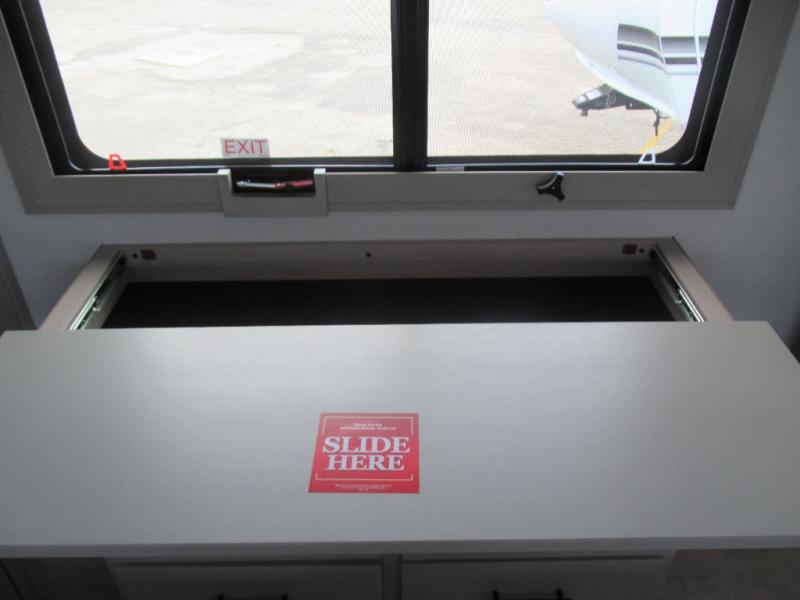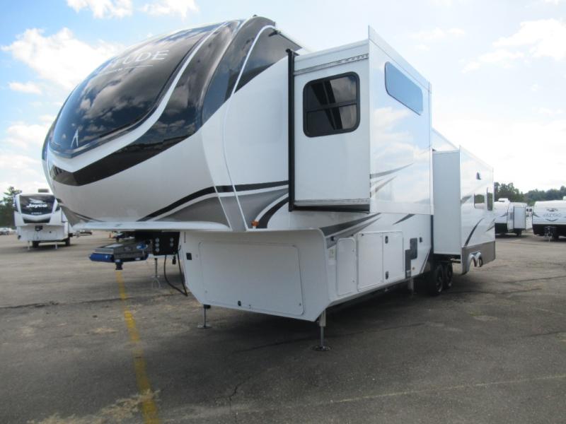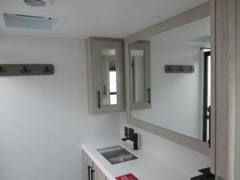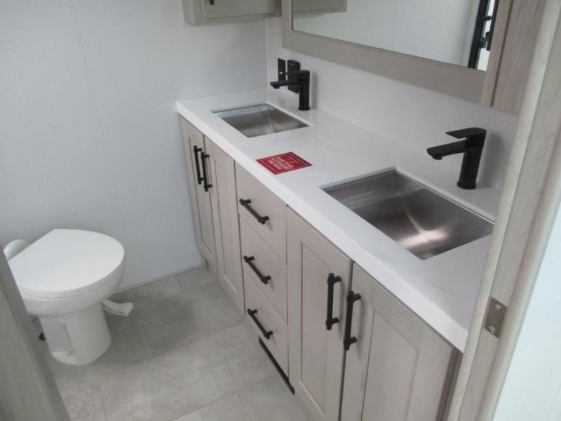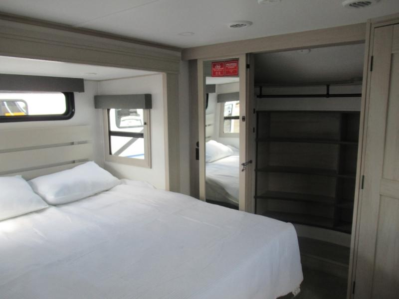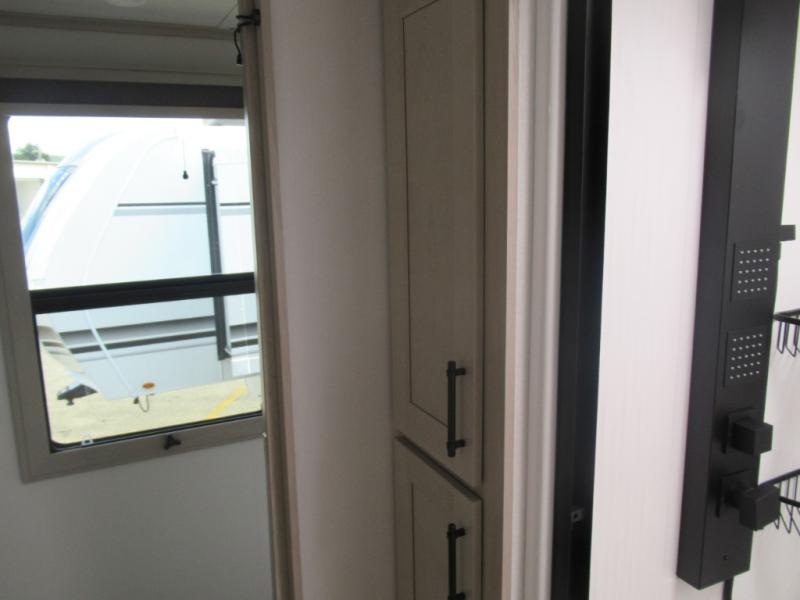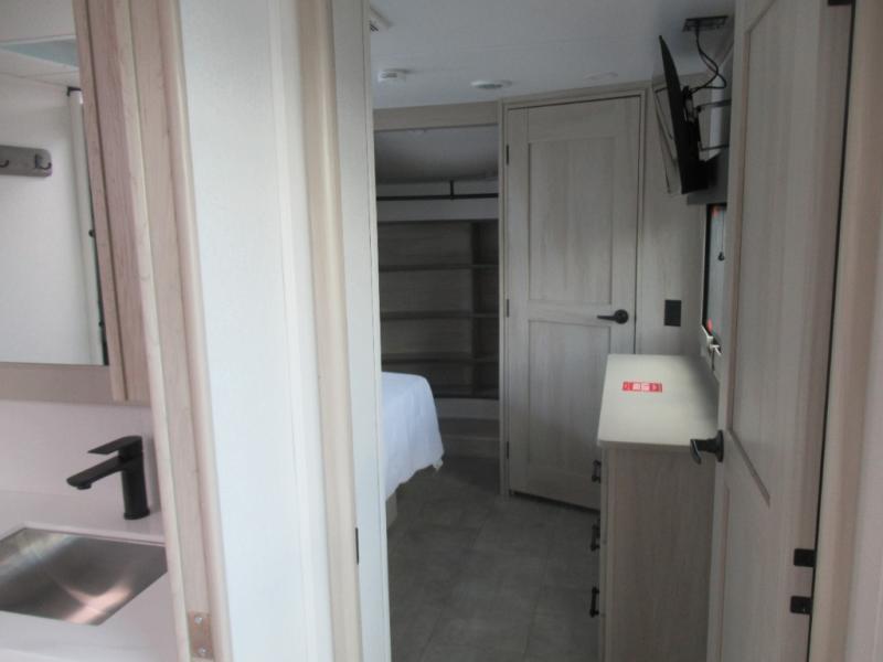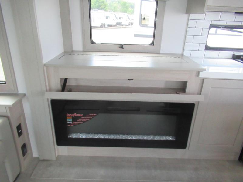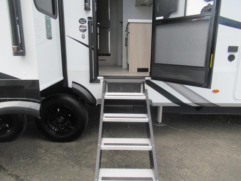 Are you looking to upgrade from a travel trailer to a fifth wheel? If so, this model will be perfect for you! Once you arrive at the campground, you can unload your gear from the pass-through storage, put out the two power awnings, then relax with a cold drink. Inside, you can kick your feet up on the theater seating, play a game at the free-standing dinette, or relax on the tri-fold sofa. The chef of your group will have a kitchen island with a Smart sink, dishwasher prep if you want the option to make cleaning up easier, plus a spacious 20 cu. ft. 12V refrigerator. There is also a built-in oven, plus a pantry and a hutch for storage galore! Having two bath sinks in the full bath is sure to be a big convenience when getting ready for bed, and the queen bed slide out in the front bedroom will provide a great night's rest. You will also find a front wardrobe, a slide top dresser, plus washer/dryer prep!