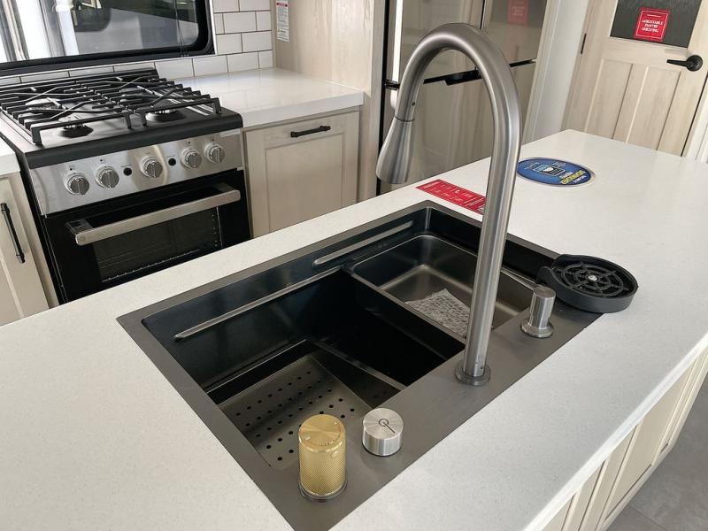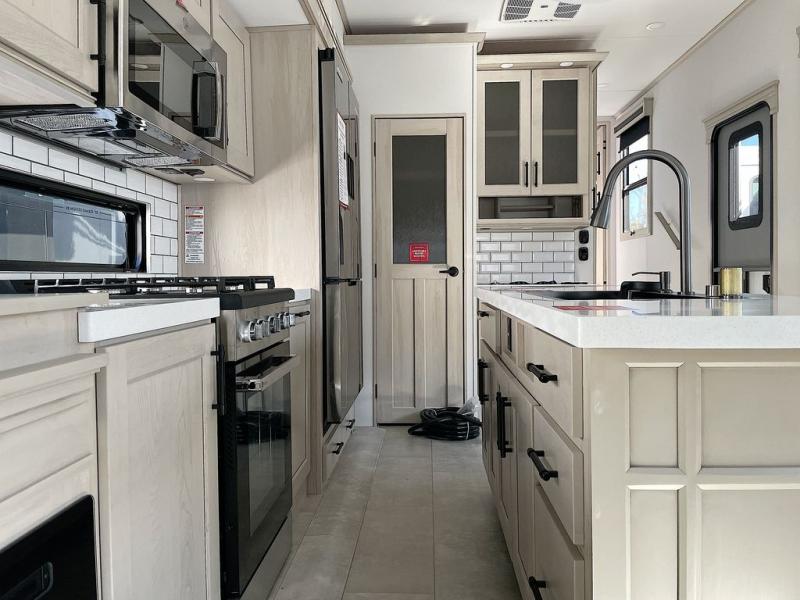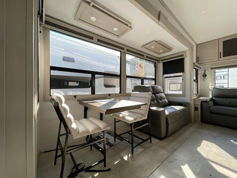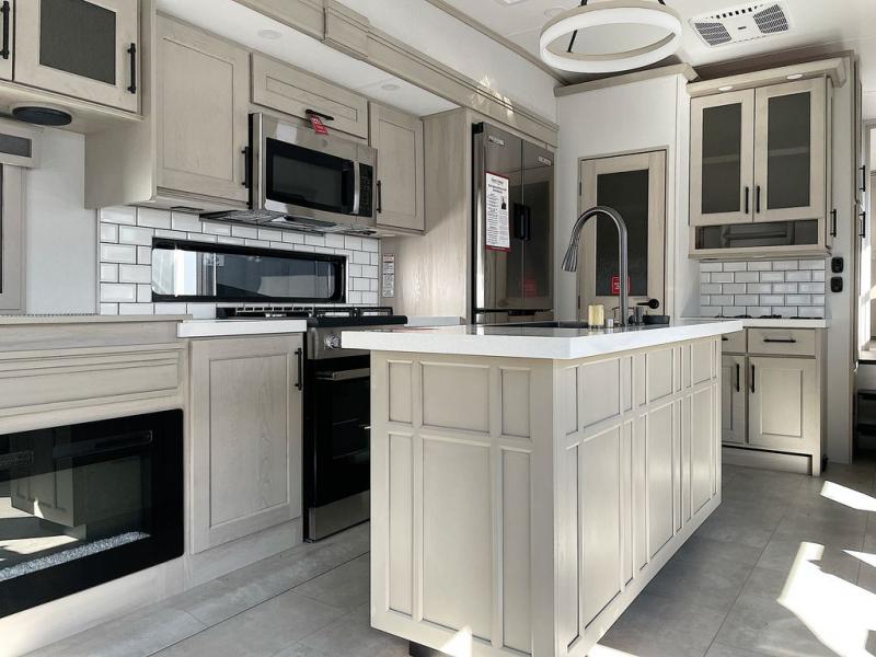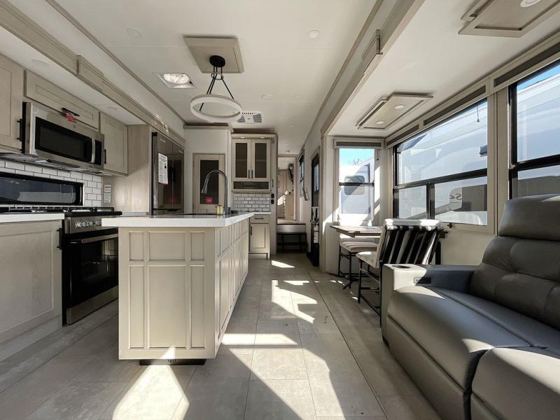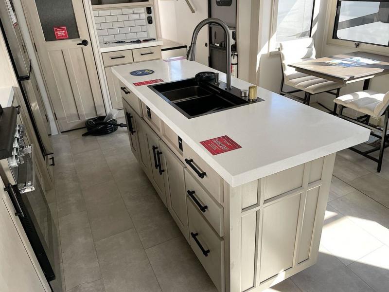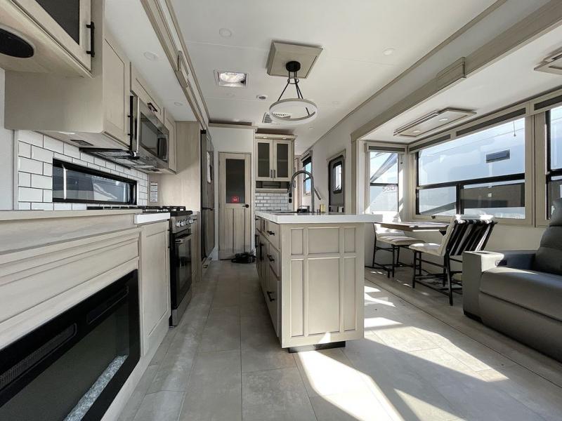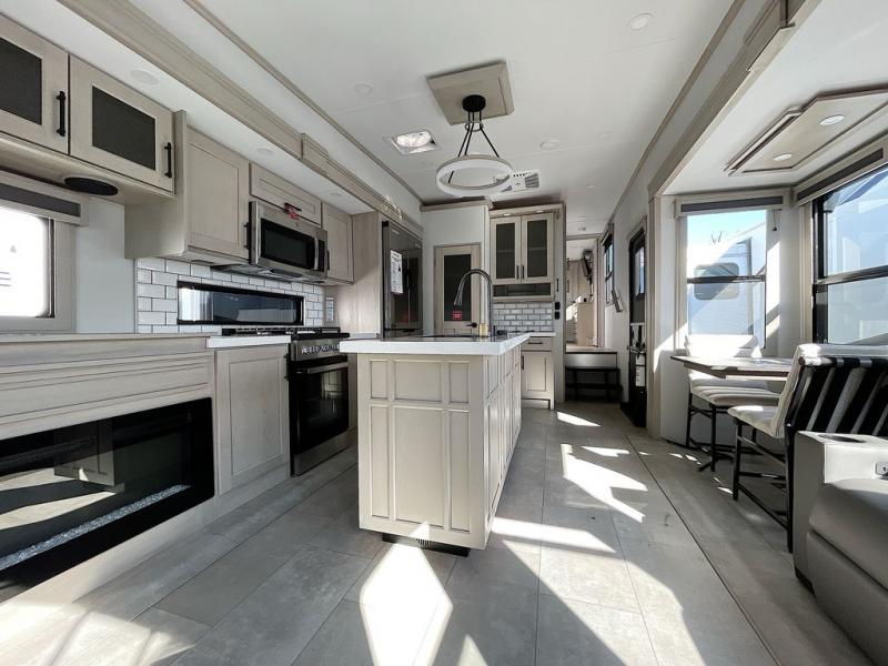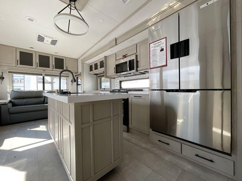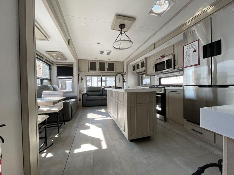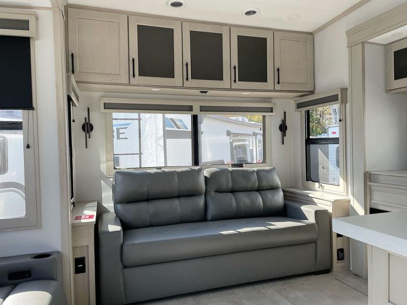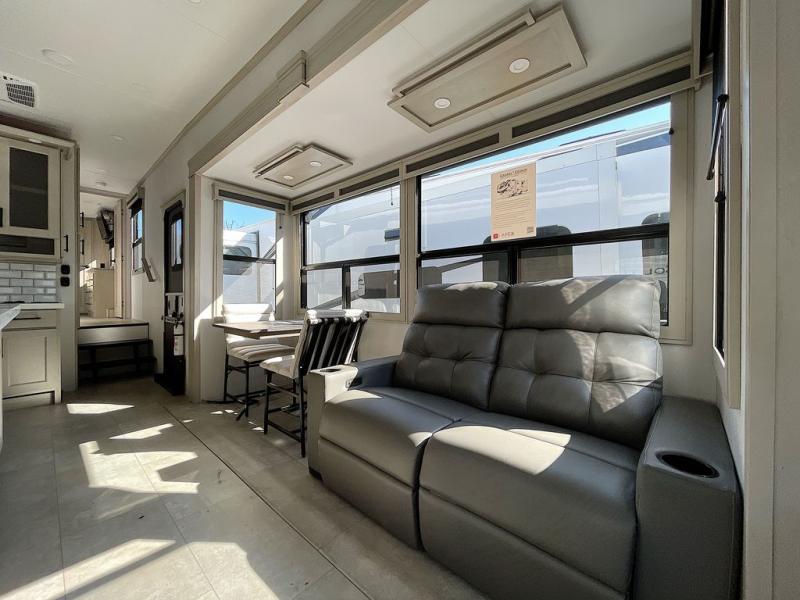 Are you looking to upgrade from a travel trailer to a fifth wheel? If so, this model will be perfect for you! Once you arrive at the campground, you can unload your gear from the pass-through storage, put out the two power awnings, then relax with a cold drink. Inside, you can kick your feet up on the theater seating, play a game at the free-standing dinette, or relax on the tri-fold sofa. The chef of your group will have a kitchen island with a Smart sink, dishwasher prep if you want the option to make cleaning up easier, plus a spacious 20 cu. ft. 12V refrigerator. There is also a built-in oven, plus a pantry and a hutch for storage galore! Having two bath sinks in the full bath is sure to be a big convenience when getting ready for bed, and the queen bed slide out in the front bedroom will provide a great night's rest. You will also find a front wardrobe, a slide top dresser, plus washer/dryer prep!