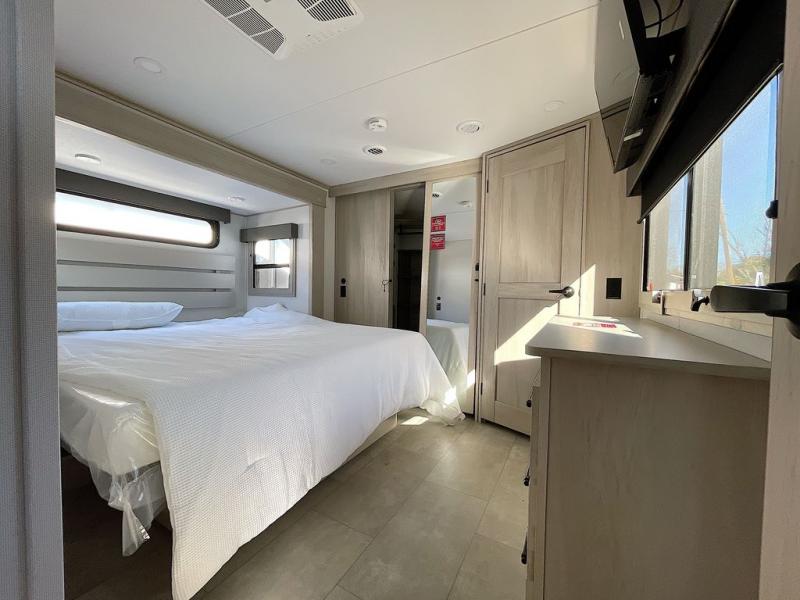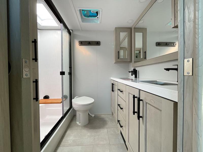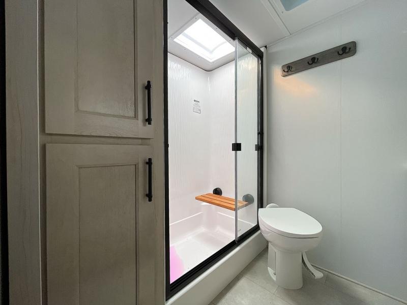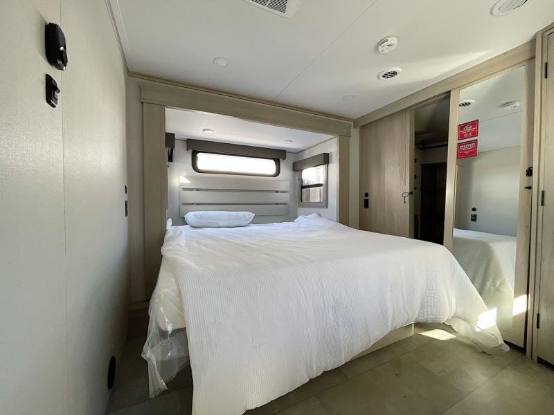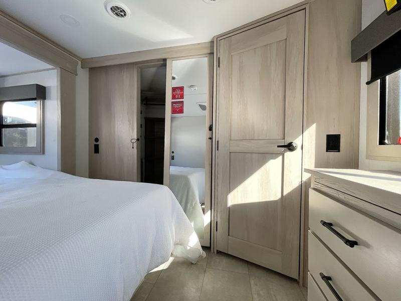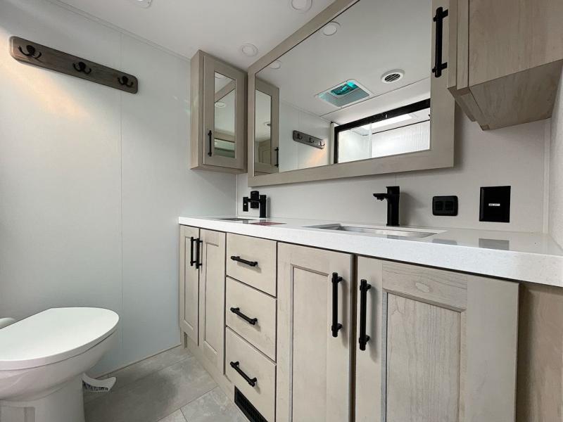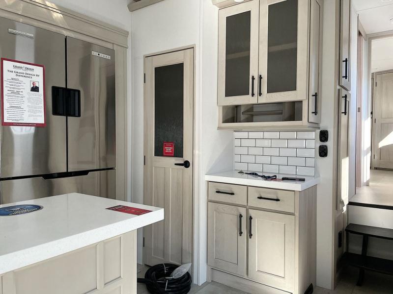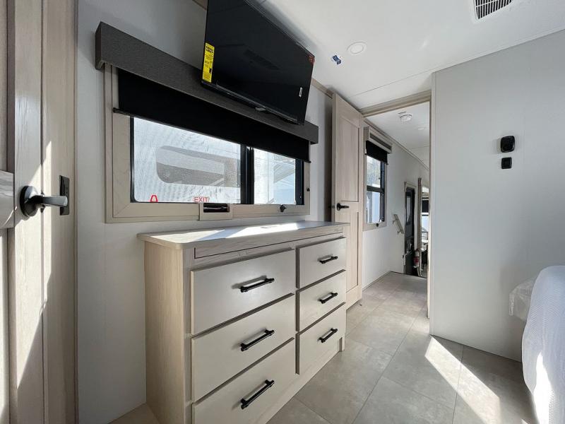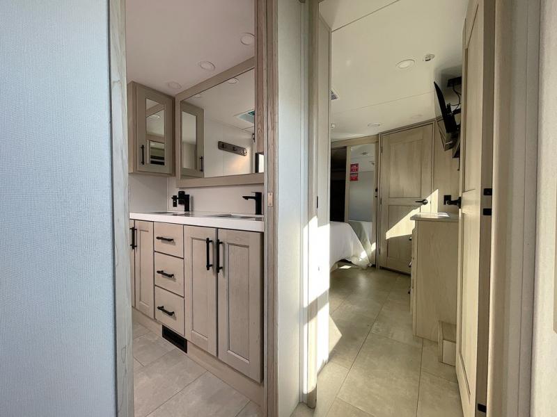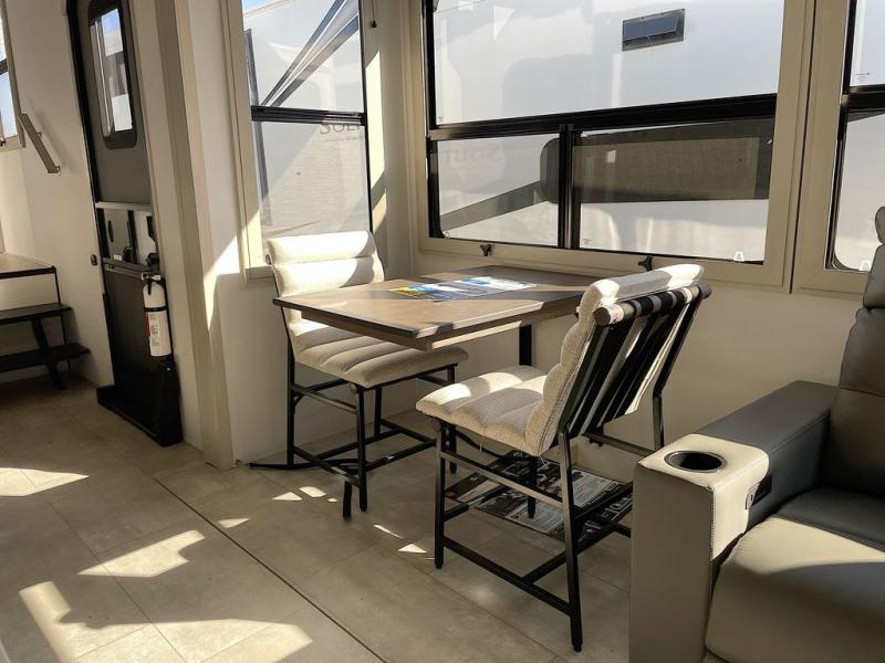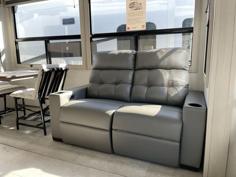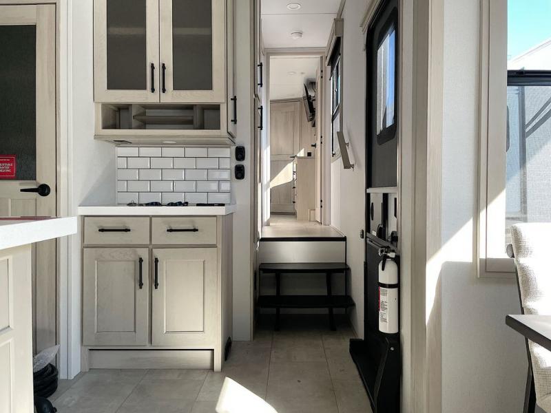 Are you looking to upgrade from a travel trailer to a fifth wheel? If so, this model will be perfect for you! Once you arrive at the campground, you can unload your gear from the pass-through storage, put out the two power awnings, then relax with a cold drink. Inside, you can kick your feet up on the theater seating, play a game at the free-standing dinette, or relax on the tri-fold sofa. The chef of your group will have a kitchen island with a Smart sink, dishwasher prep if you want the option to make cleaning up easier, plus a spacious 20 cu. ft. 12V refrigerator. There is also a built-in oven, plus a pantry and a hutch for storage galore! Having two bath sinks in the full bath is sure to be a big convenience when getting ready for bed, and the queen bed slide out in the front bedroom will provide a great night's rest. You will also find a front wardrobe, a slide top dresser, plus washer/dryer prep!