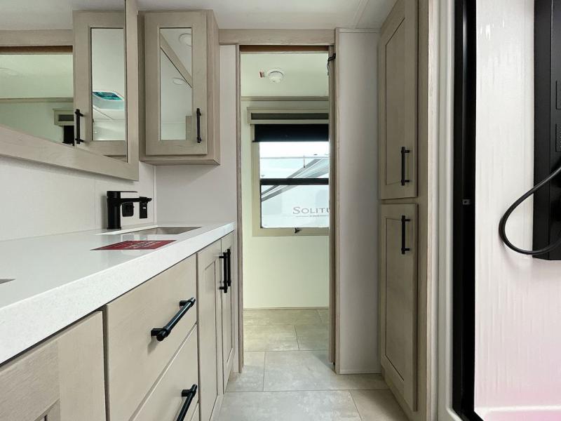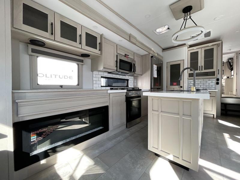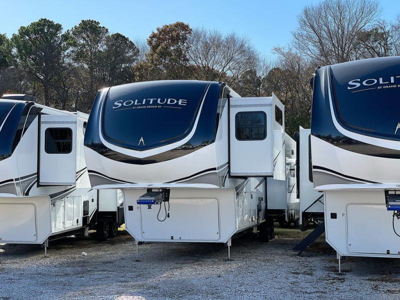 Each Solitude fifth wheel by Grand Design features a 101" wide-body construction, heavy duty 8,000 lb. axles, frameless tinted windows, and high-gloss gel coat sidewalls. You can camp year around thanks to the Weather-Tek Package that includes a 35K BTU high-capacity furnace, an all-in-one enclosed and heated utility center, and a fully enclosed underbelly with heated tanks and storage. Inside, you'll love the premium roller shades, hardwood cabinet doors, solid surface countertops, plus residential finishes throughout to make you truly feel at home. Each model also includes a MORryde CRE3000 suspension system, self adjusting brakes, and a MORryde pin box that will provide smooth towing from home to campground. Affordable luxury is possible with the Solitude fifth wheels; choose yours today!