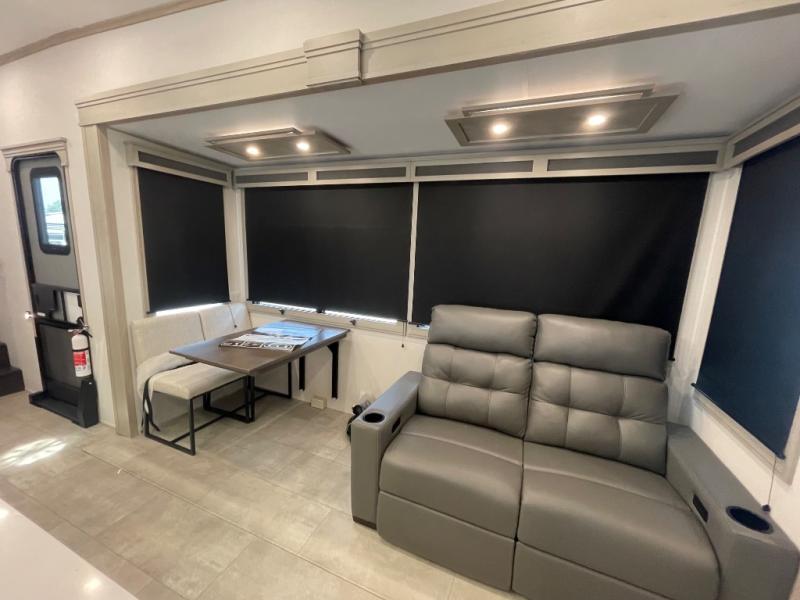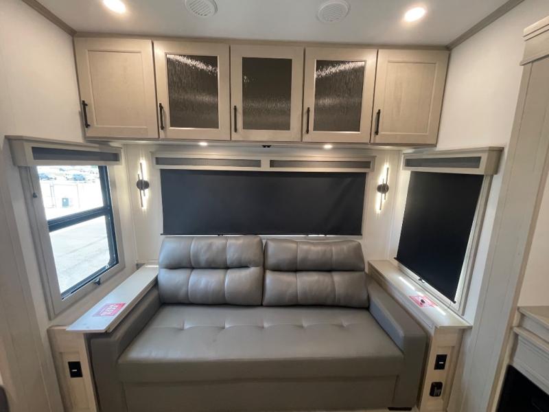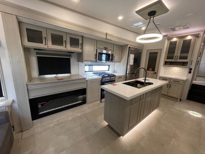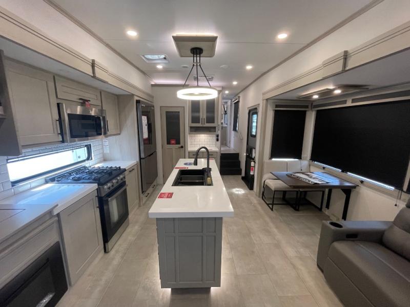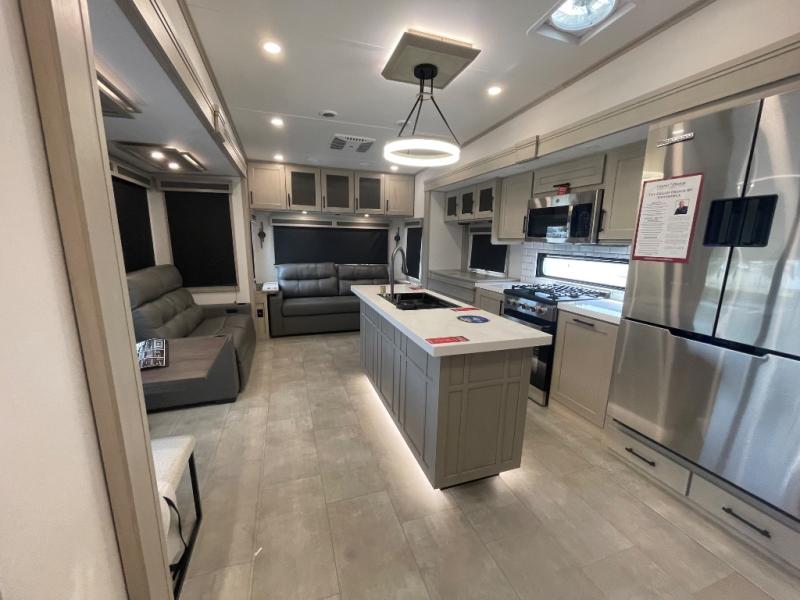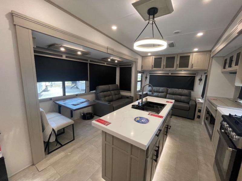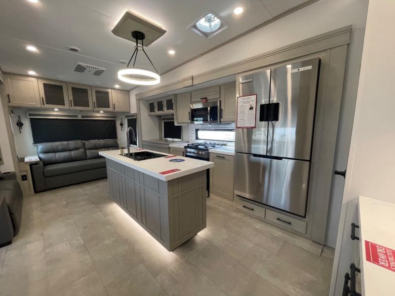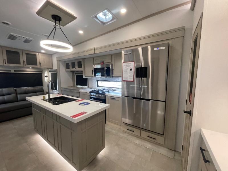 Are you looking to upgrade from a travel trailer to a fifth wheel? If so, this model will be perfect for you! Once you arrive at the campground, you can unload your gear from the pass-through storage, put out the two power awnings, then relax with a cold drink. Inside, you can kick your feet up on the theater seating, play a game at the free-standing dinette, or relax on the tri-fold sofa. The chef of your group will have a kitchen island with a Smart sink, dishwasher prep if you want the option to make cleaning up easier, plus a spacious 20 cu. ft. 12V refrigerator. There is also a built-in oven, plus a pantry and a hutch for storage galore! Having two bath sinks in the full bath is sure to be a big convenience when getting ready for bed, and the queen bed slide out in the front bedroom will provide a great night's rest. You will also find a front wardrobe, a slide top dresser, plus washer/dryer prep!